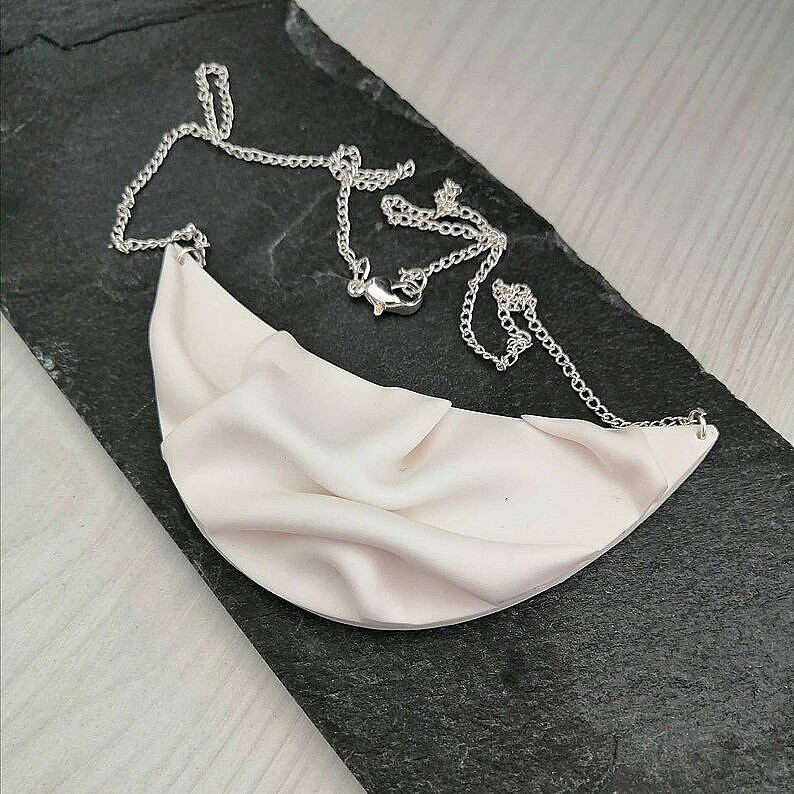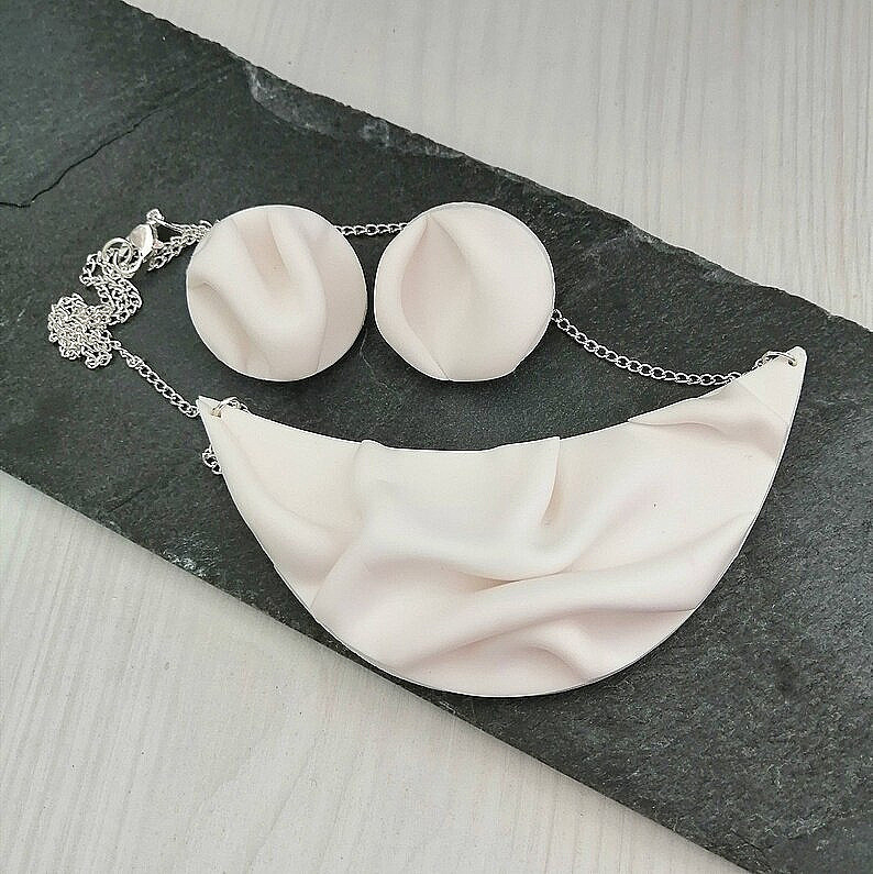 Бяло изящно колие, изаботено от полимерна глина. - Дължина на колието: 50 см. - Размер на белия елемент: 9х3.5 см. *Обеците от снимката не са включени и могат да бъдат закупени отделно.