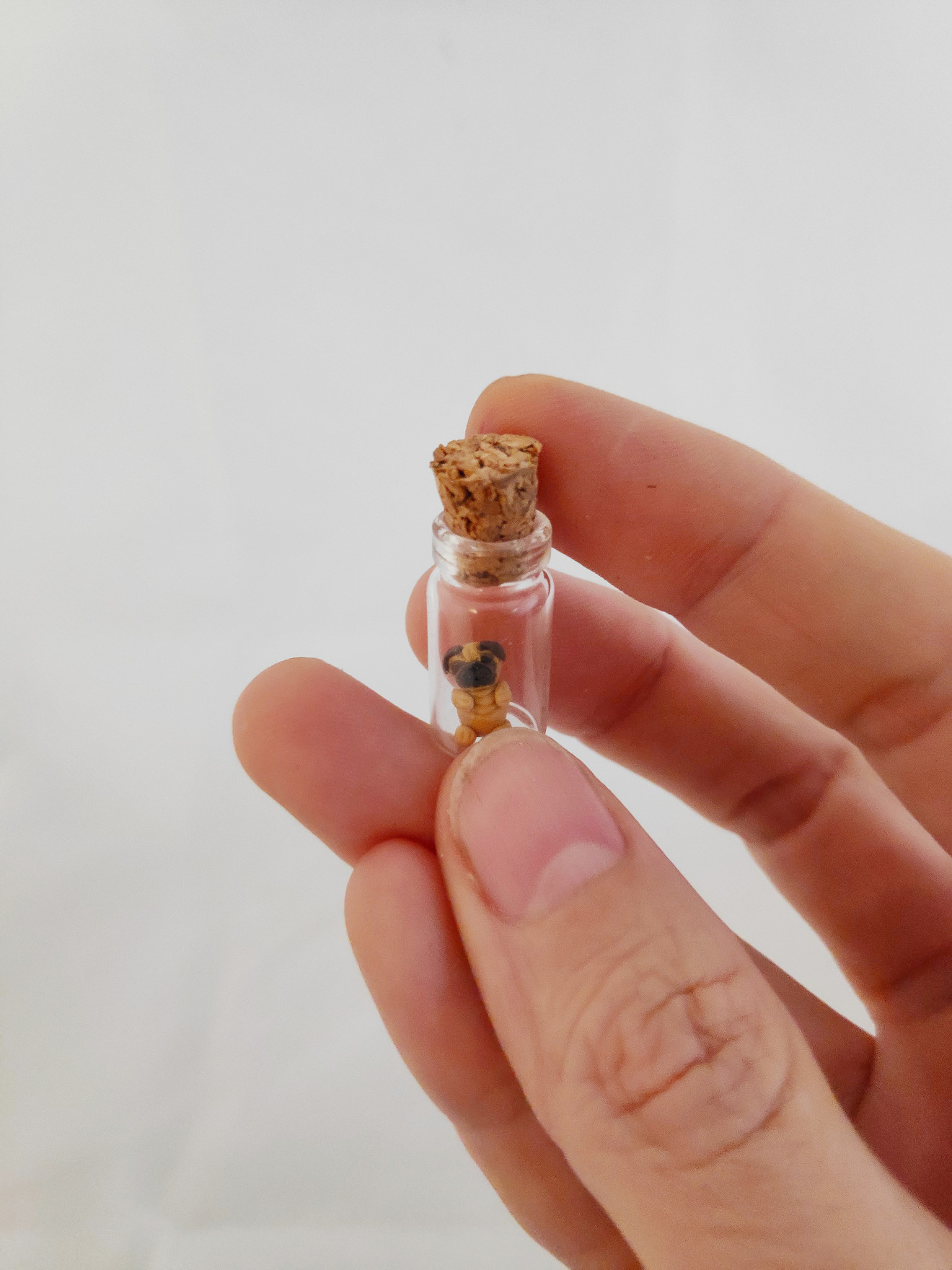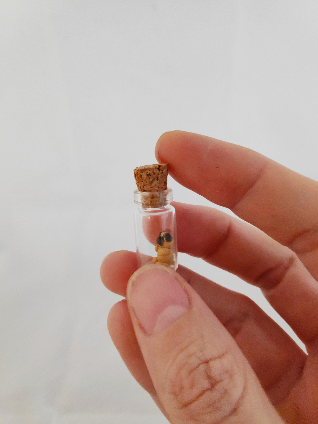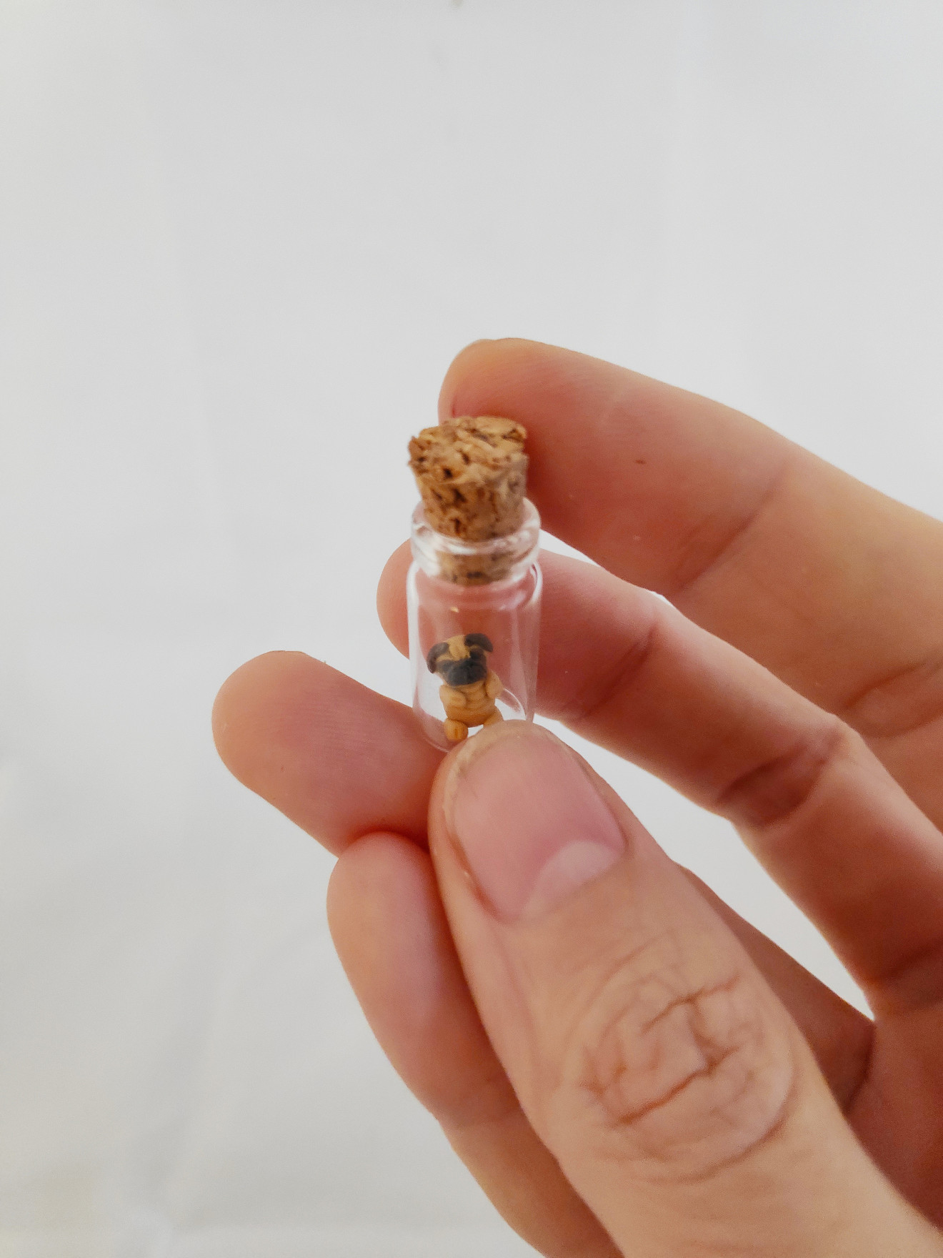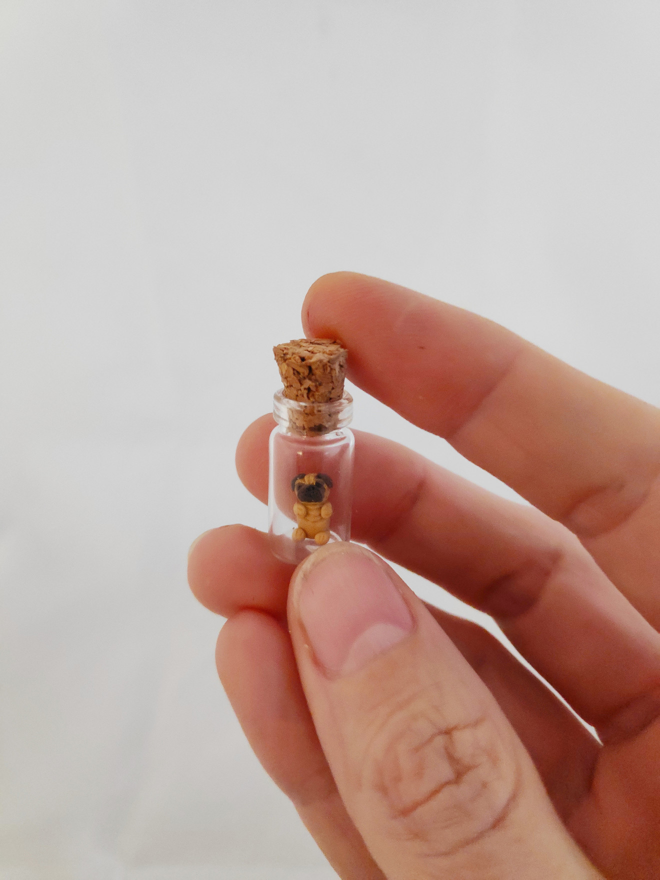 Миниатюрно, но изключително сладко куче мопс в бурканче, високо едва 1.2см. При поръчка, фигурката може да пристигне при Вас с шнур, под формата на Миниатюрн #колие, като в такъв случай, за повече сигурност, тапата е залепена за бурканчето и фигурката не може да се извади. Миниатюрите не са подходящи за деца под 6-7г.