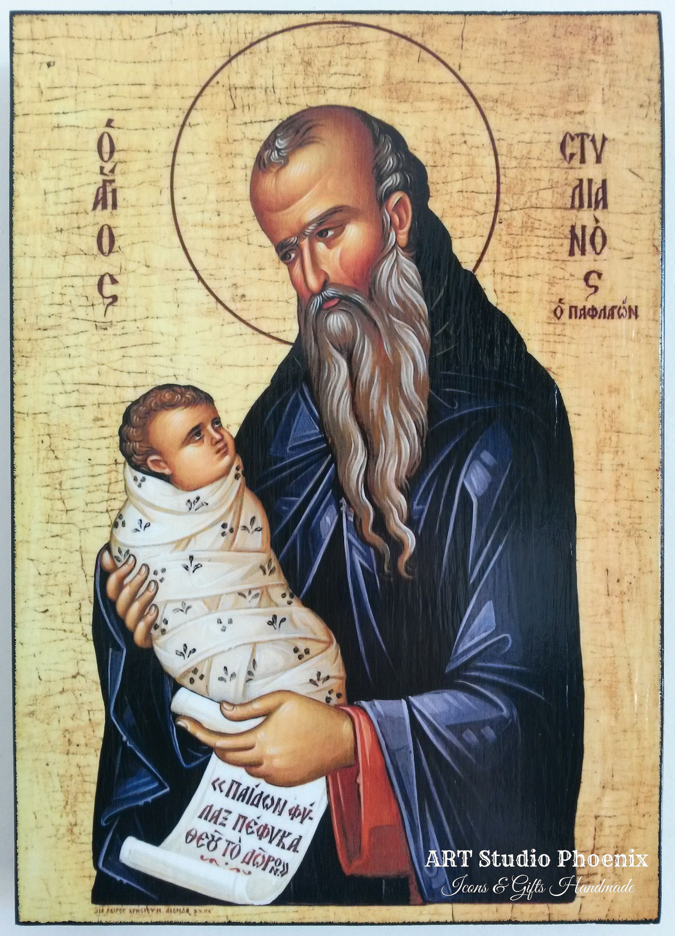 Репродукция на икона Свети Стилиян Детепазител, техника декупаж върху дърво. Размери: 21х15х1,8см. Цена: 50лв. 11х8х1,8см. Цена: 20лв. Използвани материали: дърво, лак, патина. Изработваме икони и по поръчка. Ако в момента не е налична някоя от показаните икони, можете да поръчате, като времето за изработка е 3 - 5 дни или в зависимост от заетостта с поети заявки. РАЗГЛЕДАЙТЕ И ДРУГИТЕ НИ ОБЯВИ, ако търсената от вас икона на даден светец или библейска сцена не е в обявите ни, можете да направите запитване за изработка! За да направите своята поръчка или запитване, обадете се на телефон: 0897536570 или оставете съобщение в платформата на Handmasters.bg. Необходими данни за поръчка: вашите имена, телефон, населено място, офис на Еконт или личен адрес. Заявените поръчки изпращамe с куриерска фирма Еконт. Приятно пазаруване! #icon #icons #icona #iconi #ikona #ikoni #светистилиян #празник #подарък #кръщене #кръстници #сватба #кумове #именден #рожденден #юбилей #годишнина #икона #икони