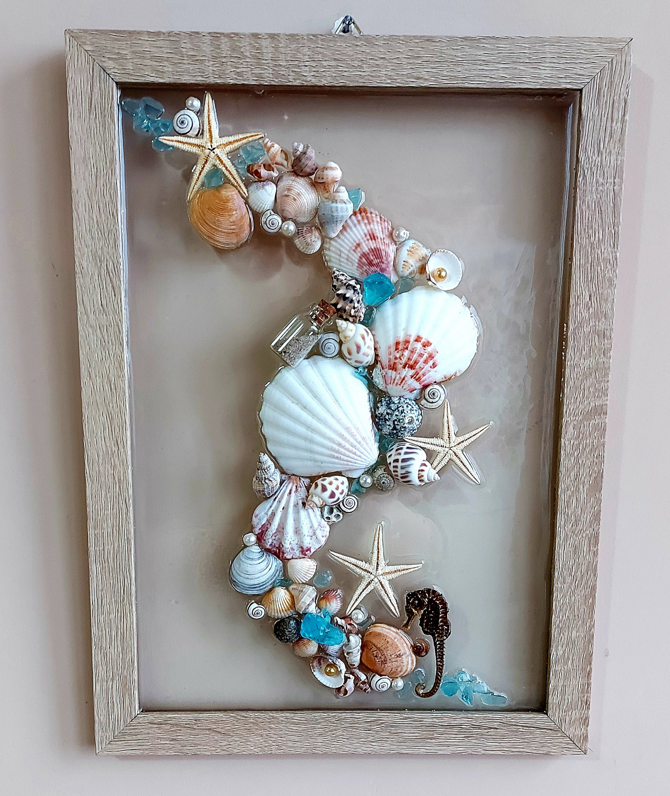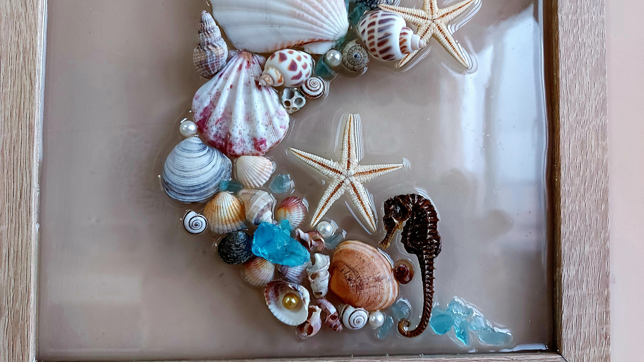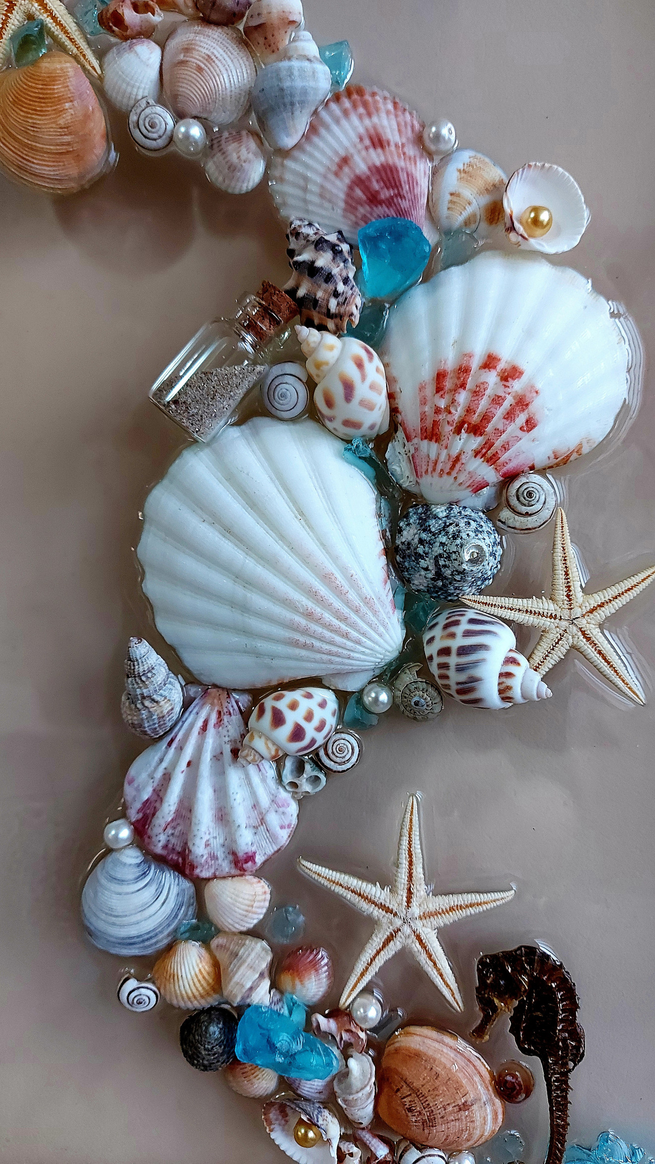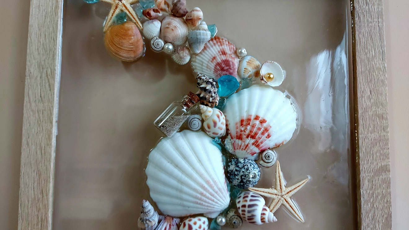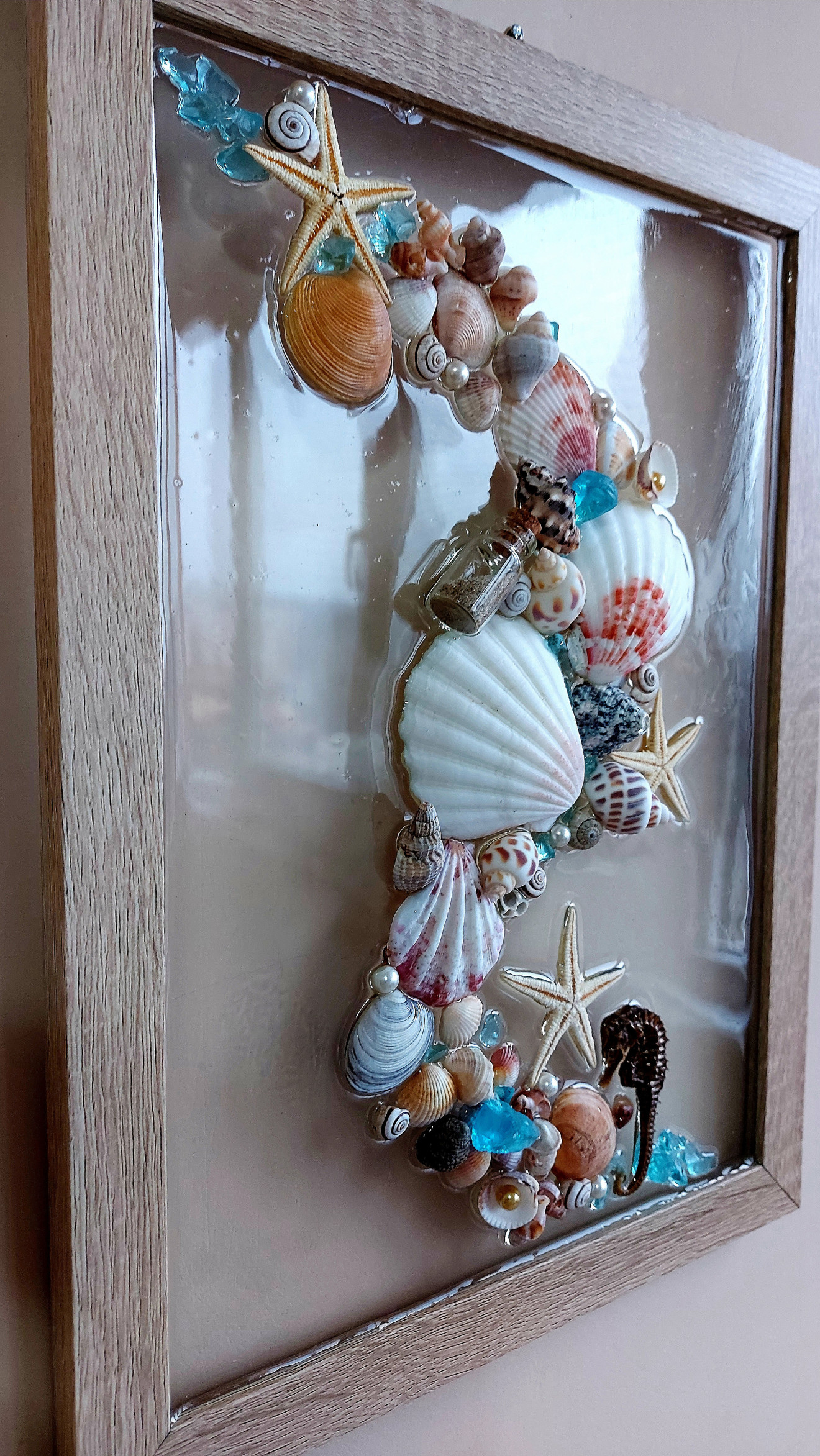 Стъклена основа с размер 33/24 см. Декорация с епоксидна смола и морски раковини.