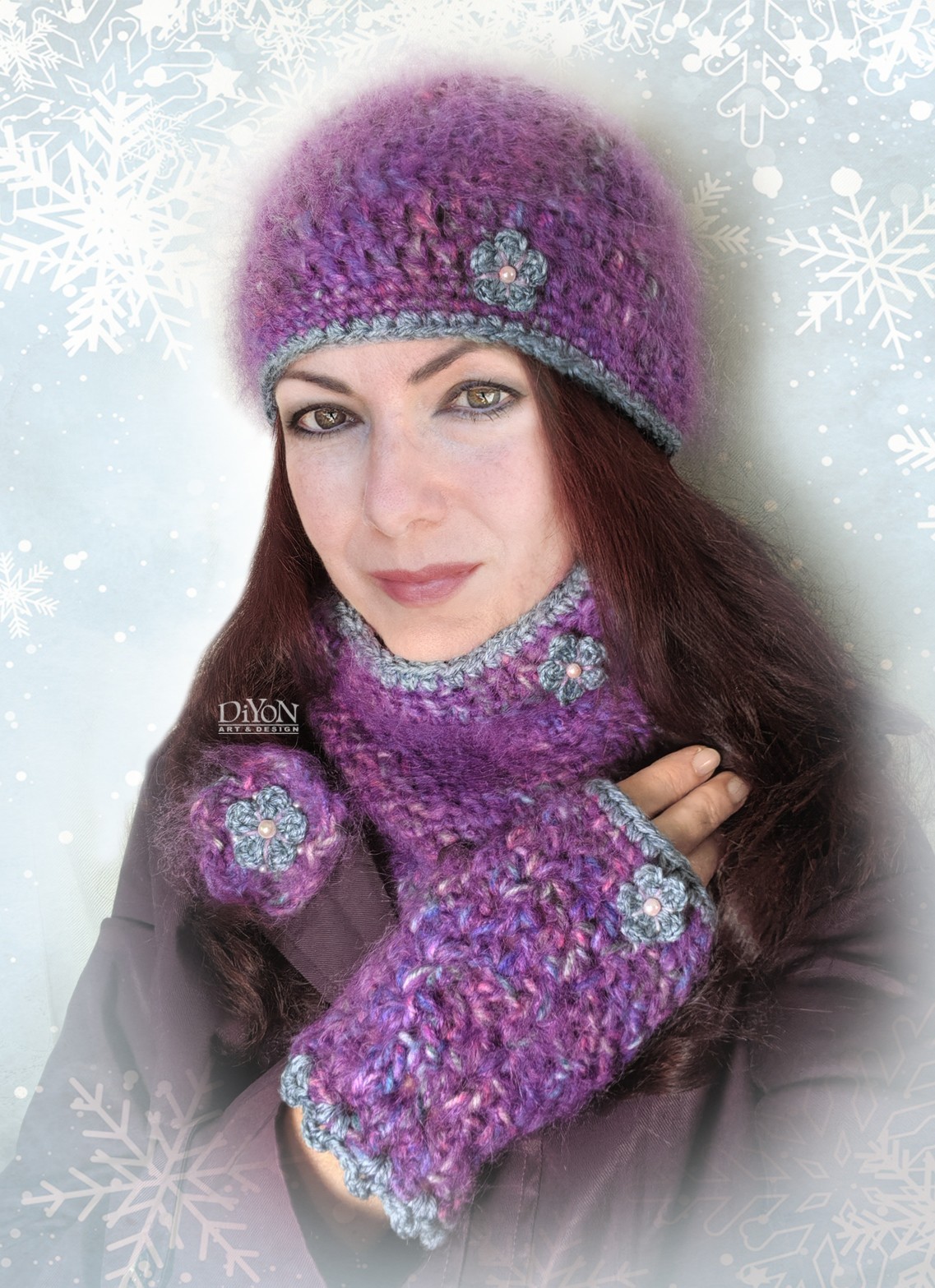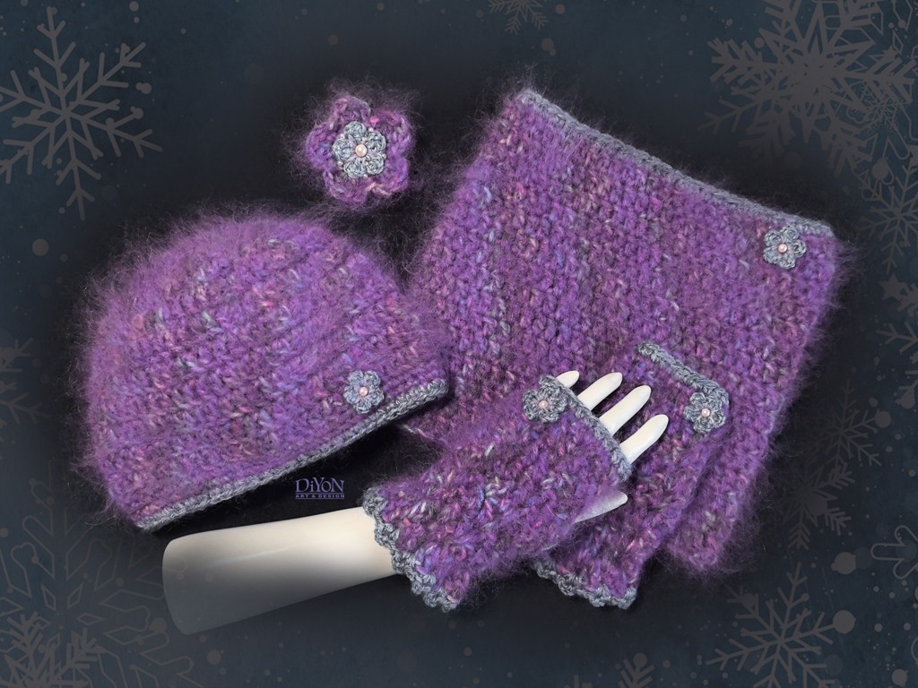 Много красиво, топло и луксозно плетиво с мохер, подходящо за студеното време. В едновременно и неутрален син нюанс, но и с цветни акценти, които го освежават. Единична бройка, собствен дизайн и изпъление за дами, които предпочитат уникатите. Лесно се комбинира с почти всяка връхна дреха. Шалът е тип яка, а ръкавиците са без пръсти, с вложени ластични ленти за удобство. Брошката можете ад носите и кано шнола в косата.