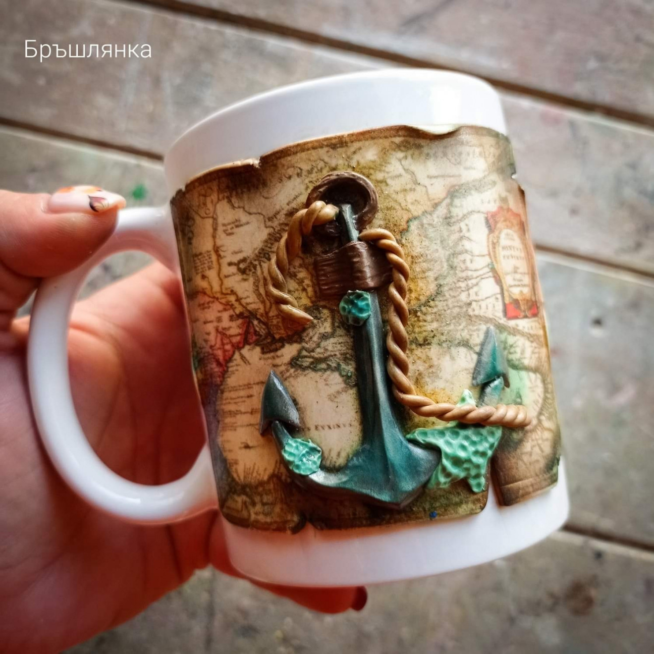 Керамична чаша с декорация от полимерна глина. Не е налична, изработва се по поръчка. Пишете ми за актуален срок на изработка. #чашасполимернаглина #замъже #котва #карта