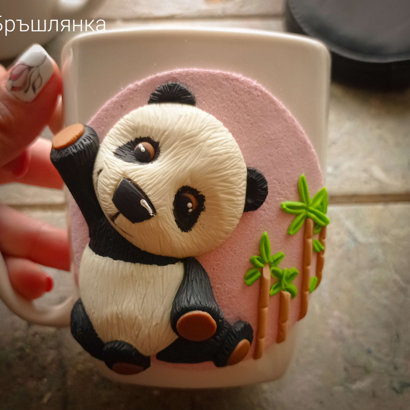Керамична чаша с декорация от полимерна глина. Не е налична, изработва се по поръчка. Пишете ми за актуален срок на изработка. #чашасполимернаглина #панда #бръшлянка