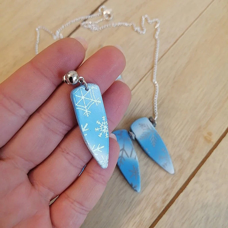 Комплект колие и обеци в студени преливащи тонове и сребристи снежинки. Изработени са от полимерна глина. - Дължина на колието - 48 см. - Размер на декоративния елемент - 5 х 4 см. - Дължина на обецата: 4.5 см.