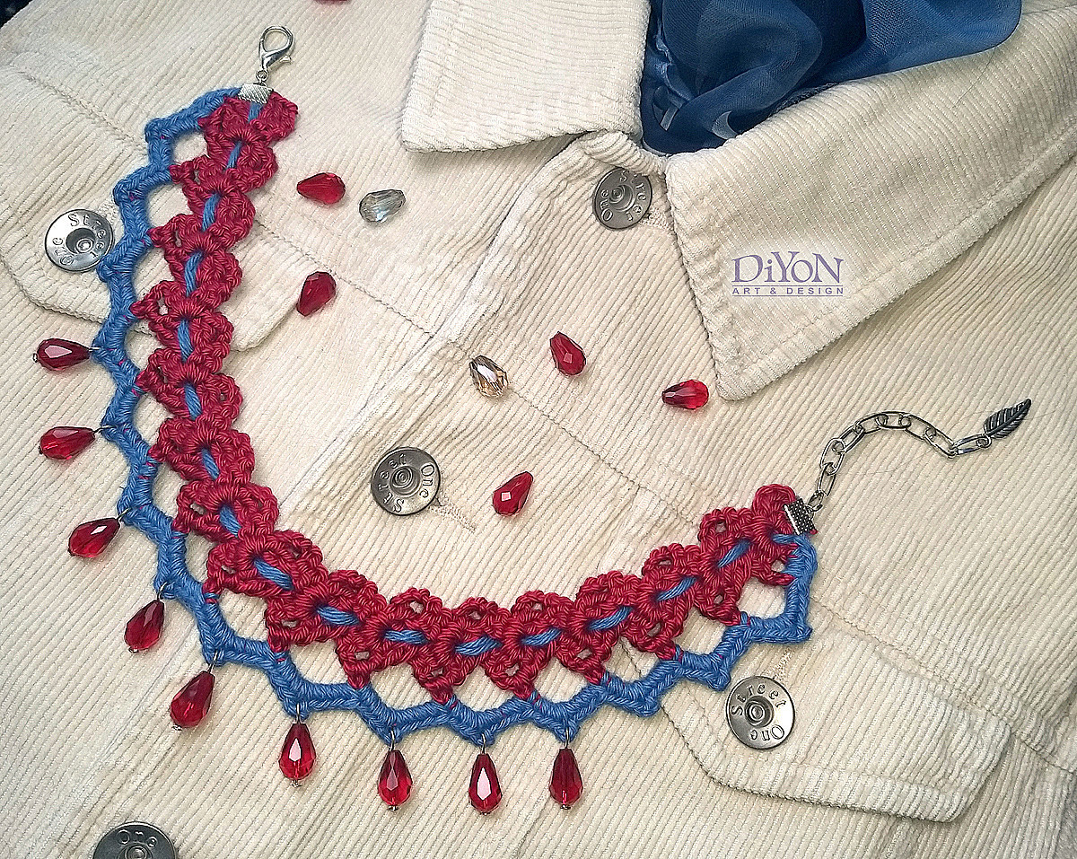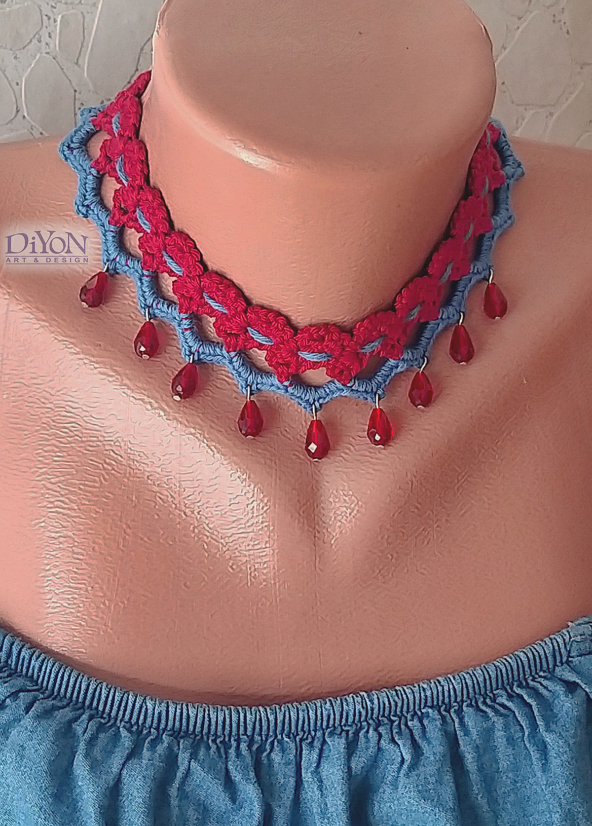 Много ефектно колие от плетена памучна дантела, украсено с червени кристални капки от фасетирано стъкло. Закопчалката е удобна и размерът на гердана се регулира в широки граници.