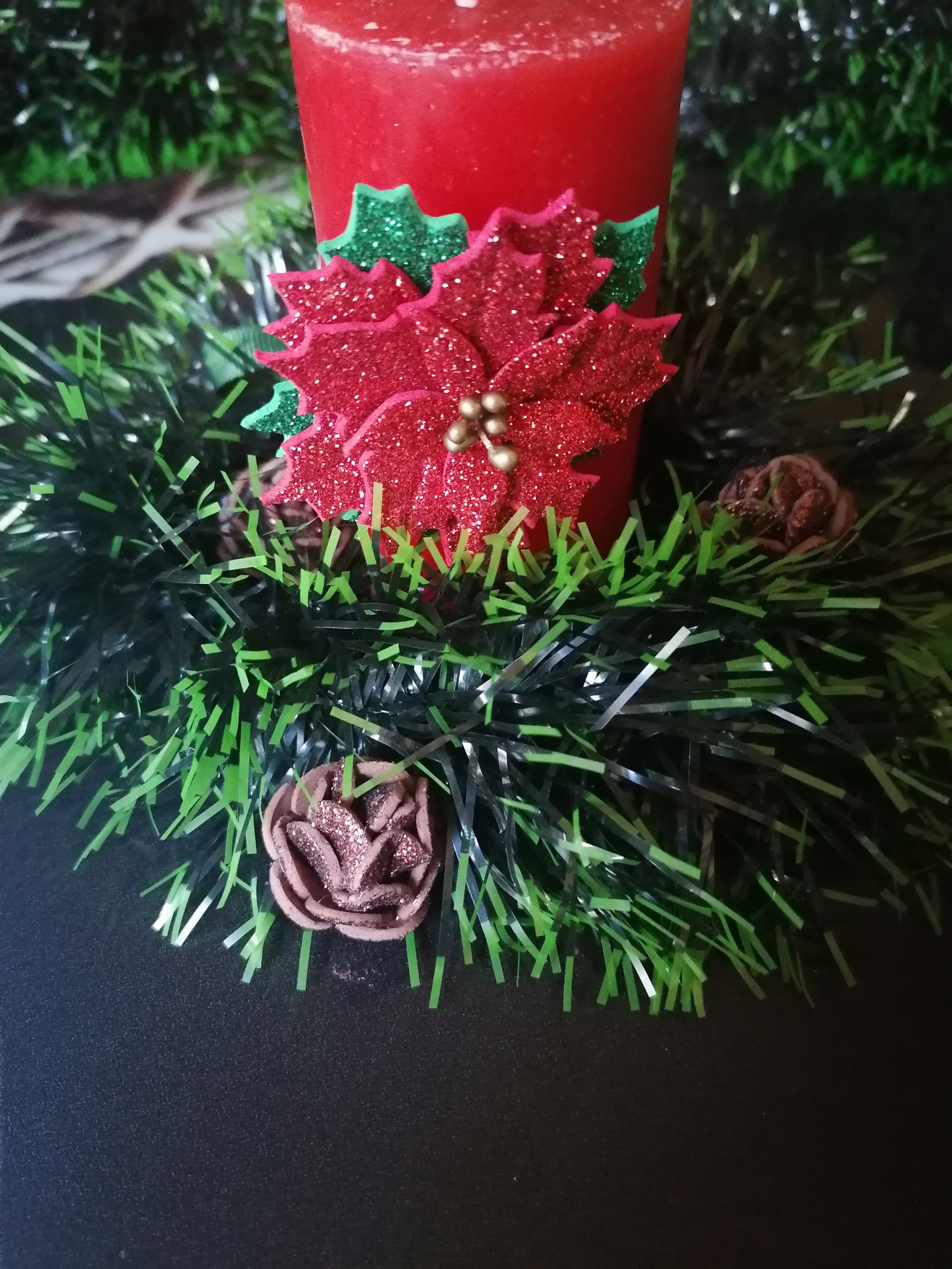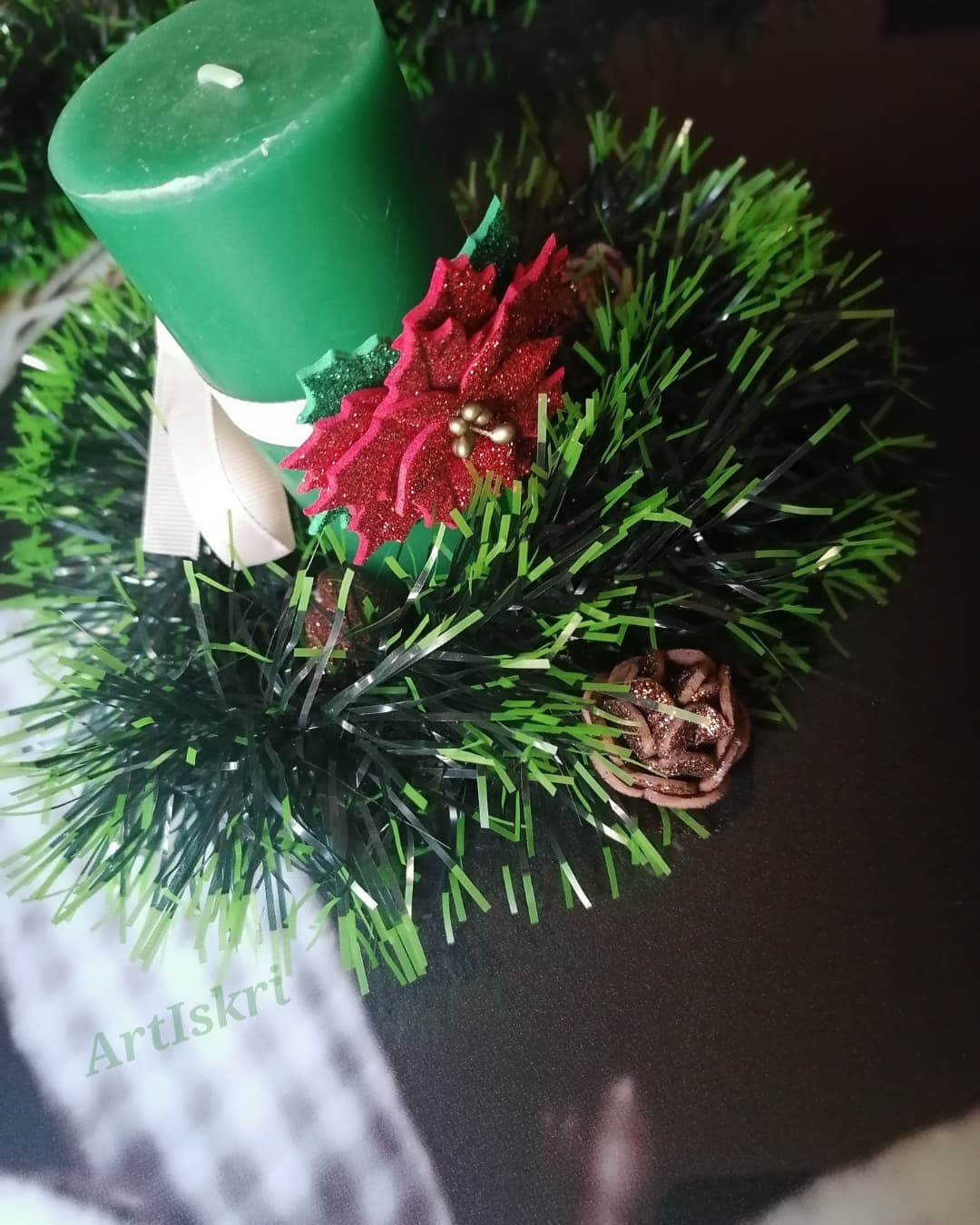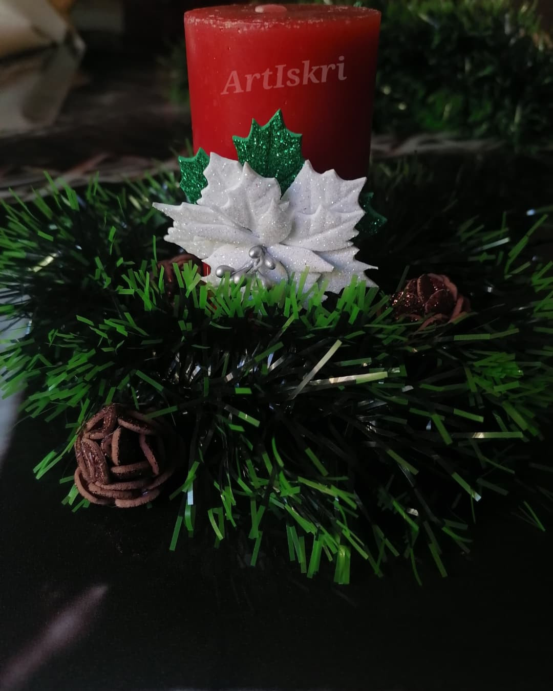 Изработена от брокатен фоам. Всеки детайл е изрязван и обработван един по един с много любов, за да се придаде формата и фурнитурата. Има лаково покритие. Предлага се в два класически цвята - червено и бяло. Би могло да се изработи и в златисто. Предлага се и като част от сет за цялостна декорация на Вашата коледна трапеза и интериор, включващ панделки за салфетки и завеси. Тях ще откриете отделно в профилът ми тук или на страниците ми във Фейсбук и инстаграм. #хендмейд #декорация #интериор #свещ #коледназвезда #АртИскри