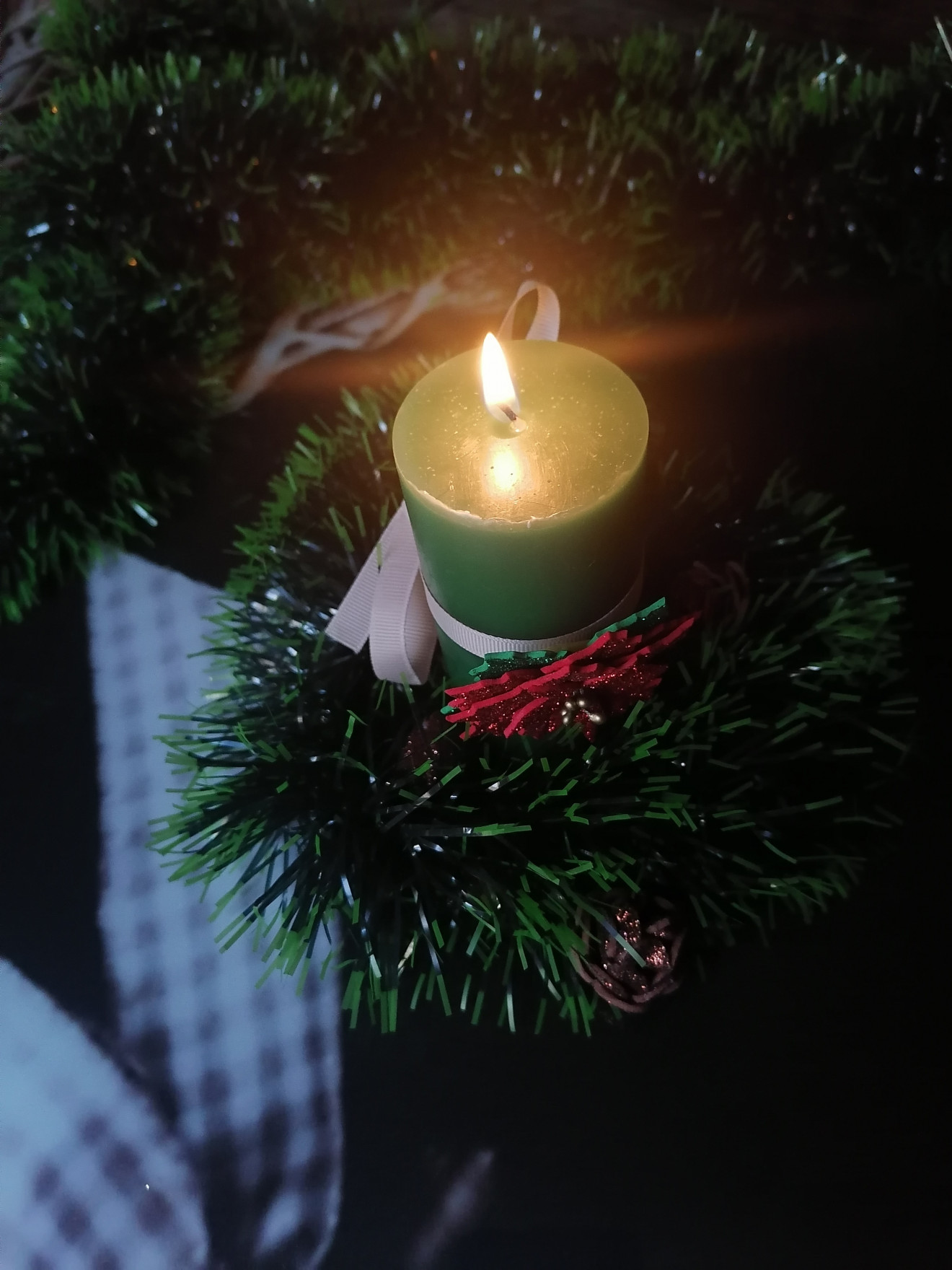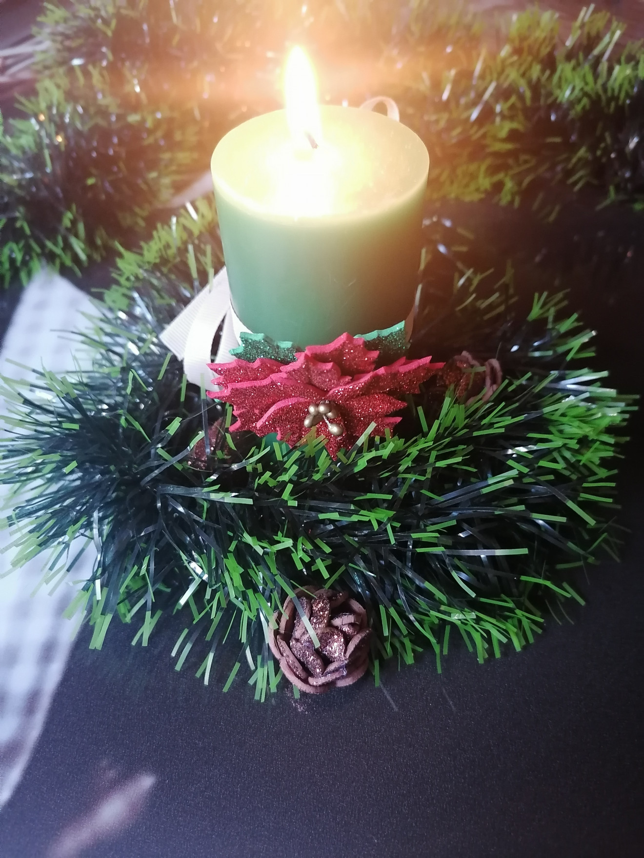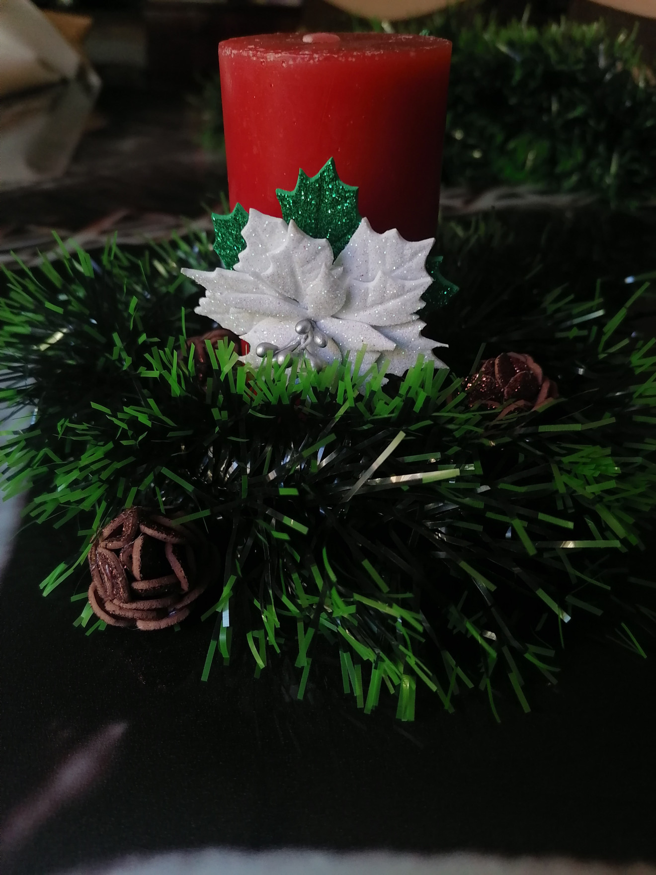 Изработена от брокатен фоам. Всеки детайл е изрязван и обработван един по един с много любов, за да се придаде формата и фурнитурата. Има лаково покритие. Предлага се в два класически цвята - червено и бяло. Би могло да се изработи и в златисто. Предлага се и като част от сет за цялостна декорация на Вашата коледна трапеза и интериор, включващ панделки за салфетки и завеси. Тях ще откриете отделно в профилът ми тук или на страниците ми във Фейсбук и инстаграм. #хендмейд #декорация #интериор #свещ #коледназвезда #АртИскри