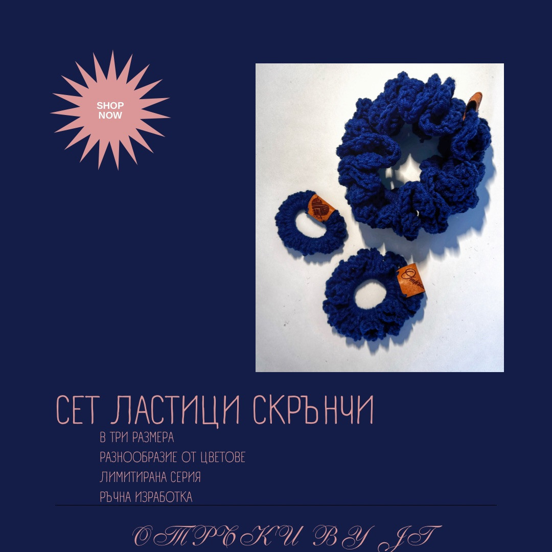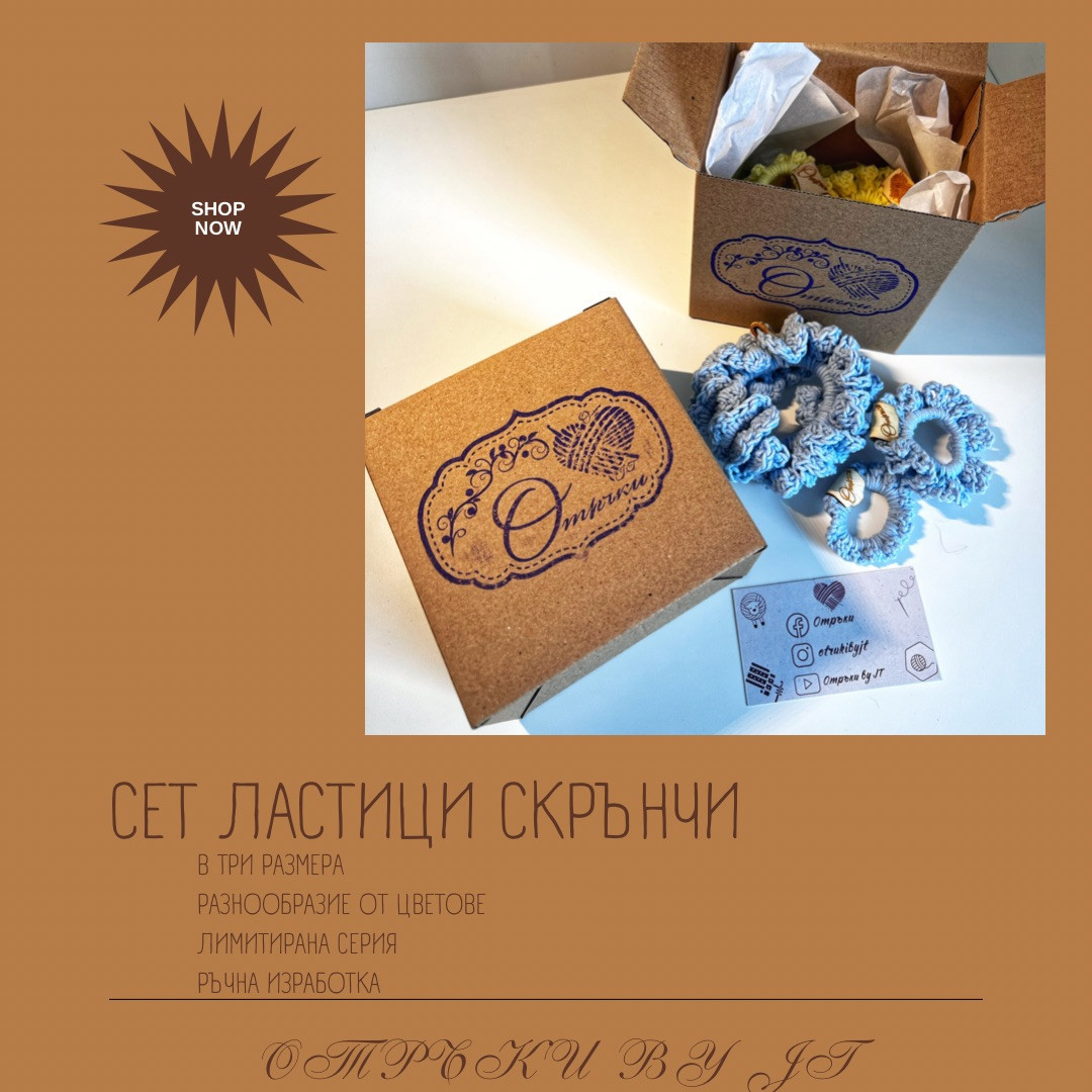 Идеален подарък за нежния пол. #отръкискрънчи са ластици изплетени от памучна прежда в три размера ,подходящи за всеки стил на обличане и щадящи косата,като не накъсват и заплитат.