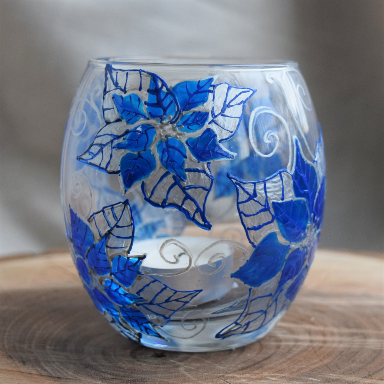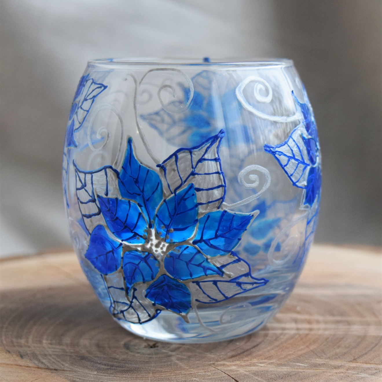 Ръчно изрисуван свещник "Коледни звезди " в синьо . Размери : височина 9.5, широчина 8см . Нарисуван е с бои за стъкло , които са водоустойчиви , препоръчва се миене на ръка.