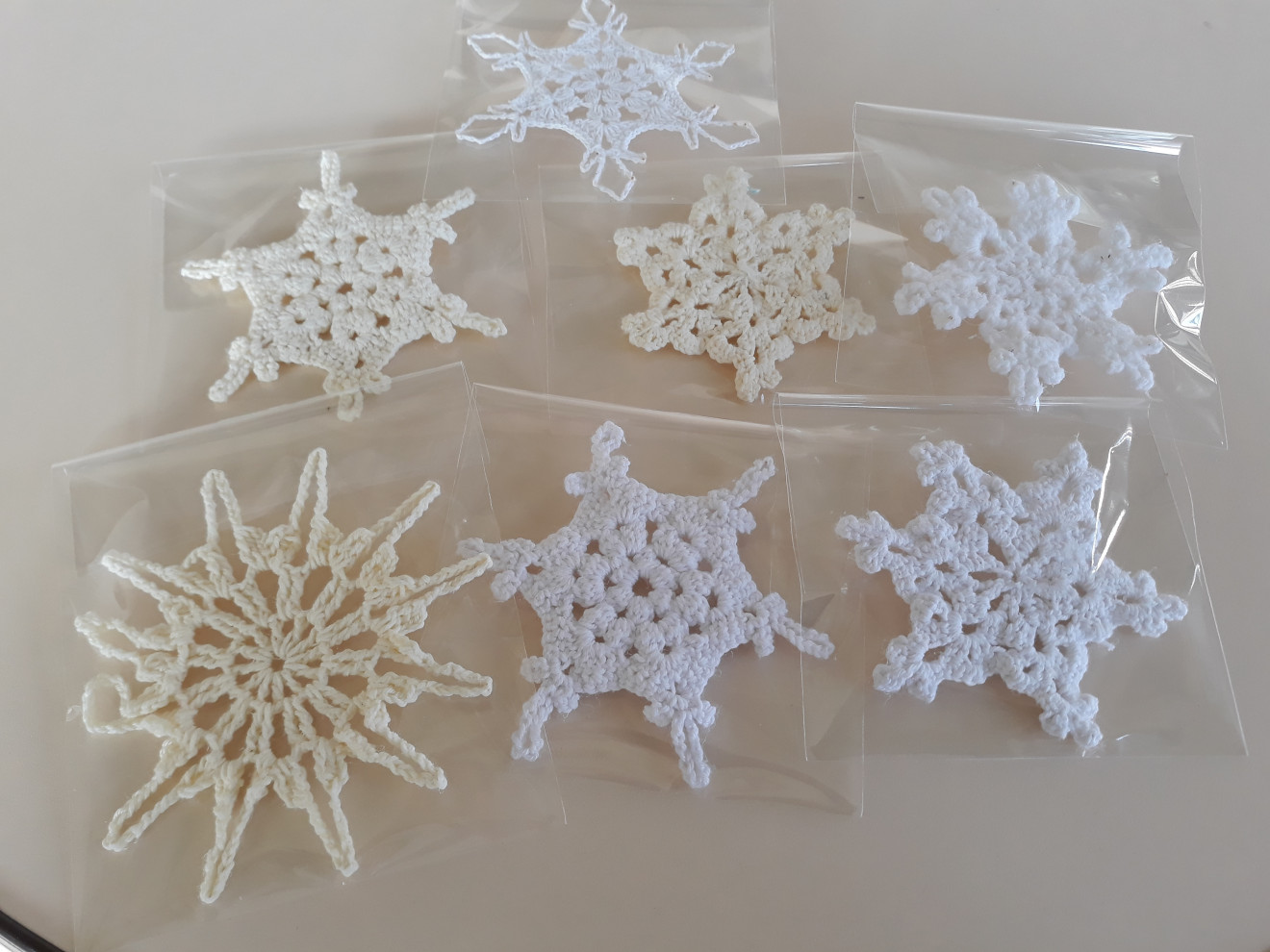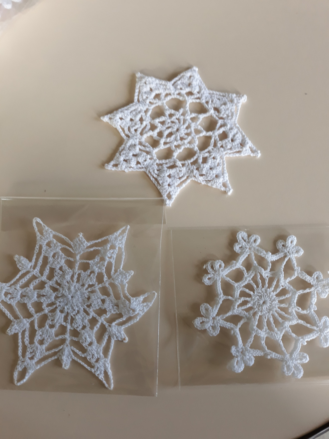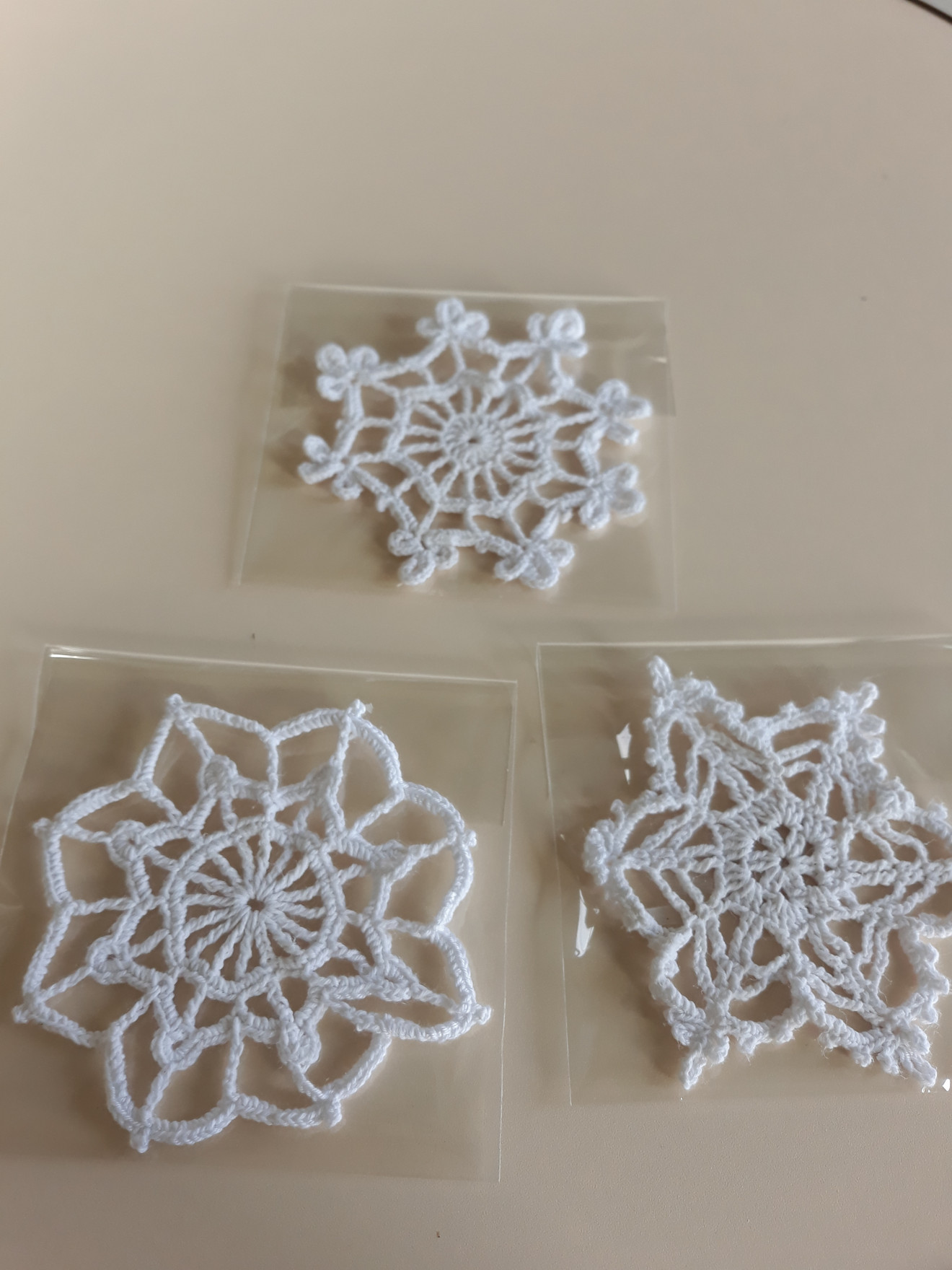 Изплетени на една кука и колосани. Диаметър от 9см. до 15см.