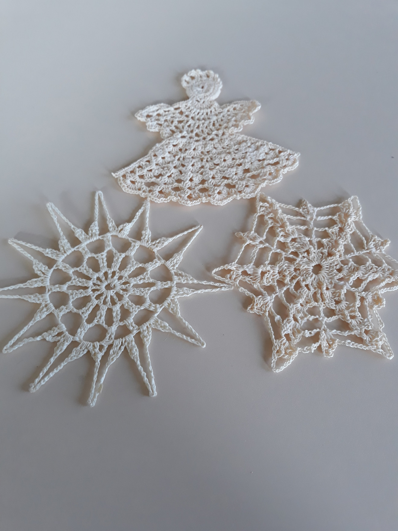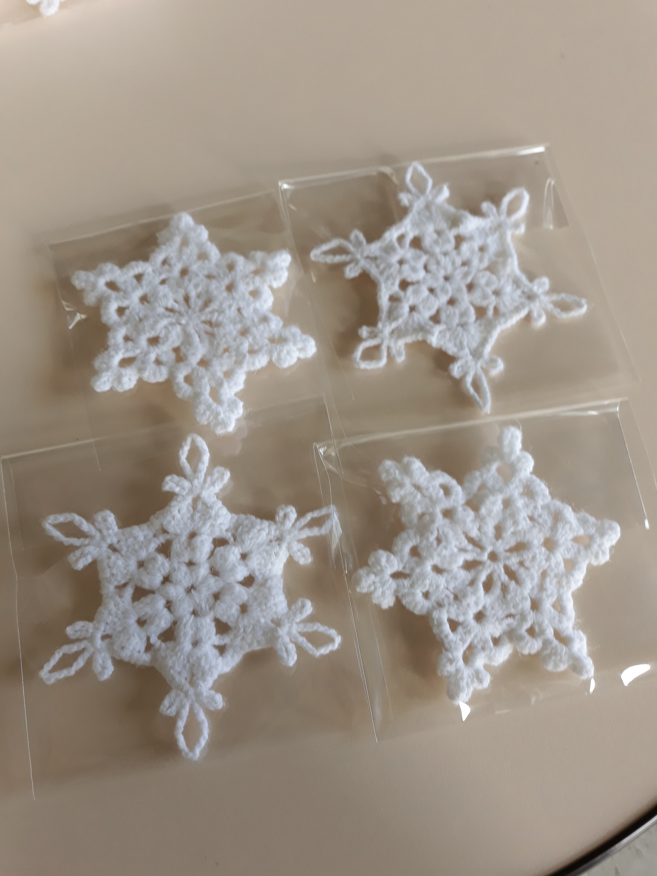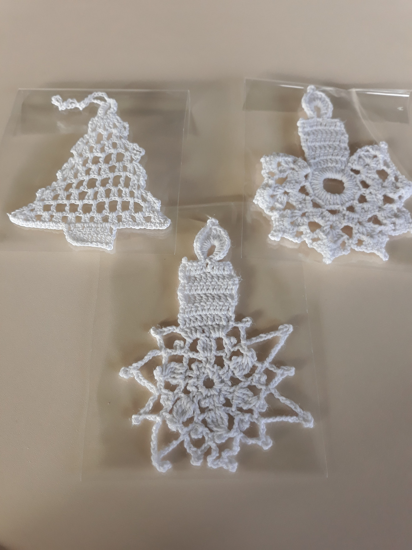 Изплетени на една кука и колосани. Диаметър от 9см. до 15см.