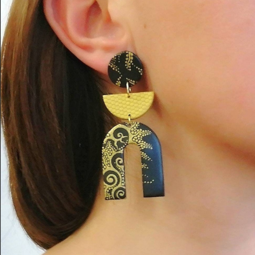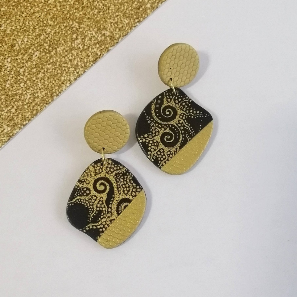 Елегантни висящи обеци в черно с красив златист мотив. Изработени на ръка от полимерна глина, на стоманен щифт. - Дължина на обецата с три сегмента ( U - форма) : 7 см. - Дължина на обецата с два сегмента ( U - форма): 5.5 см. - Размер на обецата два сегмента: 5 см.