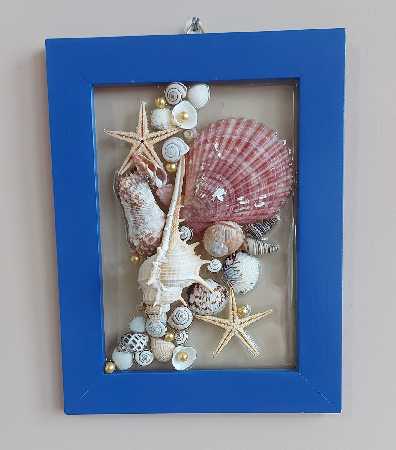 Стъклена основа, дървена рамка. Готова за окачване на стена. Декорация с морски раковини в епоксидна смола. Размер 21/16 см.