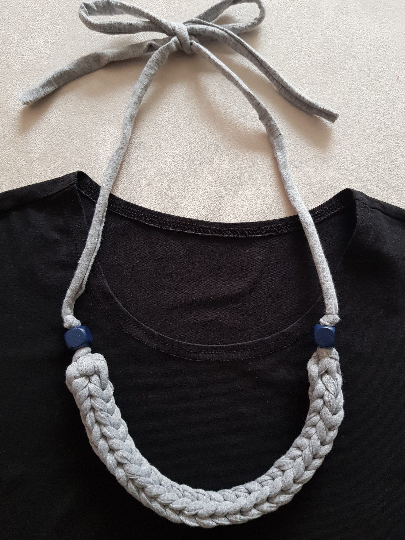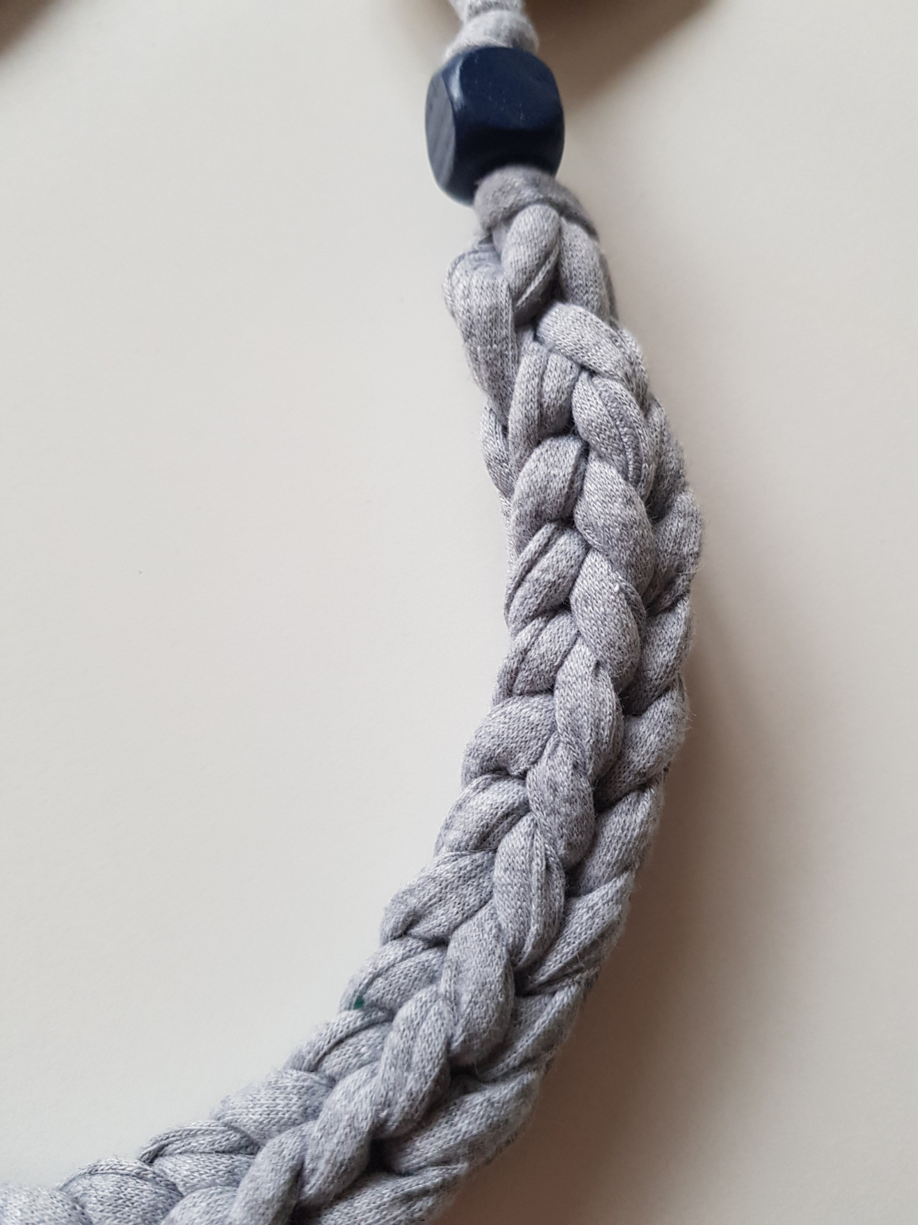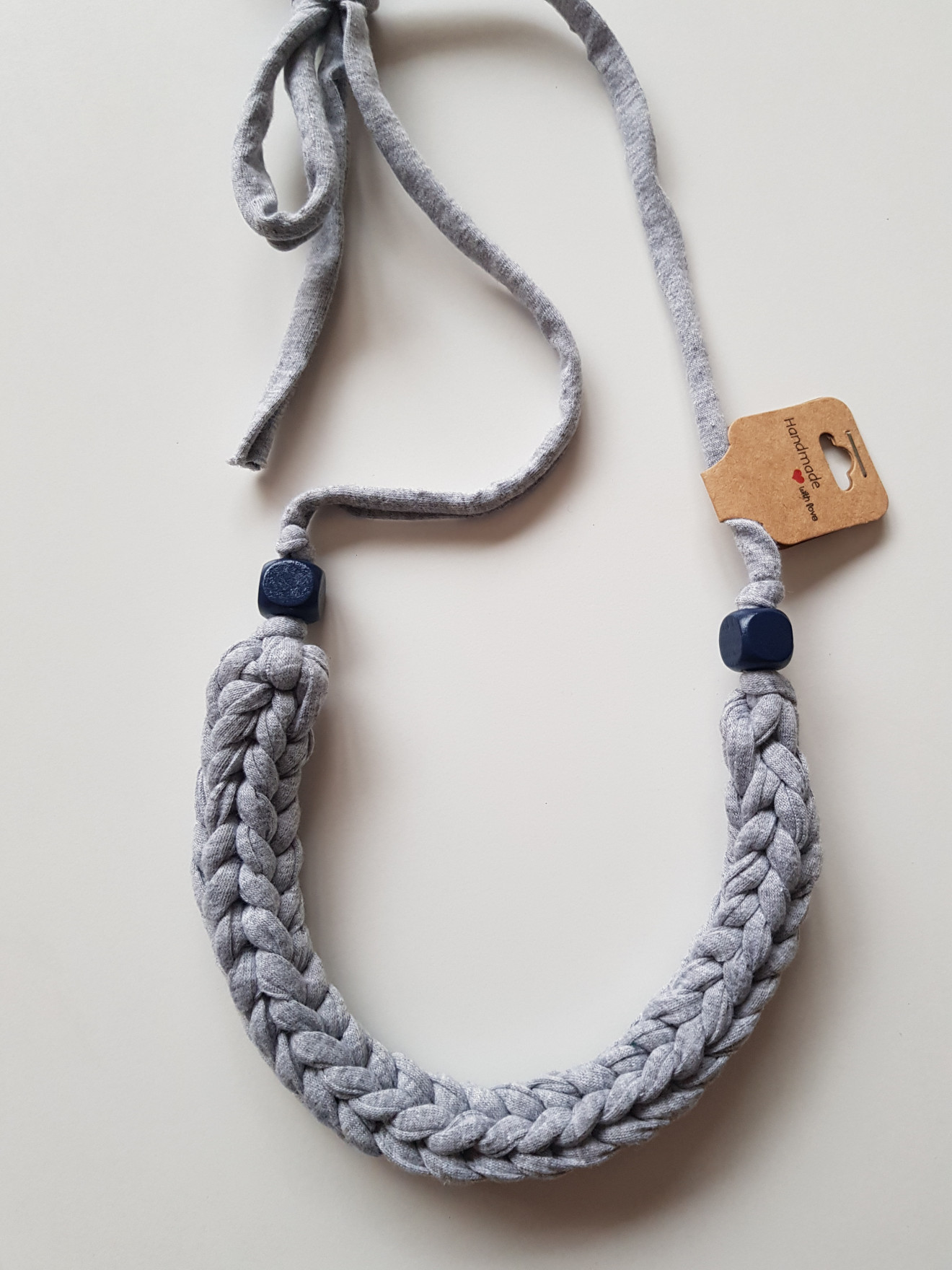Колие в цвят сив меланж със сини дървени маниста. Дължината на плетката е около 30см. Връзките са оставени дълги, за да се регулира според вашите нужди.