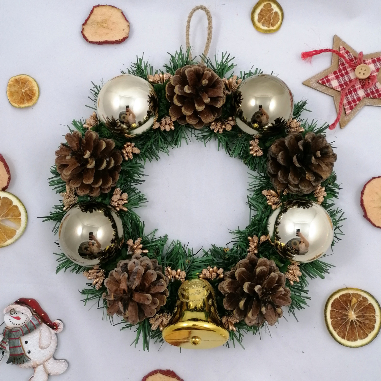 Празничен венец с естествени материали и коледни украси. Основата му е облечена в натурално зебло. Диаметър около 30см.