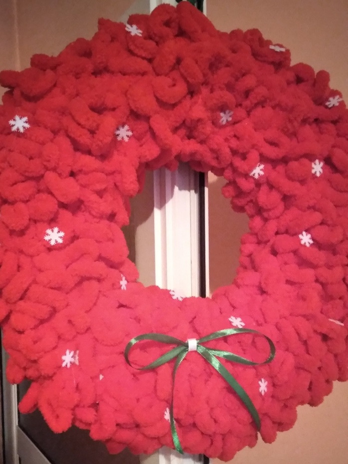 Коледен венец изработен от прежда Ализе пуфи. Идеален декор за вашата врата, за предстоящите празници