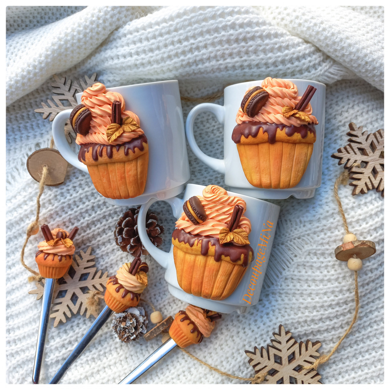 Порцеланова чаша с декорация мъфини. Изработени са от поличерна глина. Към тях има и лъжички с малки мъфини. #полимернаглина #чашисполимернаглина #лъжичкисполимернаглина #мъфини