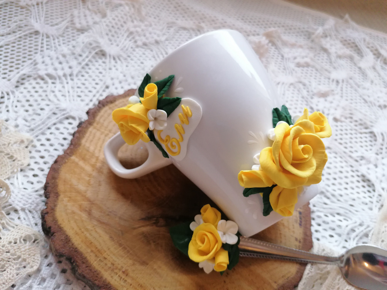 Комплект чашка с лъжичка, с декорация от полимерна глина. Чашата може да се ползва ежедневно, без да се поставя в миялна и микровълнова, миенето става на ръка
