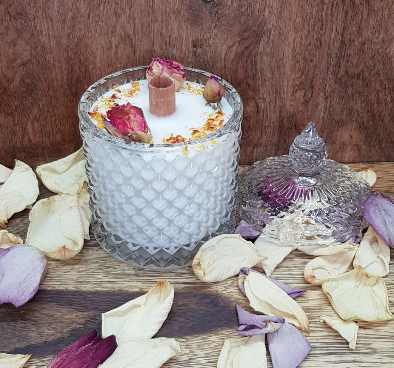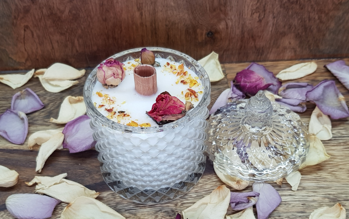 Луксозна свещ от соев восък в стъклен контейнер- 300 мл., с дървен фитил, декорирана със сухи рози и малки парченца кехлибар.