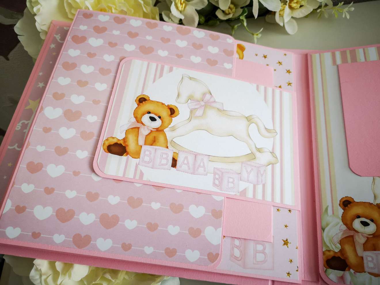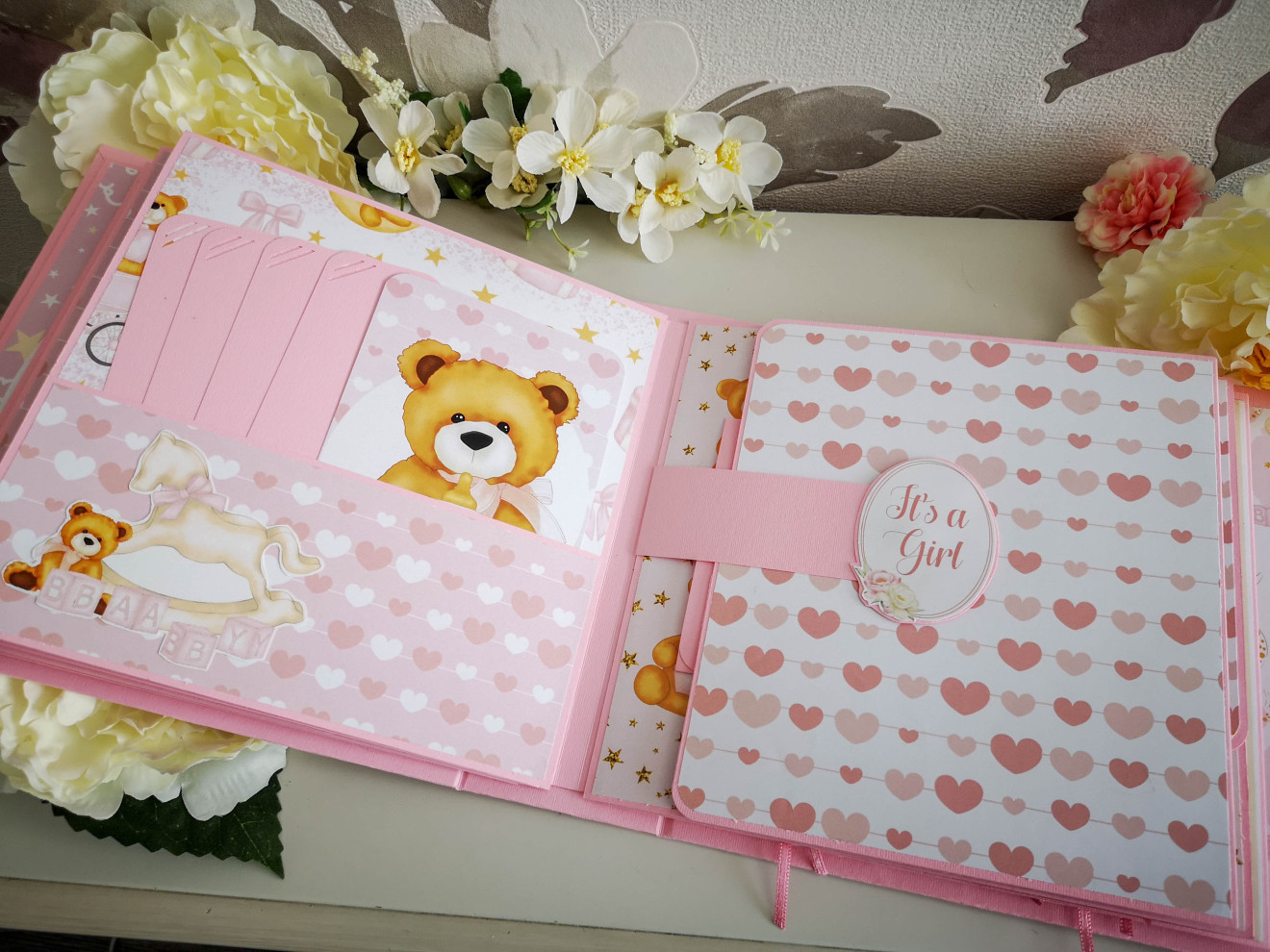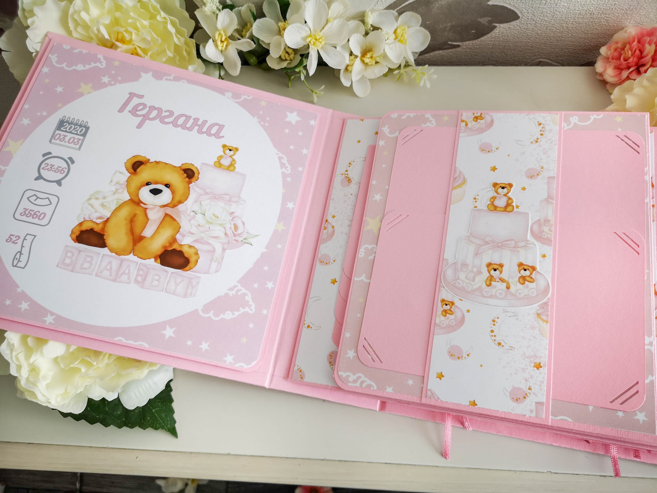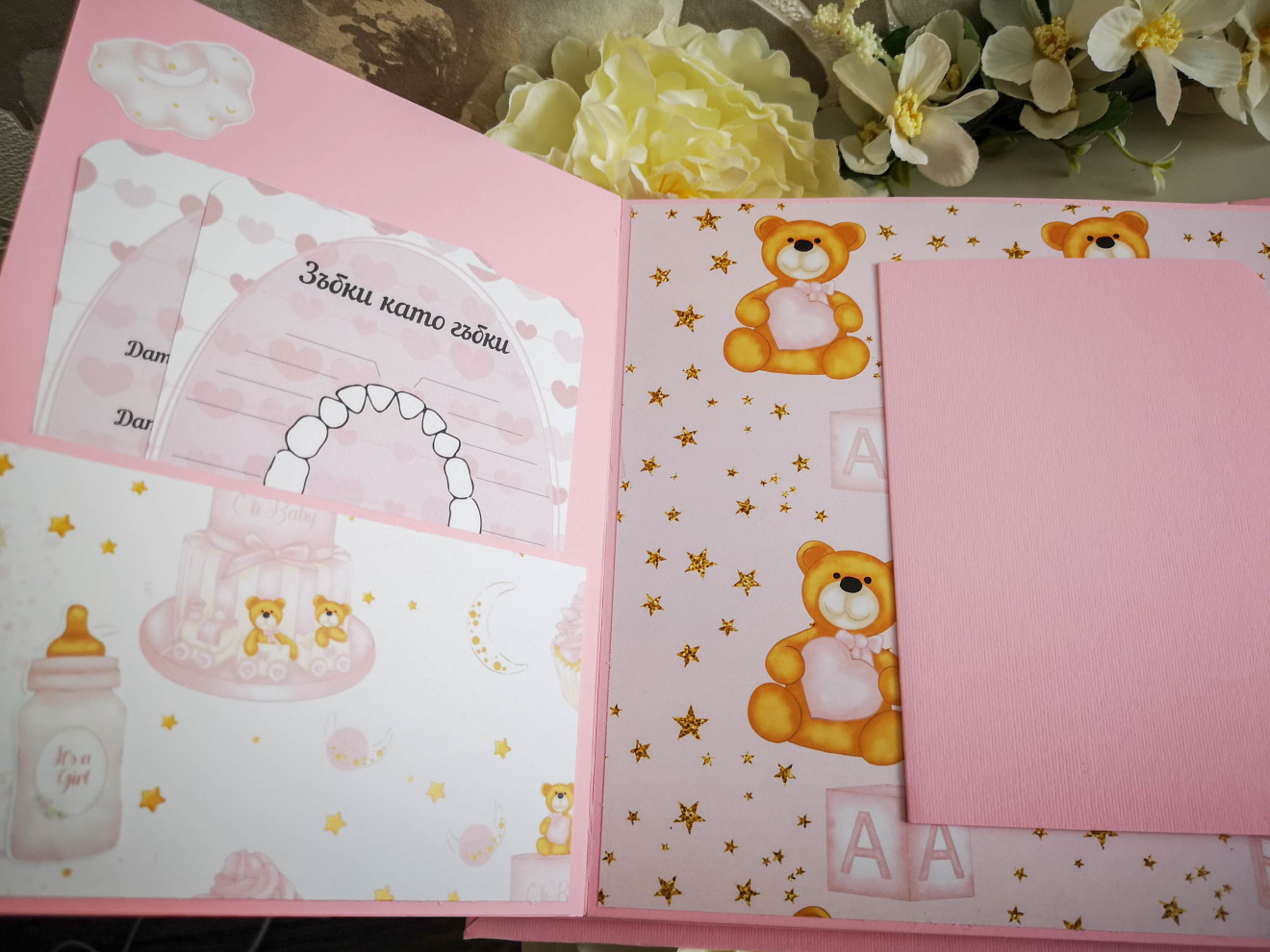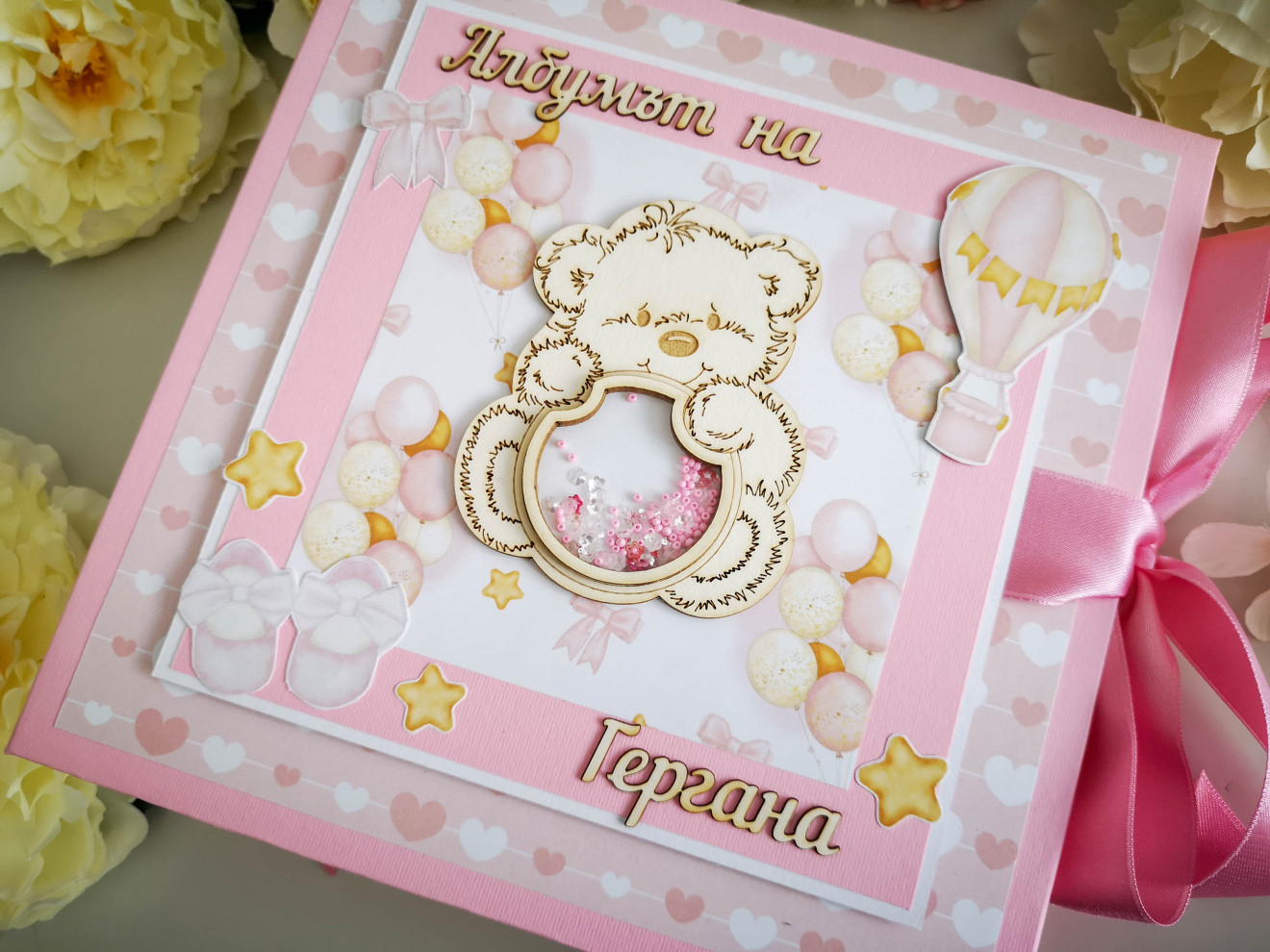 Ръчно изработен бебешки скрапбук албум за момиче. Индивидуален дизайн. Съдържа около 100 снимки, основно в размер 10х15см, визитка с рожденните данни и картички за отбелязване на развитието. Може да се добавят и раздели: - снимки от месечинки - 10лв - вградена кутия за съкровища - 10лв. Изцяло ръчна изработка, дизайнерски шейкър на корицата, много разгъвки и джобчета за снимки. Уникален подарък за новородено, погача, кръщене или рожден ден. Изработвам по поръчка в рамките на 14 дни. Обявеният срок е ориентировъчен и варира в зависимост от моментната ми натовареност. При интерес, пишете ми или се обадете на посочения телефон. Заповядайте и да разгледате още от моите творения за бебета и деца на страницата ми https://facebook.com/HandmadeByYasnaBozhinova/