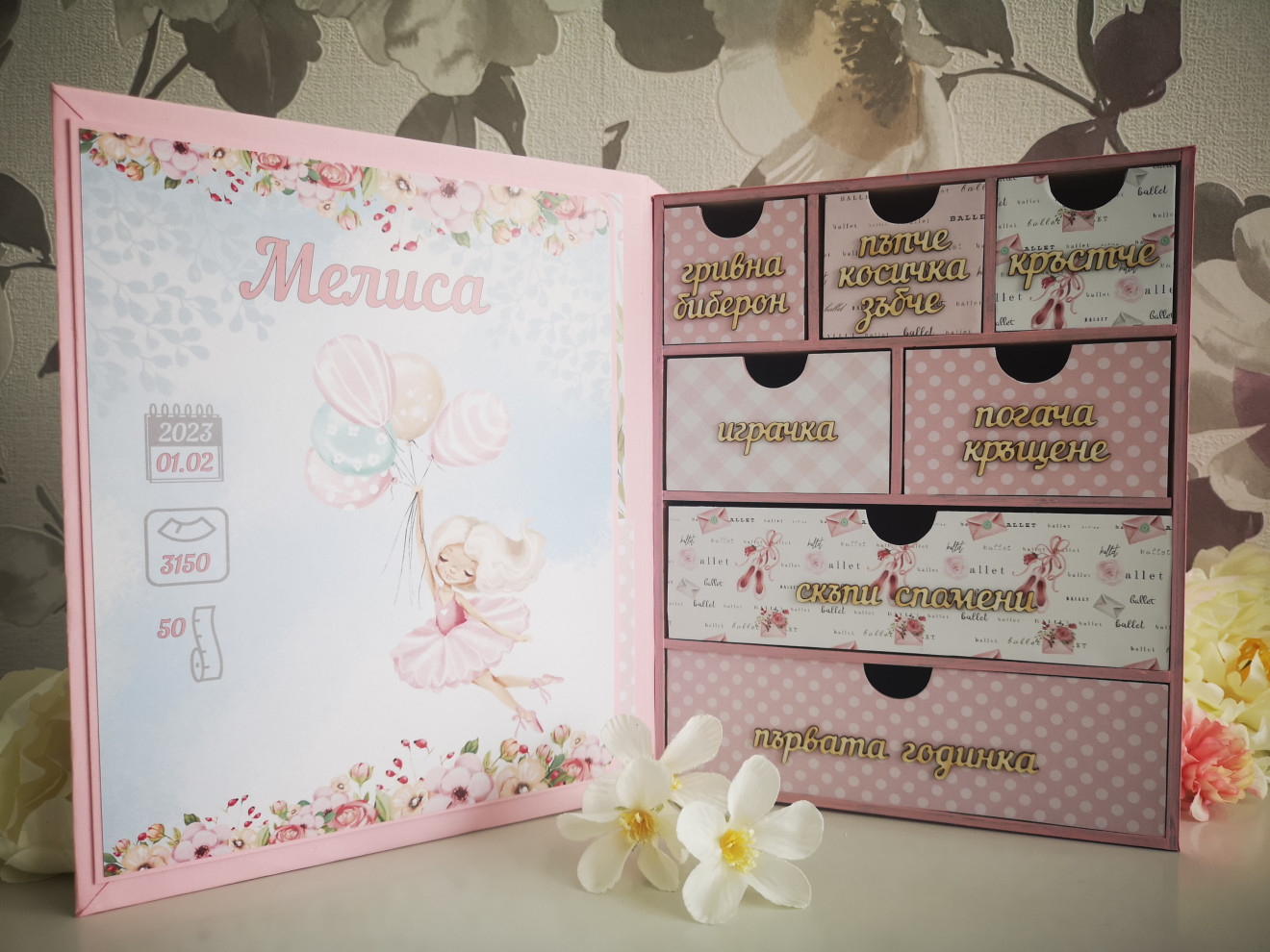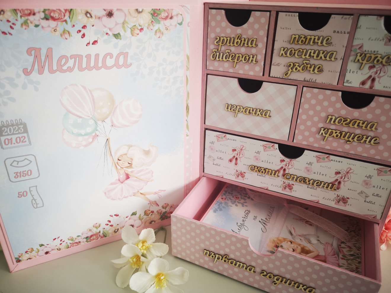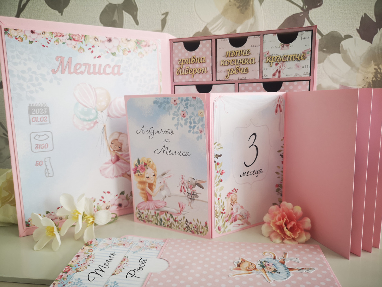 Комплект кутия за бебешкисъкровища, мини албумче тип хармоника и плик с картички за растежа. Налични много теми. Изработва се по поръчка и съобразно предпочитания ви, както за момиче, така и за момче. Комплектът съдържа визитка с данните на бебето, място за 4 снимки и картичка, мини албумче за снимки от първата годинка и плик с картички за записване на данни от растежа. Уникален подарък за новородено, погача, кръщене или рожден ден. Изработвам по поръчка в рамките на 5 дни. Обявеният срок е ориентировъчен и варира в зависимост от моментната ми натовареност. При интерес, пишете ми или се обадете на посочения телефон. Заповядайте и да разгледате още от моите творения за бебета и деца на страницата ми https://facebook.com/HandmadeByYasnaBozhinova/Уникален подарък за новородено, погача, кръщене или рожден ден.