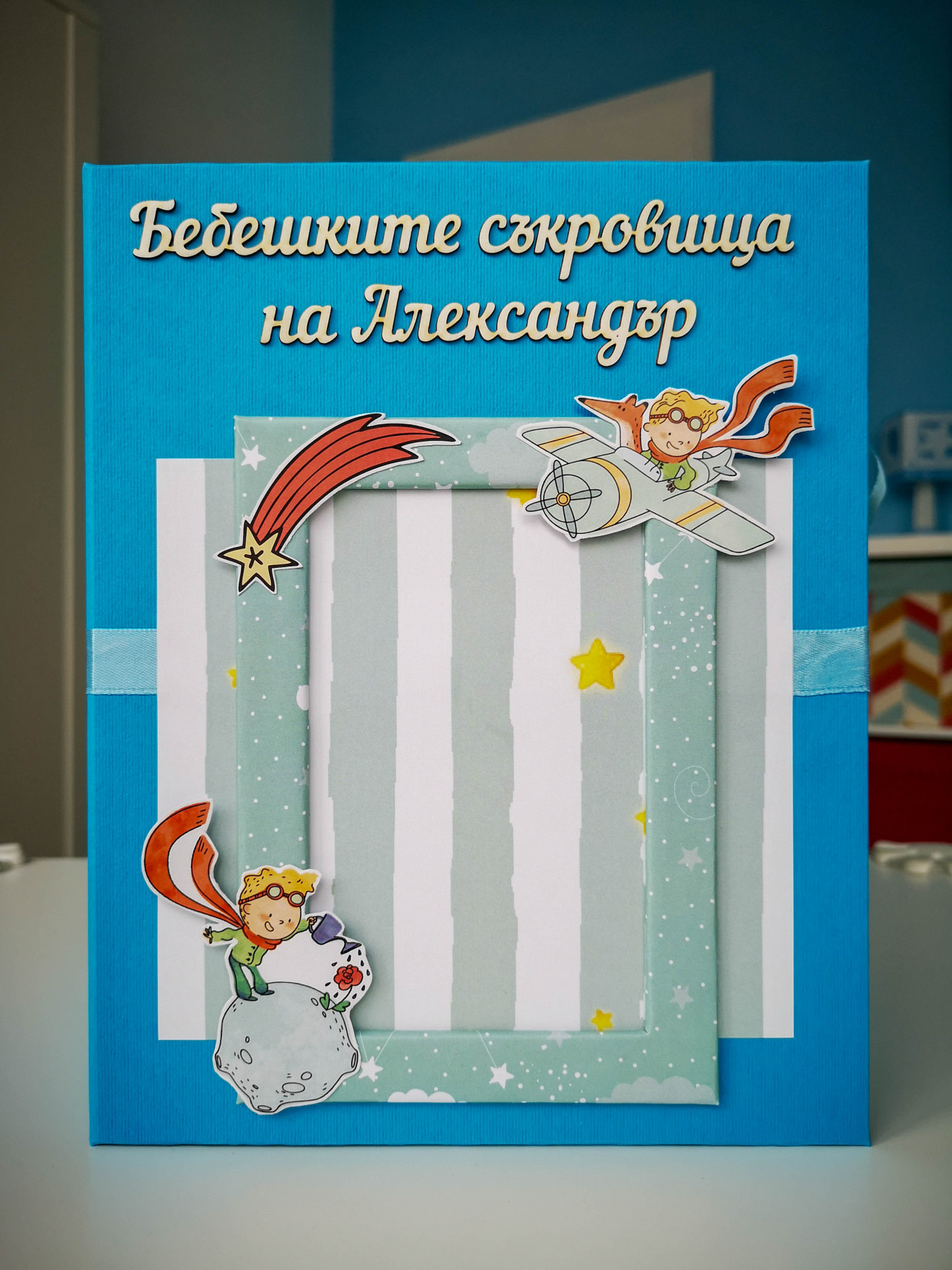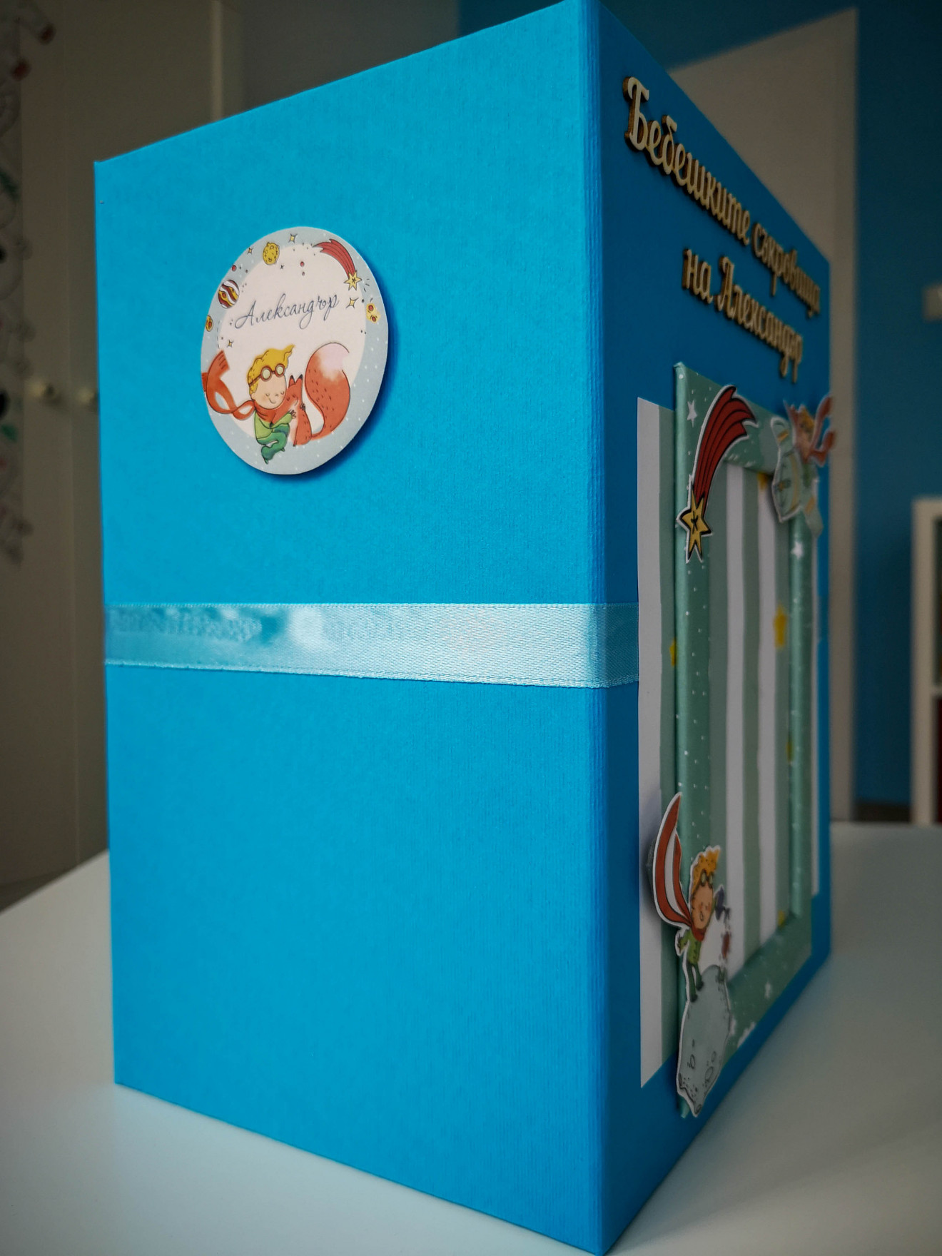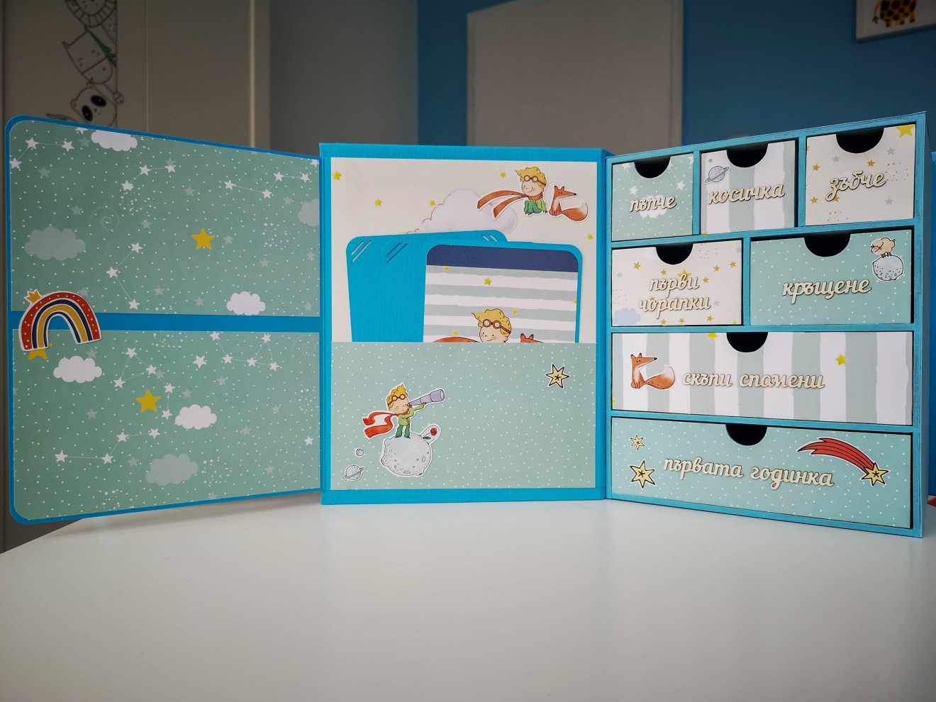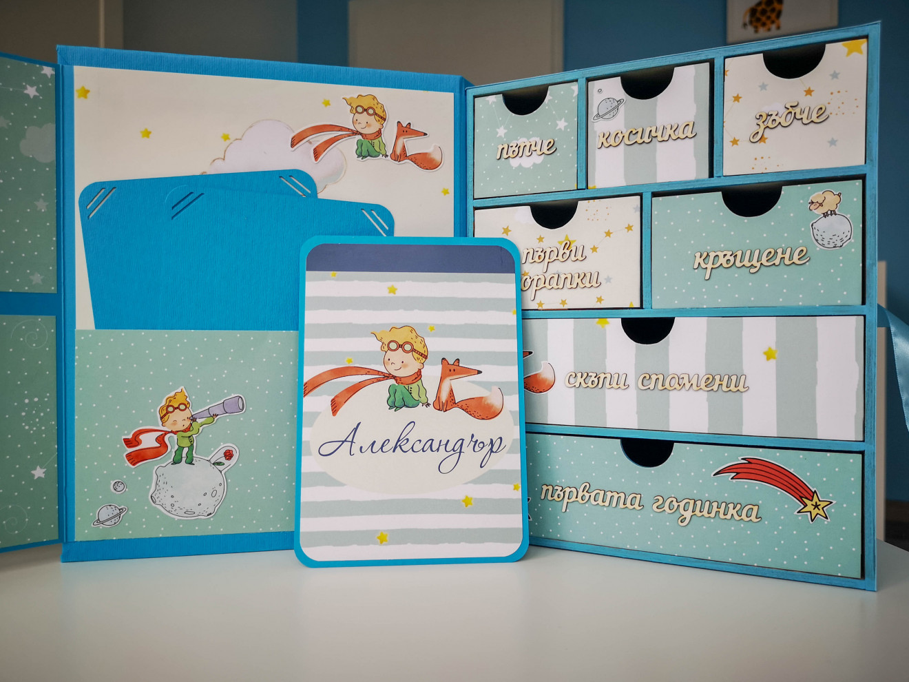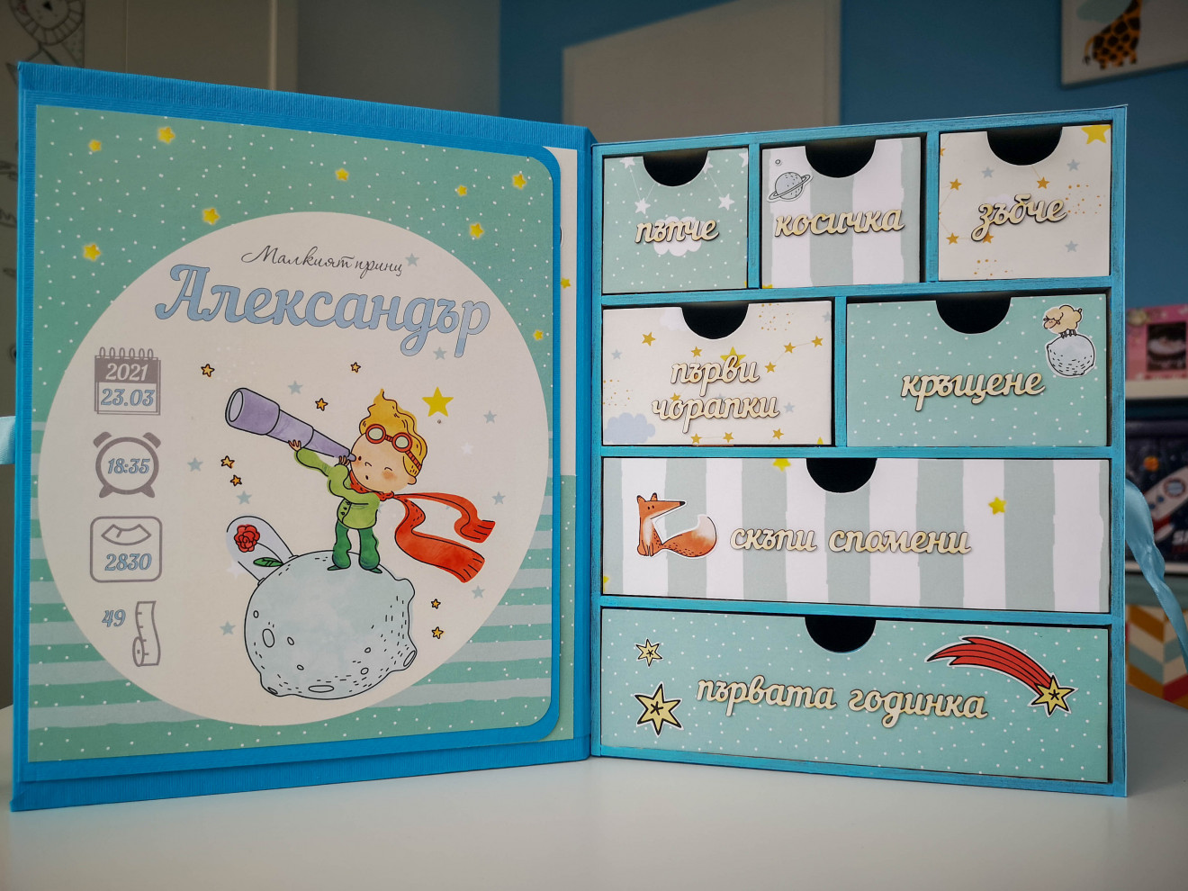 Една малко по-различна кутия за бебешки съкровища. Изработва се по поръчка и съобразно предпочитания ви, както за момиче, така и за момче. Дървена кутия, със седем чекмеджета. Пълна персонализация и надписване по ваш избор. Съдържа визитка с данните на бебето, място за 4 снимки и картичка с уникален дизайн. Има възможност за изработка на мини албумче за снимки от първата годинка и плик с картички за записване на данни от растежа. Срок на изработка 5 дни. За повече информация и поръчка, пишете ми или се обадете на посочения телефон. www.facebook.com/HandmadeByYasnaBozhinova/