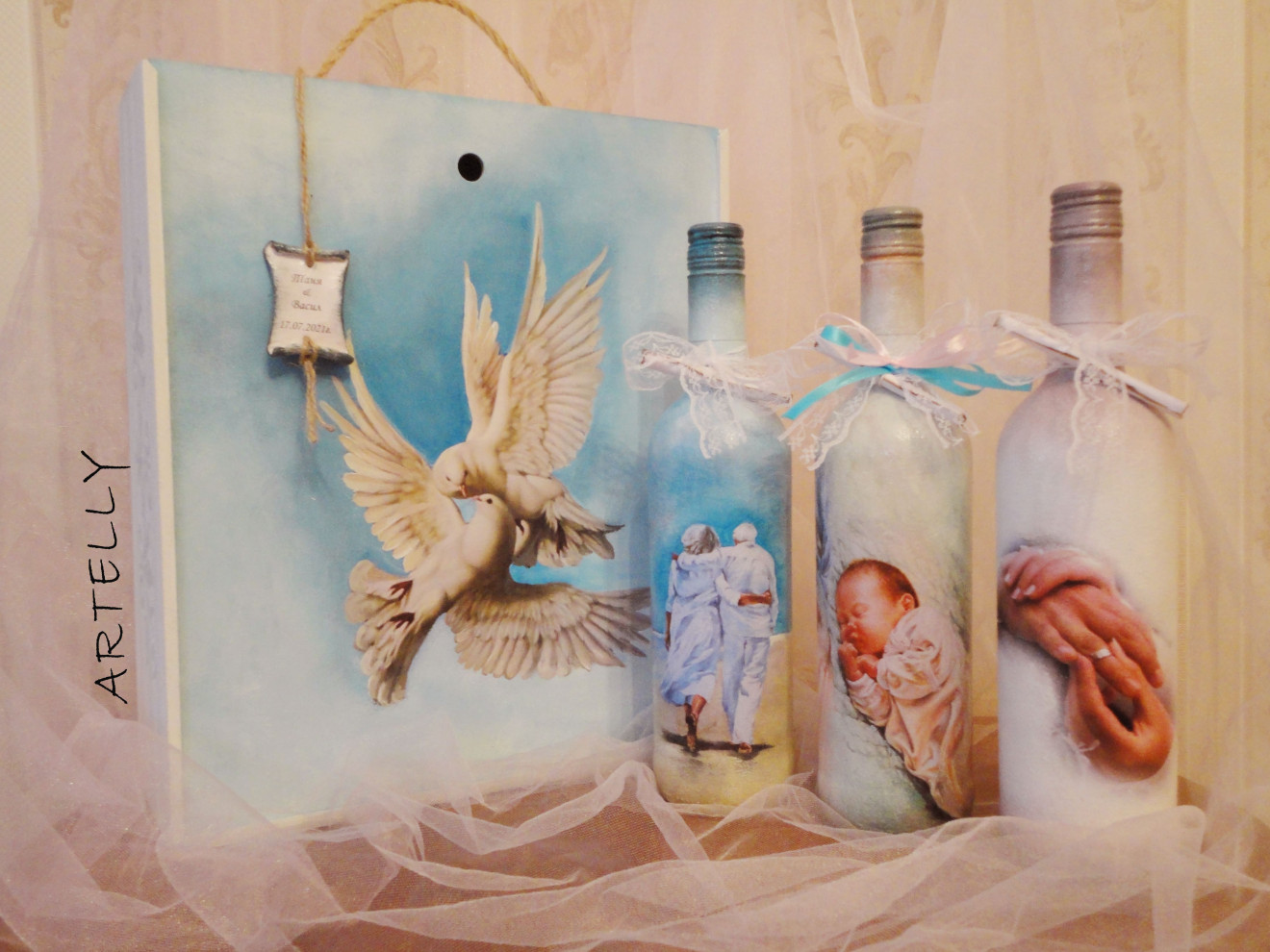 #Бутилки за #наричане 3бр. в кутия, ръчно декорирани.Уникален, запомнящ се #подарък от кумове или близки роднини за #младоженците. Наричането може да е за първата годишнина, за бебе, сребърна/златна или друга годишнина от #сватба. Към всяка бутилка има пожелание за съответния повод. За поръчка: 0898/365 915 https://www.facebook.com/artelly12