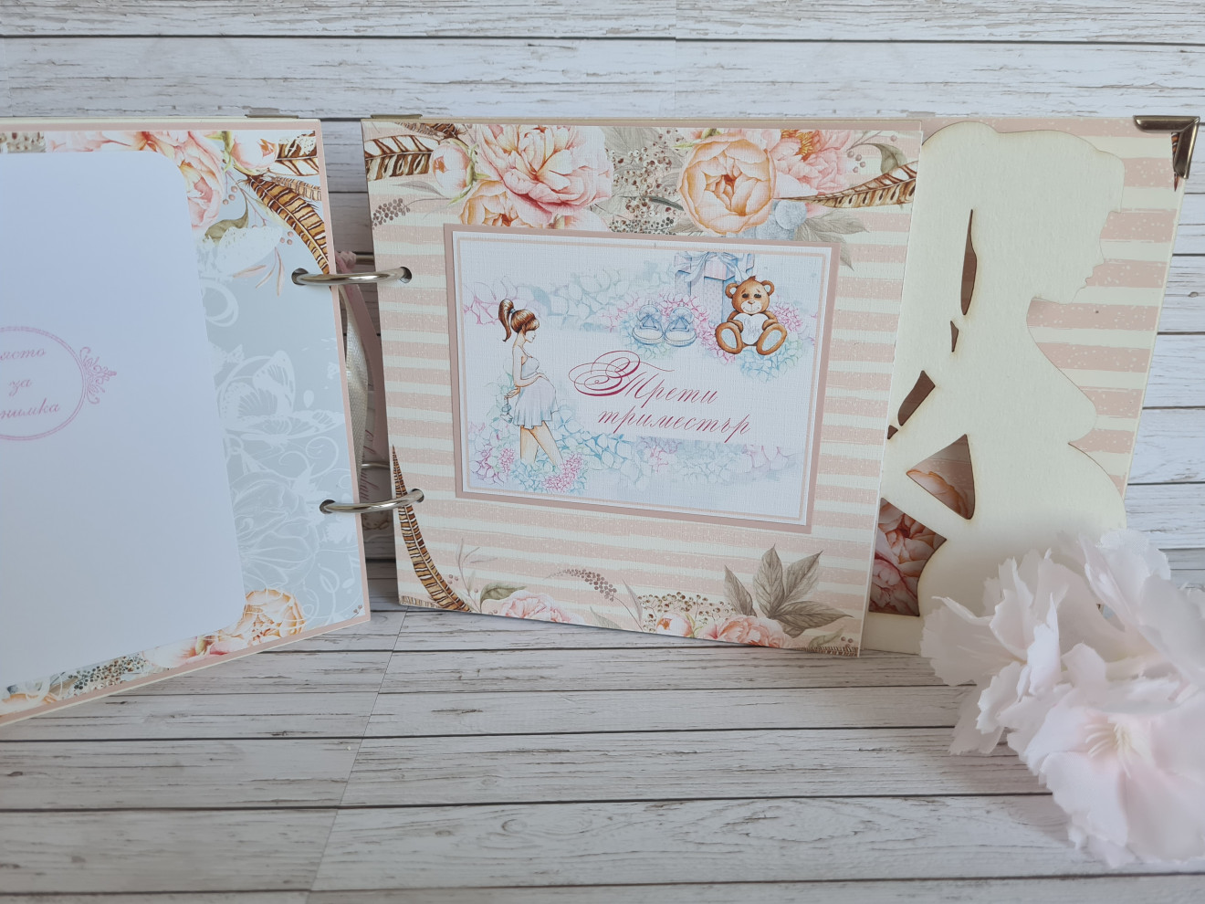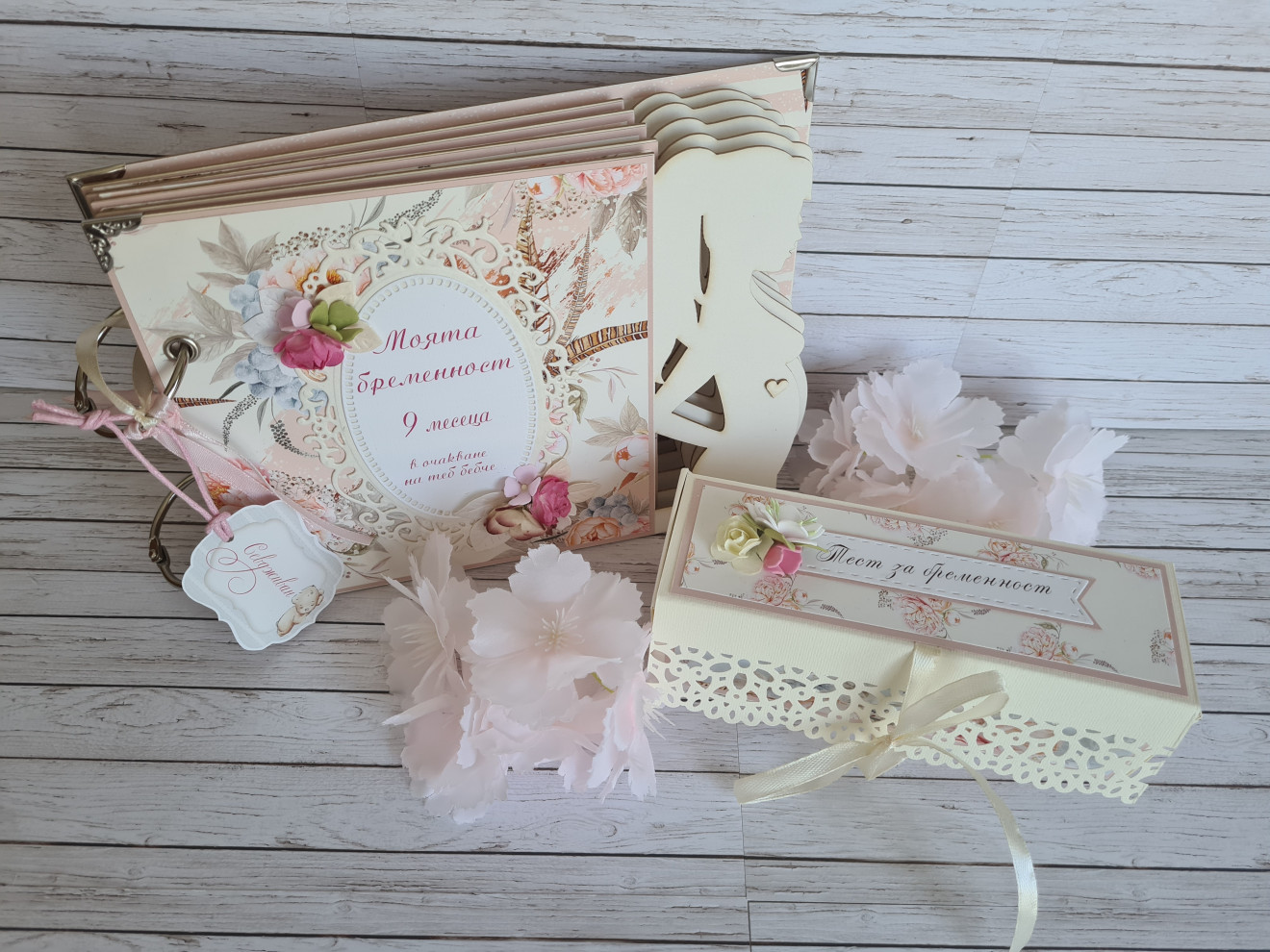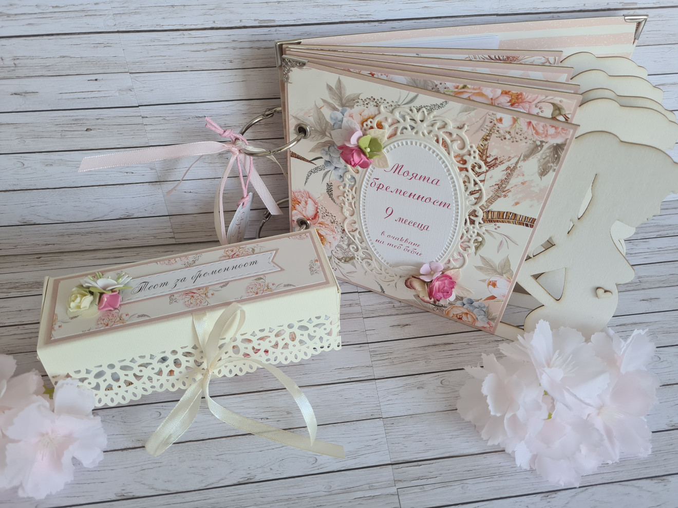 Дневник - албум за снимки и спомени, изцяло ръчна изработка с тематична декорация "Моята бременност" В него ще откриете различни страници с място за попълване на данни и спомени по време на Вашата бременност. Записки за всеки месец, снимки на тест за бременност, първи видеозон, снимки от всеки месец или всеки видеозон през цялата бременност. На последната страница има изработено мини албумче с място за записване на данните на бебето в деня на раждането му, както и първи снимки. Кутия за съхранение на теста за бременност, декорирана в тон с дневника и затваряща се с панделка. Дневника се персонализира според желанията и предпочитанията. Срок за изработка 7-10 дни За още идеи и предложения, посетете ни на https://www.facebook.com/Crafty.Treasures.Studio