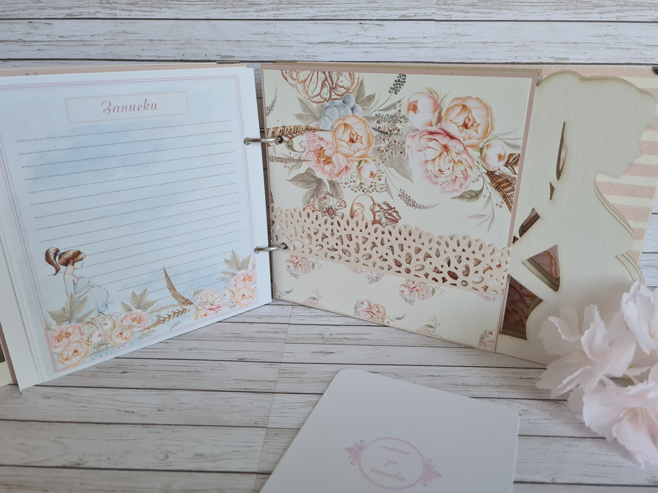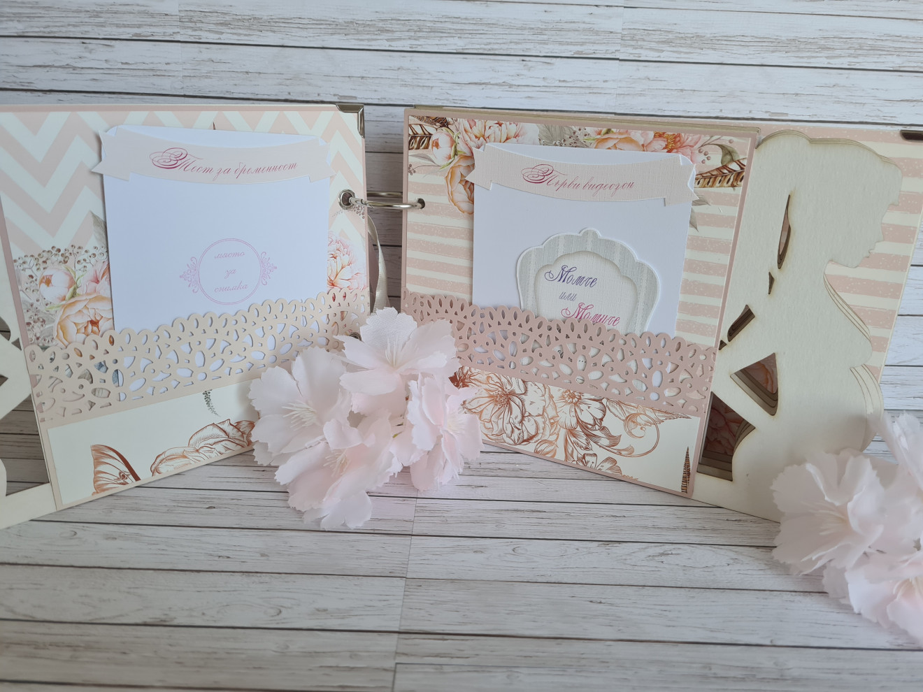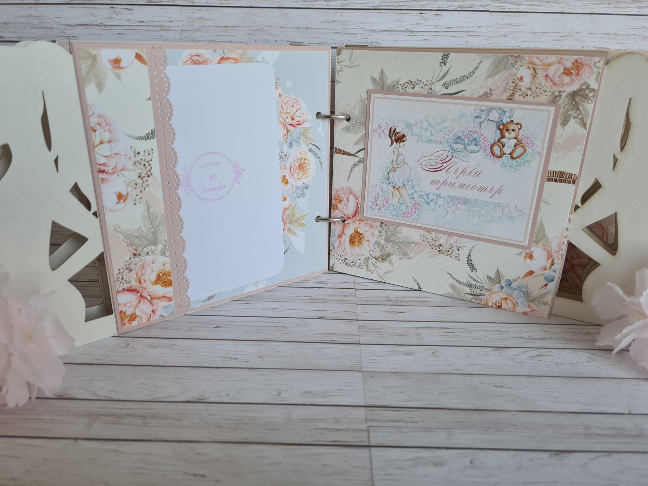 Дневник - албум за снимки и спомени, изцяло ръчна изработка с тематична декорация "Моята бременност" В него ще откриете различни страници с място за попълване на данни и спомени по време на Вашата бременност. Записки за всеки месец, снимки на тест за бременност, първи видеозон, снимки от всеки месец или всеки видеозон през цялата бременност. На последната страница има изработено мини албумче с място за записване на данните на бебето в деня на раждането му, както и първи снимки. Кутия за съхранение на теста за бременност, декорирана в тон с дневника и затваряща се с панделка. Дневника се персонализира според желанията и предпочитанията. Срок за изработка 7-10 дни За още идеи и предложения, посетете ни на https://www.facebook.com/Crafty.Treasures.Studio