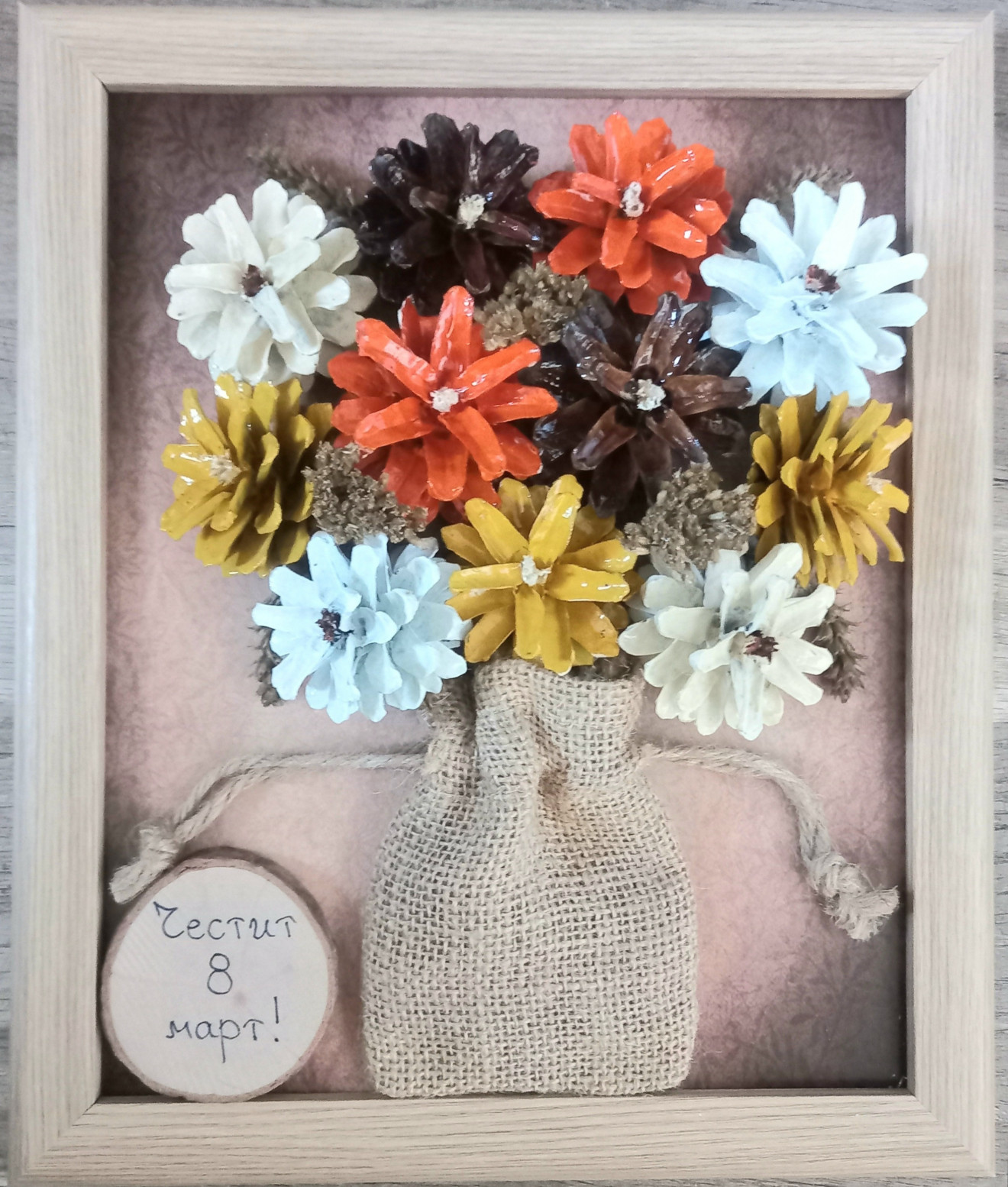 Пано с цветя от шишарки. Надпис по избор.