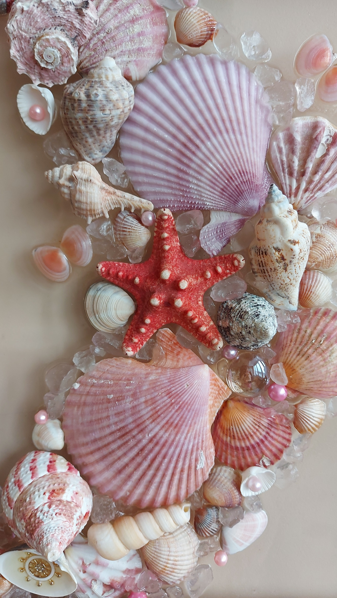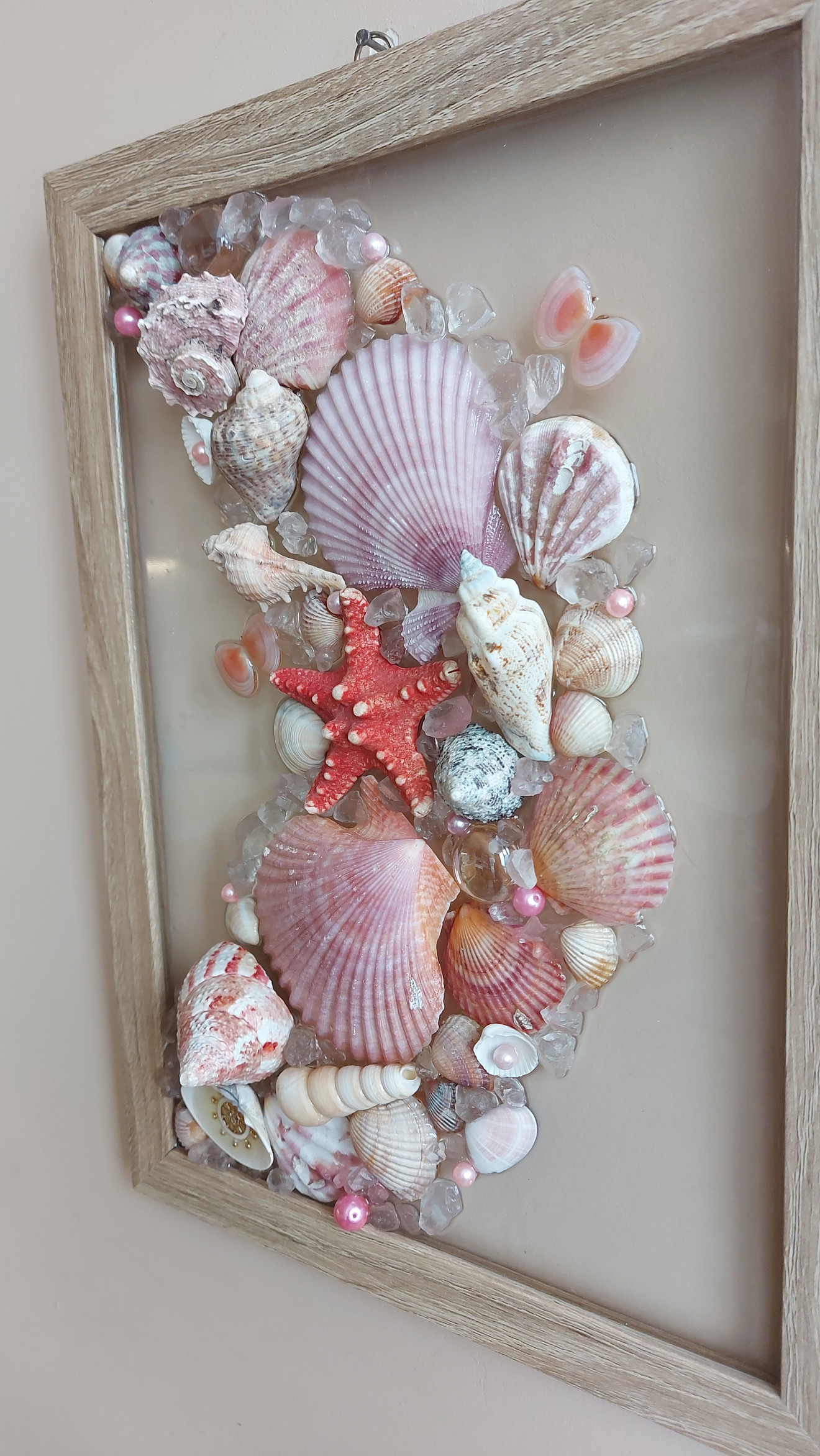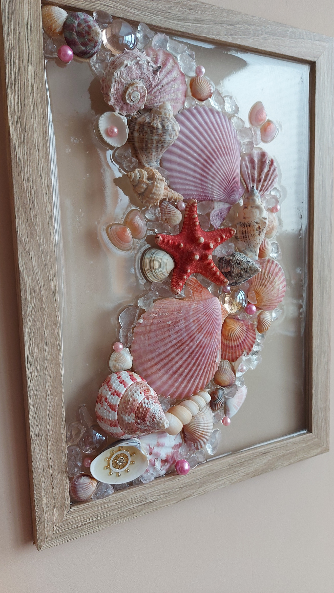 Картината е със стъклена основа. Размер 33/24 см. Декорация с епоксидна смола, морски раковини, камъчета, перлички...
