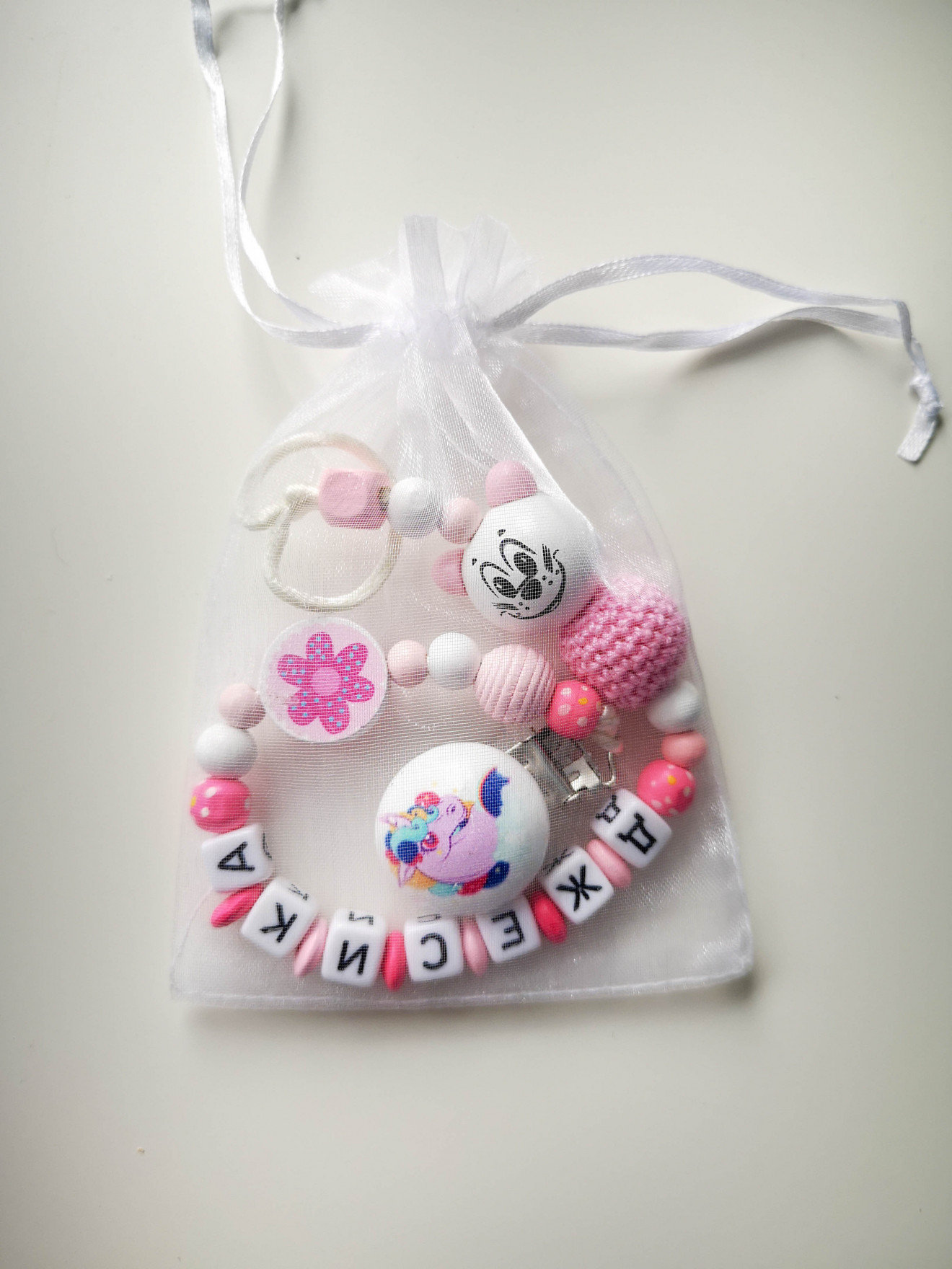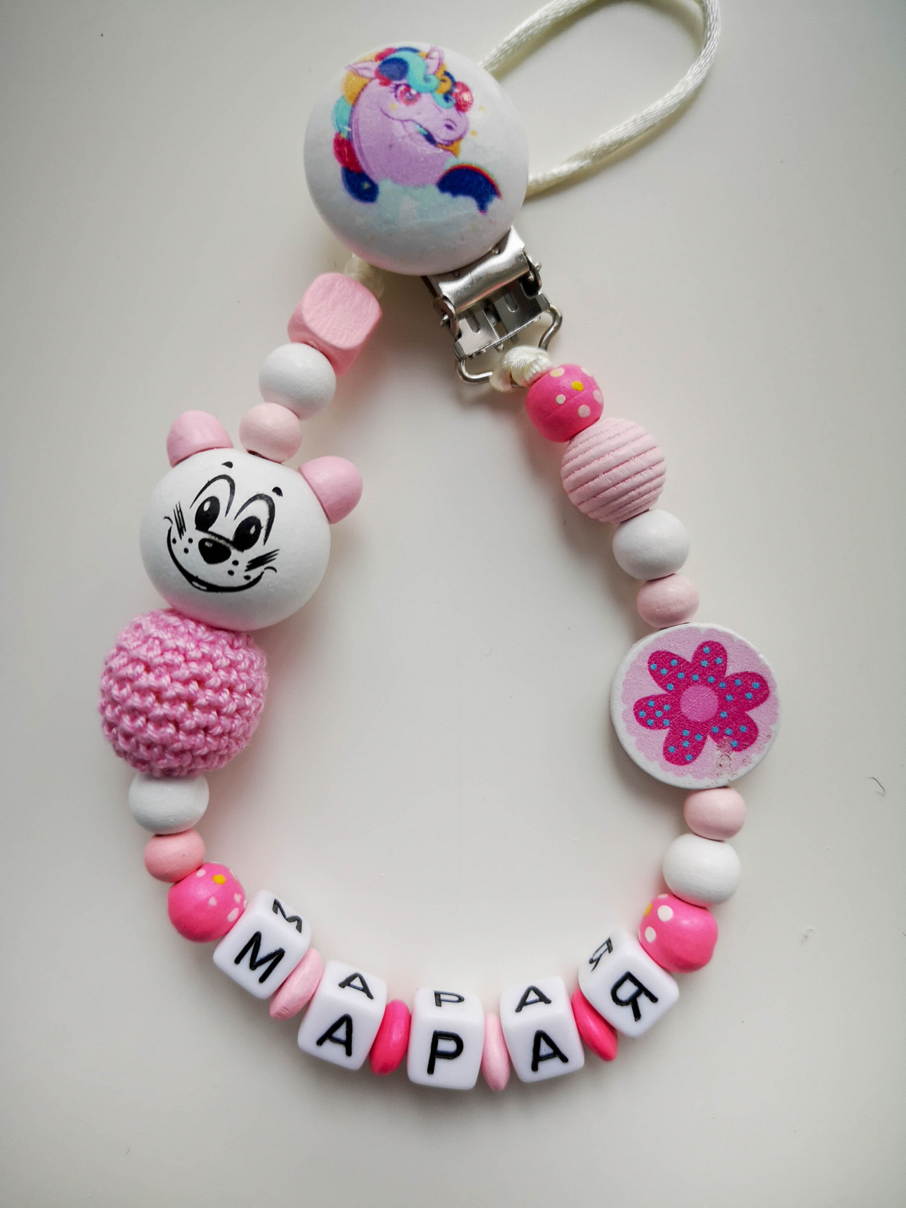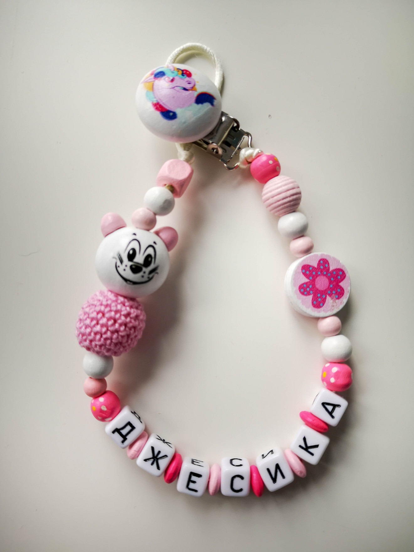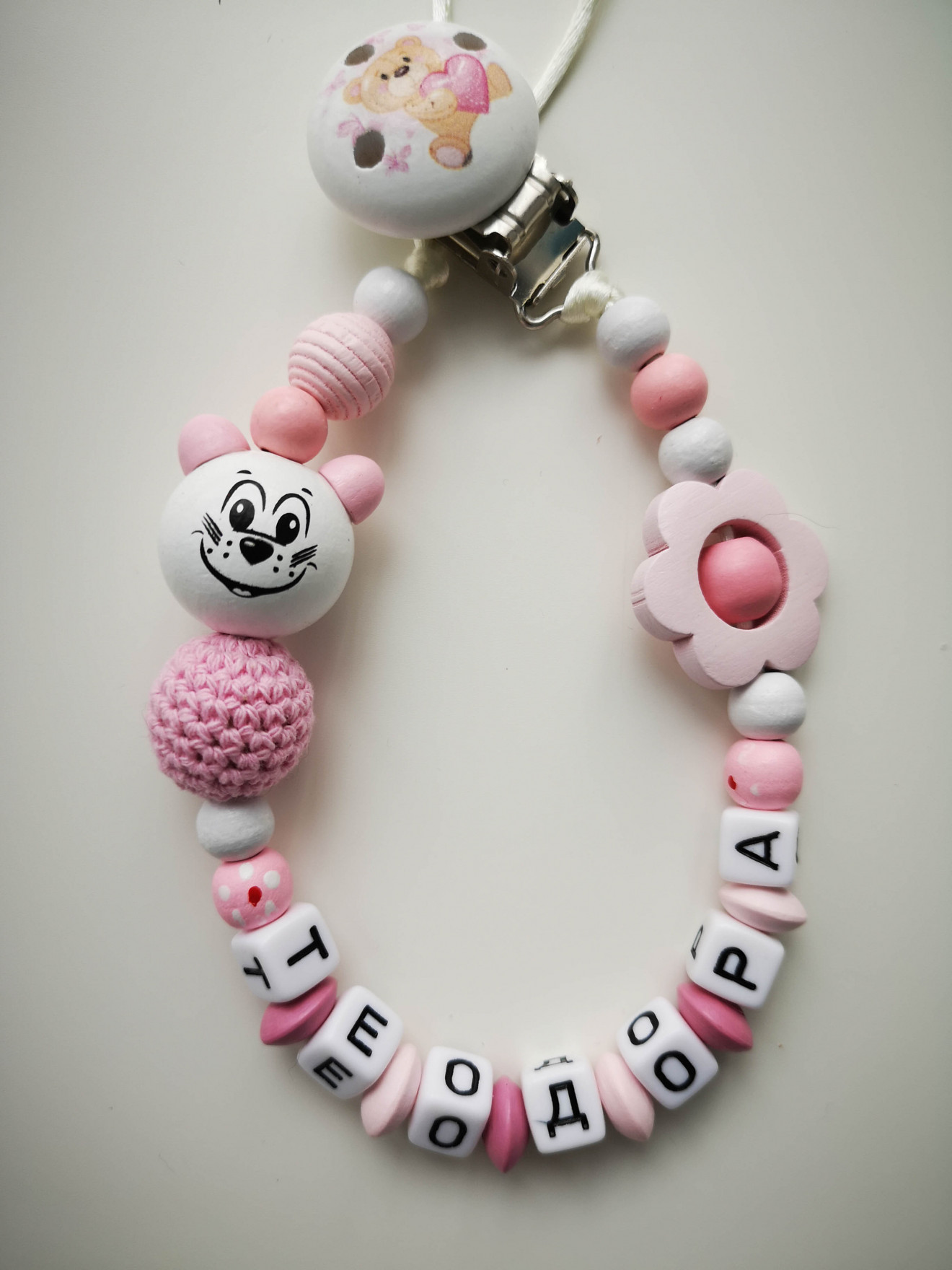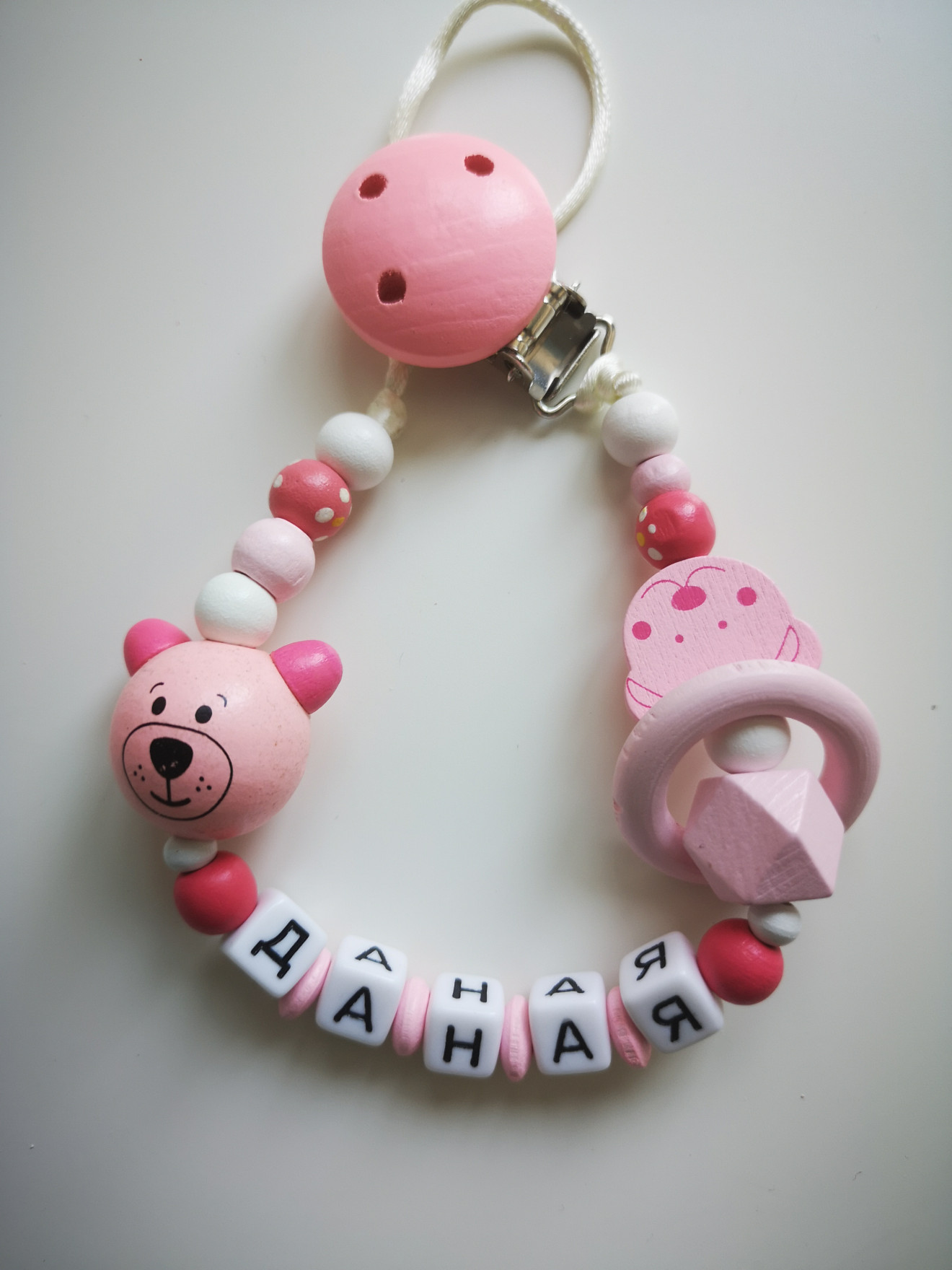 Дървен клипс за биберон или гризалка. Необходим аксесоар за всяко бебе. Отлично качество на материалите. Изработва се съобразно желанията на клиента. :) Подходящ за подарък, може да се комбинира с ключодържател с името на детето, бебешка визитка, фоторамка или друго. За повече информация, пишете на лично или посетете страницата https://facebook.com/HandmadeByYasnaBozhinova/