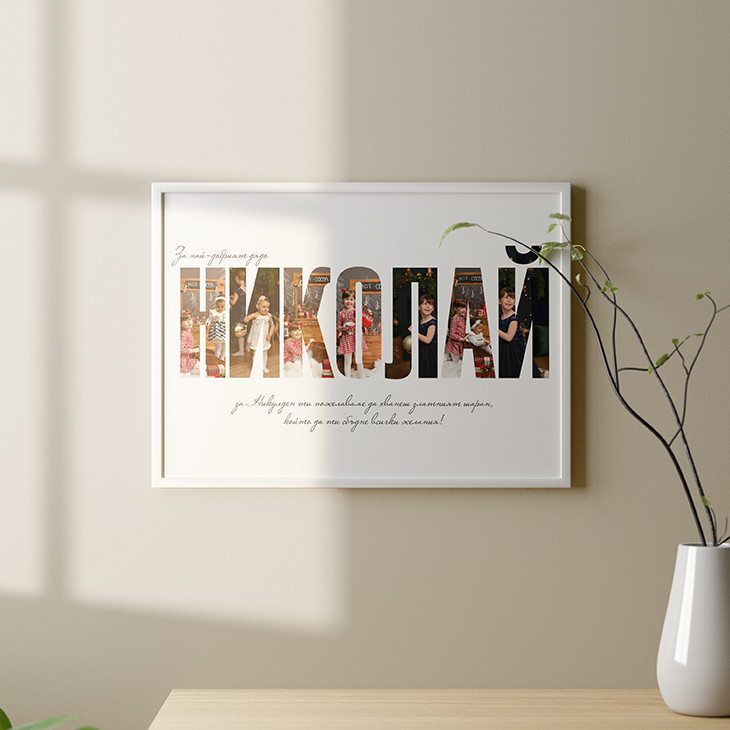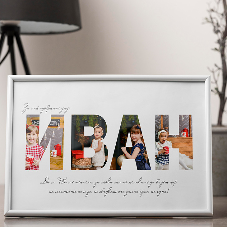 Колажът може да е с избрано от вас име. Под него се слага текст с пожелание Цени на постер на луксозна матирана хром хартия 300гр, с включена специална транспортна кутия за плакати: 21х30см - 14 лв. 30х40см - 18 лв. 50х70см - 25 лв. * При лично предаване, ако е без кутия, цената ще е минус 2лв. +2лв. ако желаете акварелен, перлен, ленен или друг скъп картон * Печатът се извършва в голяма столична печатница, не на домашен принтер, което гарантира ненадминато качество.