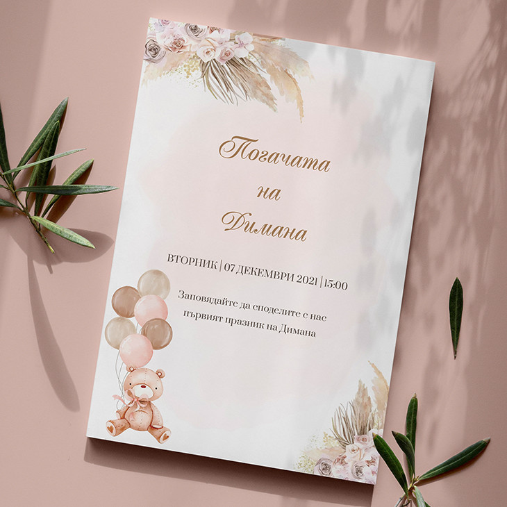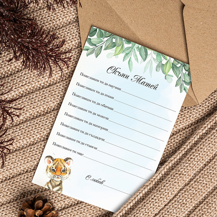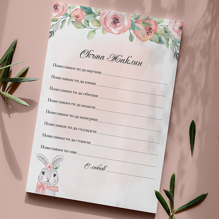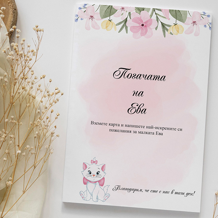 Карти за наричане за Погача на бебе. Картите се раздават на всички гости, за да може да пожелаят нещо на малкото бебе. След като всеки запише своите пожелания, картите може да се поставят в плик и да се приберат за спомен и след време да се предадат на порасналото вече дете. Темата избирате вие - цветове, елементи, герой и др.