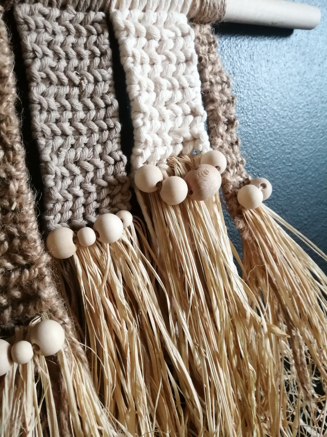 Бохо пано изработено от прежда макраме в съчетание със стръкове рафия.