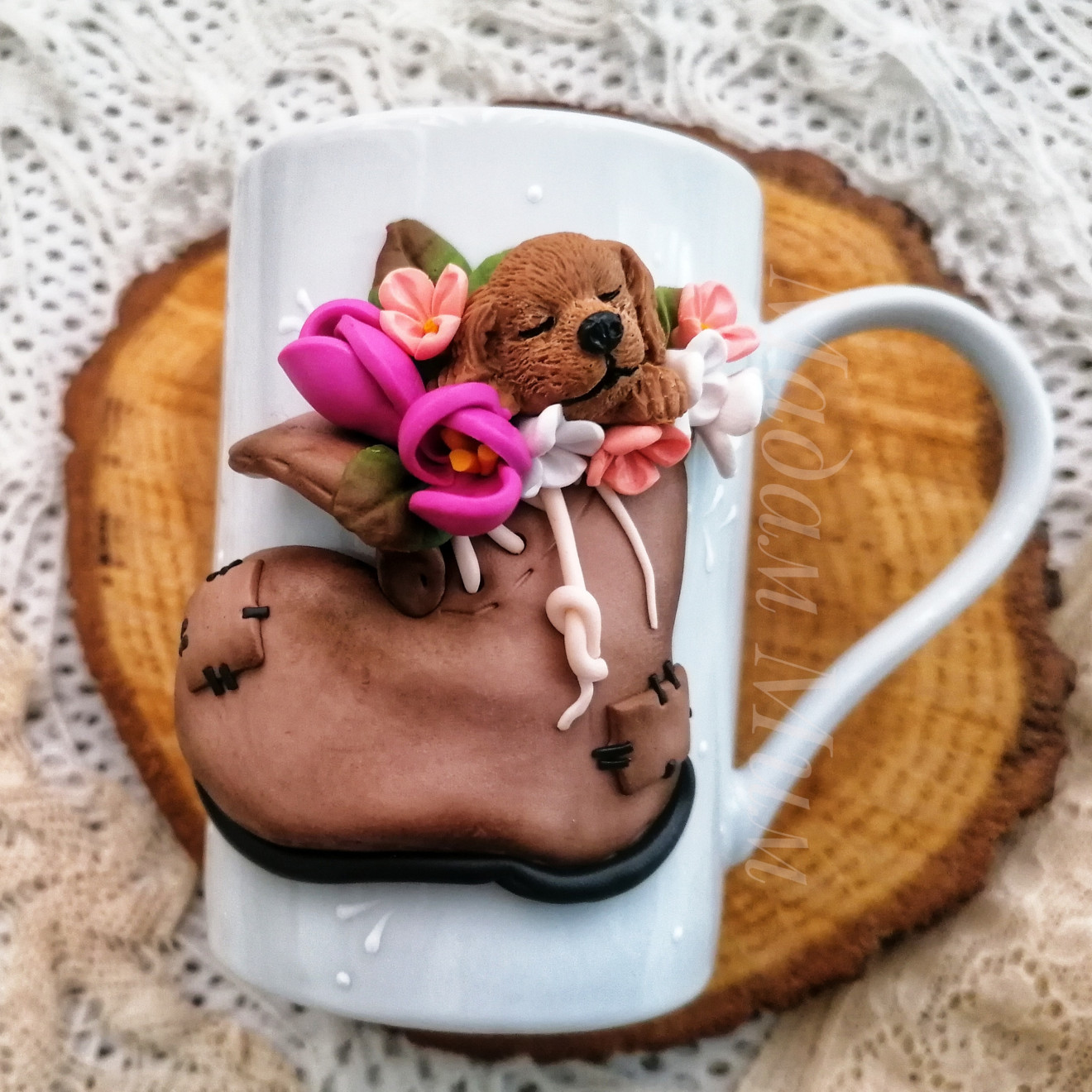 Ръчно декорирана чашка с полимерна глина. Чашата може да се ползва ежедневно, без да се поставя в миялна и микровълнова, миенето става на ръка. За актуален срок за изработка, пишете ми съобщение