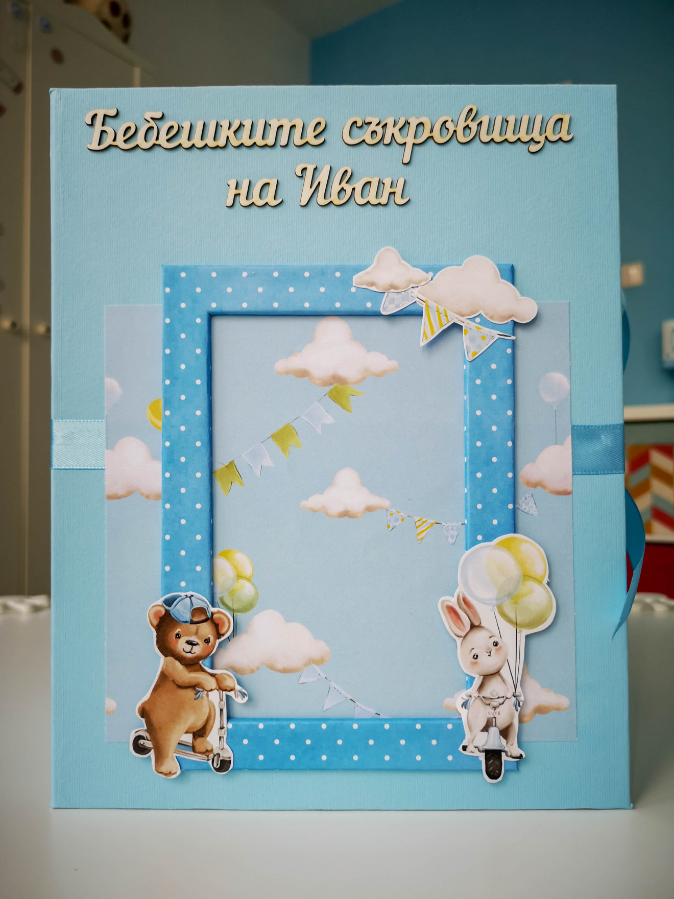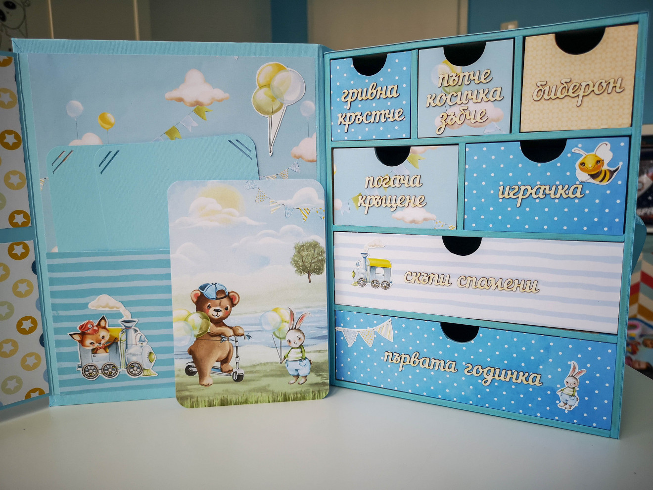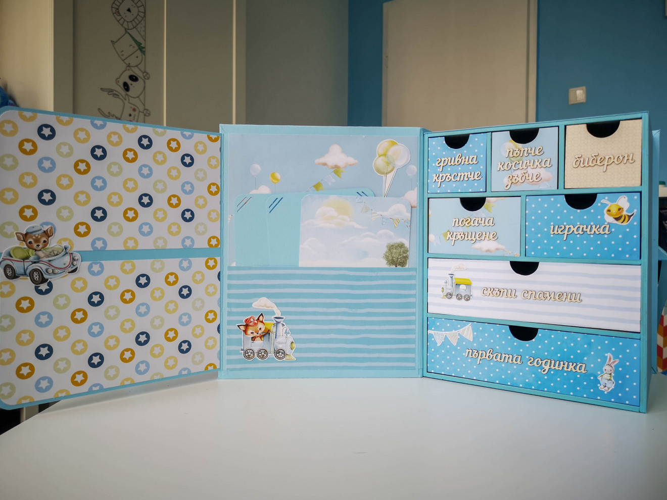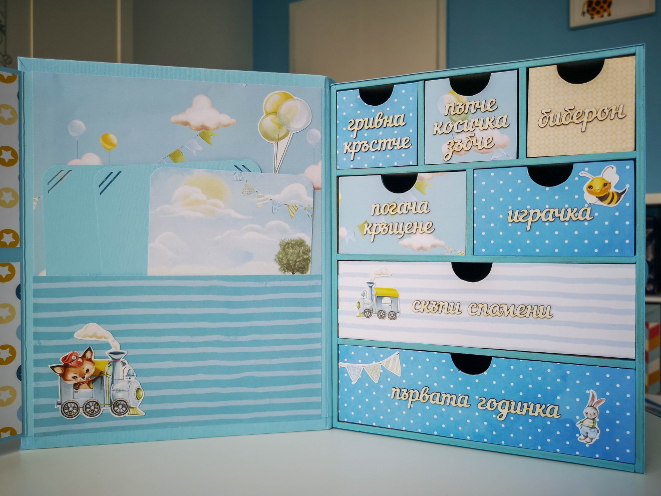 Една малко по-различна кутия за бебешки съкровища. Изработва се по поръчка и съобразно предпочитания ви, както за момиче, така и за момче. Дървена кутия, със седем чекмеджета. Пълна персонализация и надписване по ваш избор. Съдържа визитка с данните на бебето, място за 4 снимки и картичка с уникален дизайн. Има възможност за изработка на мини албумче за снимки от първата годинка и плик с картички за записване на данни от растежа. Срок на изработка 5 дни. За повече информация и поръчка, пишете ми или се обадете на посочения телефон. www.facebook.com/HandmadeByYasnaBozhinova/