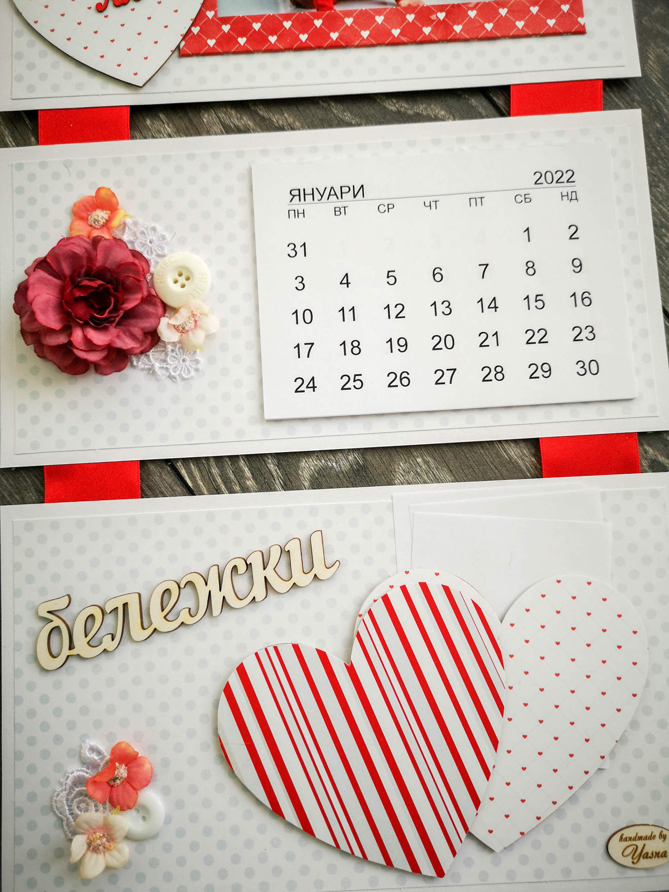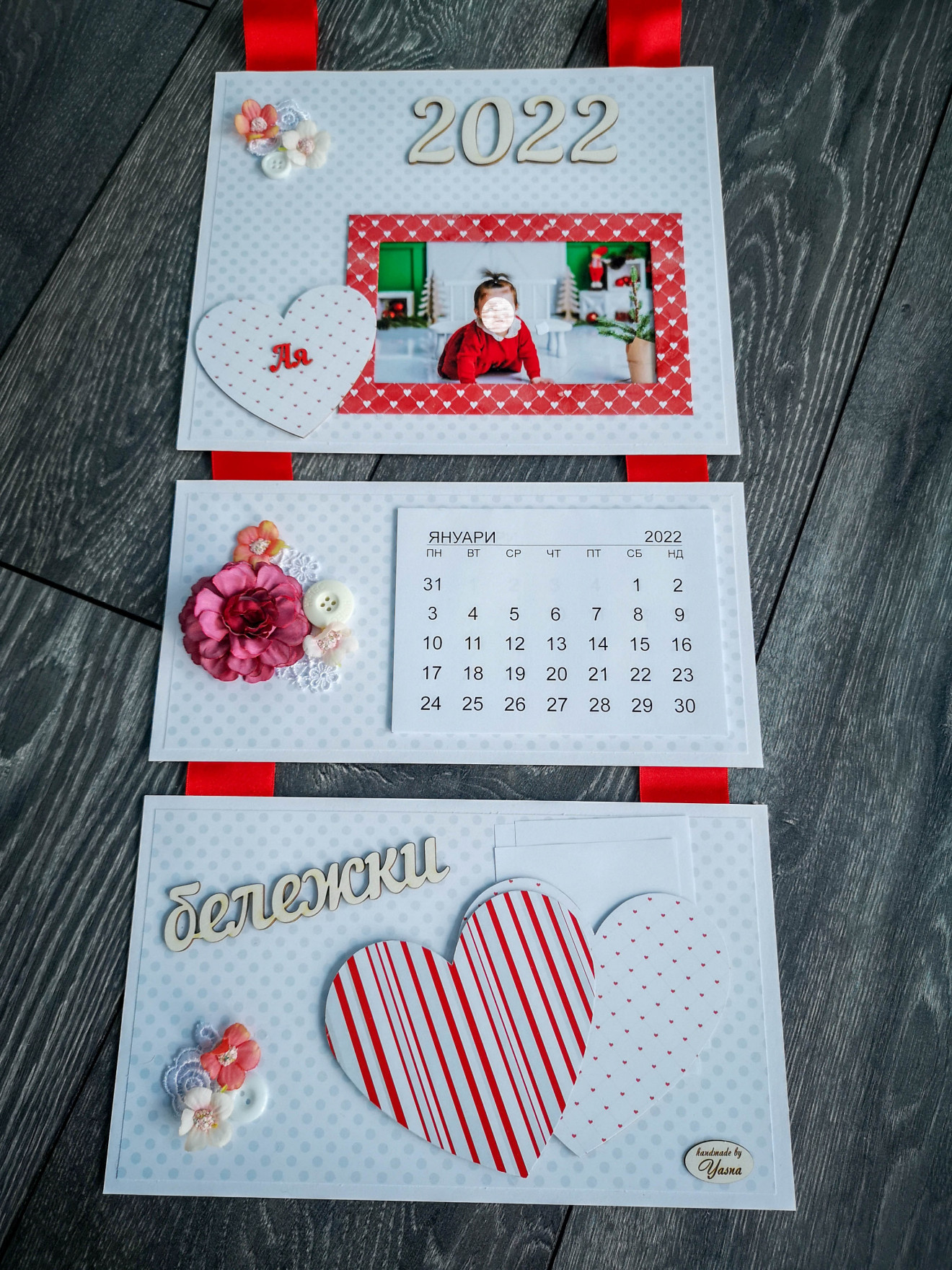 Ръчно изработен, дизайнерски календар. Прекрасно допълнение към интериора. Възможни са всякакви цветови комбинаци. Рамка за снимка с размер 10х15см. Заповядайте и да разгледате още от моите творения за бебете и деца на страницата ми https://facebook.com/HandmadeByYasnaBozhinova/
