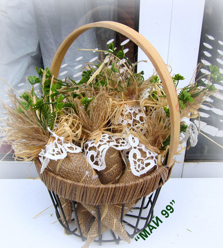 Ръчно изработени моркови от чувалено зебло,обшити със слама,памучна дантела,зелени детелинки и панделка слама с обща дължина 20-23 см.Цената е за 1 бр