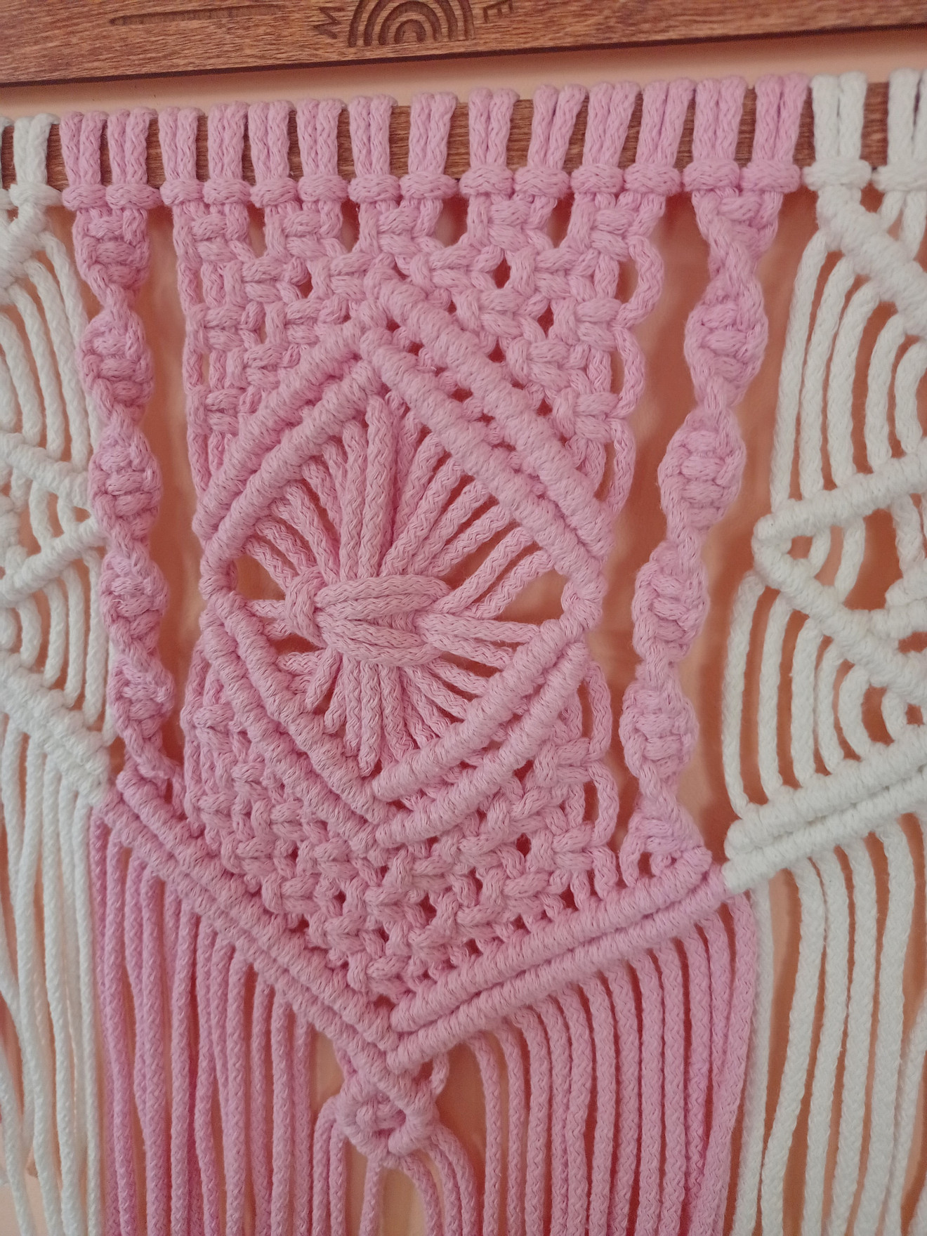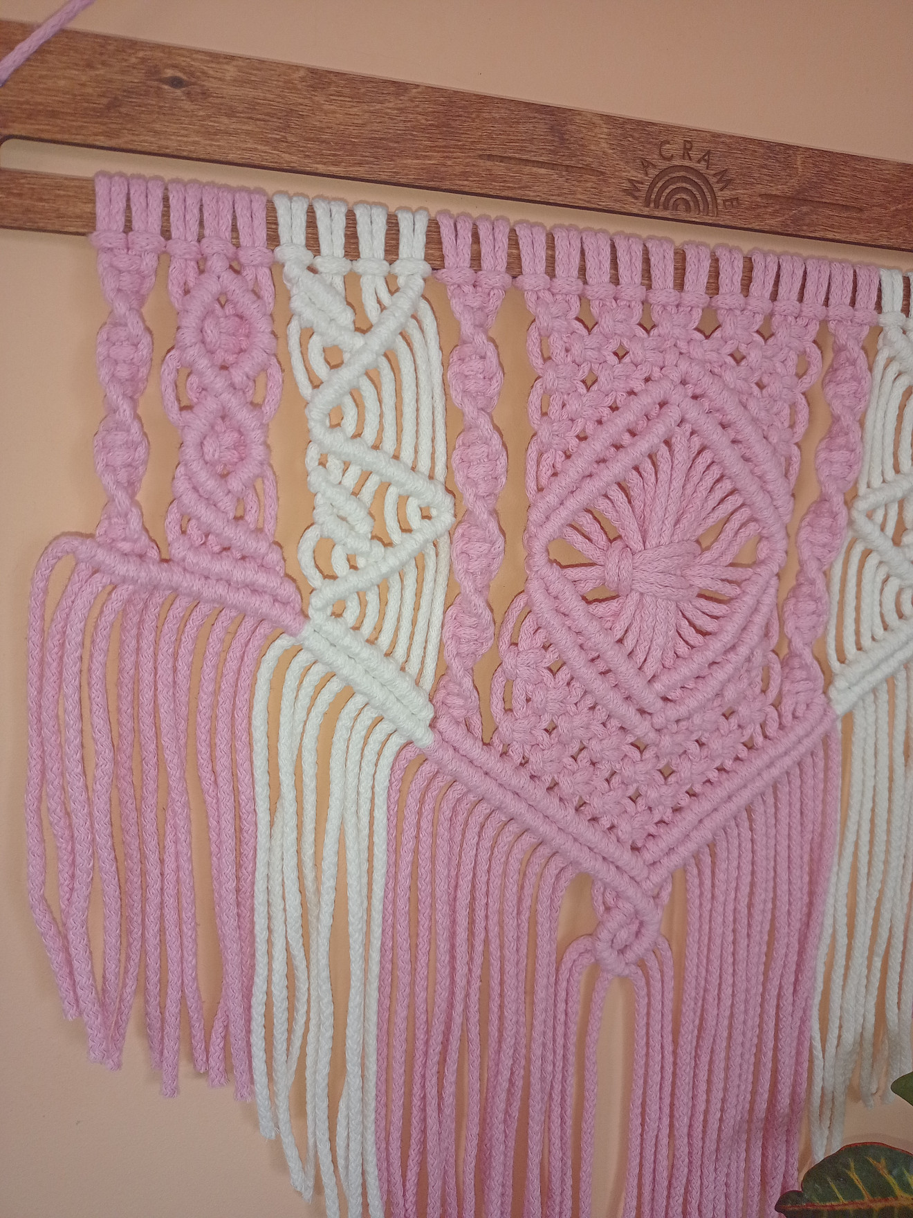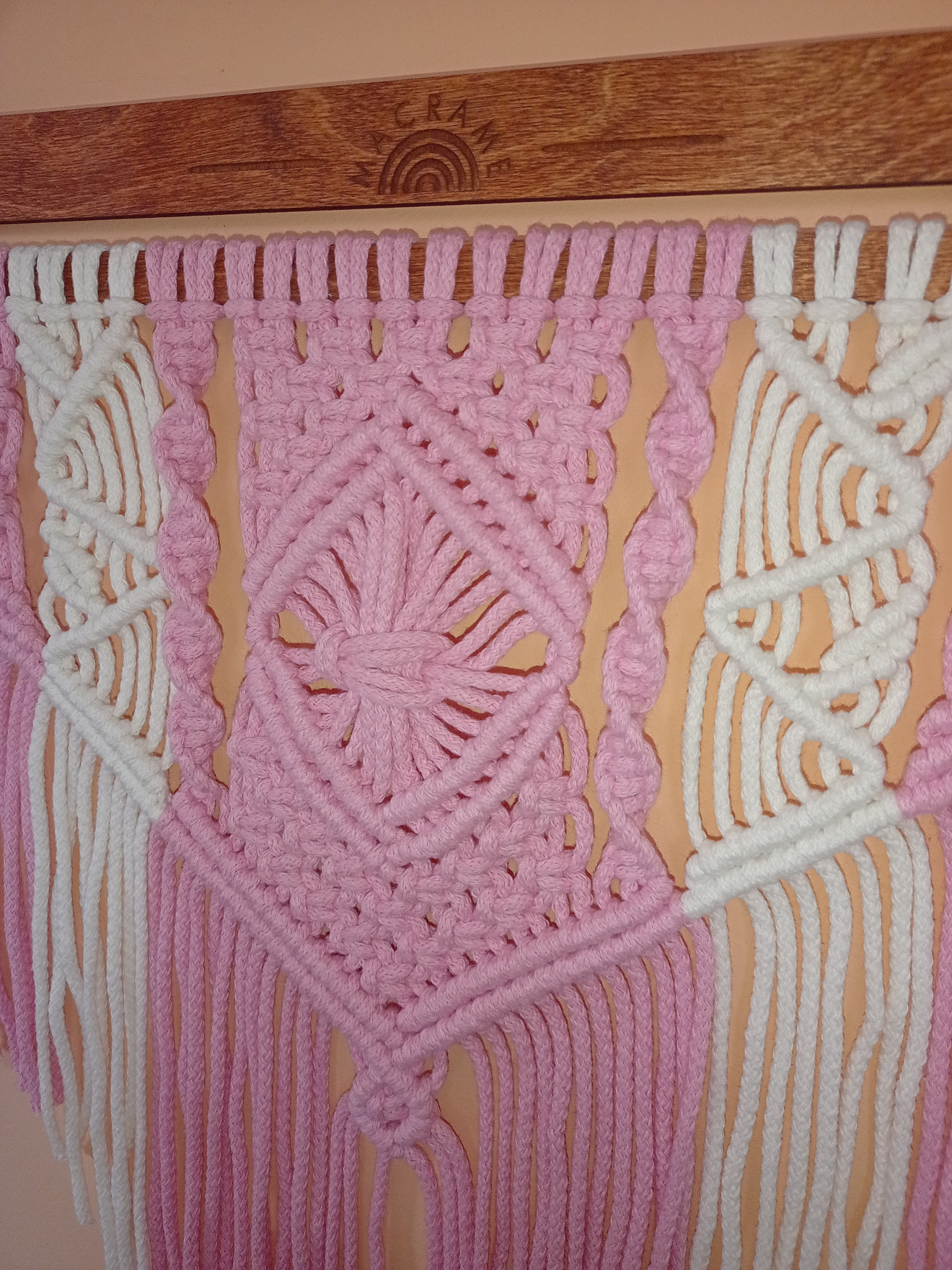 Пано в розово-бялата гама, изплетено на дървен държач - 50 см дължина. Подходящо за уютна трапезария като акцент или към стила на някоя спалня в тези нюанси. #макраме #декоративнопано #пано #подаръкзадома #уют #декорациязастена