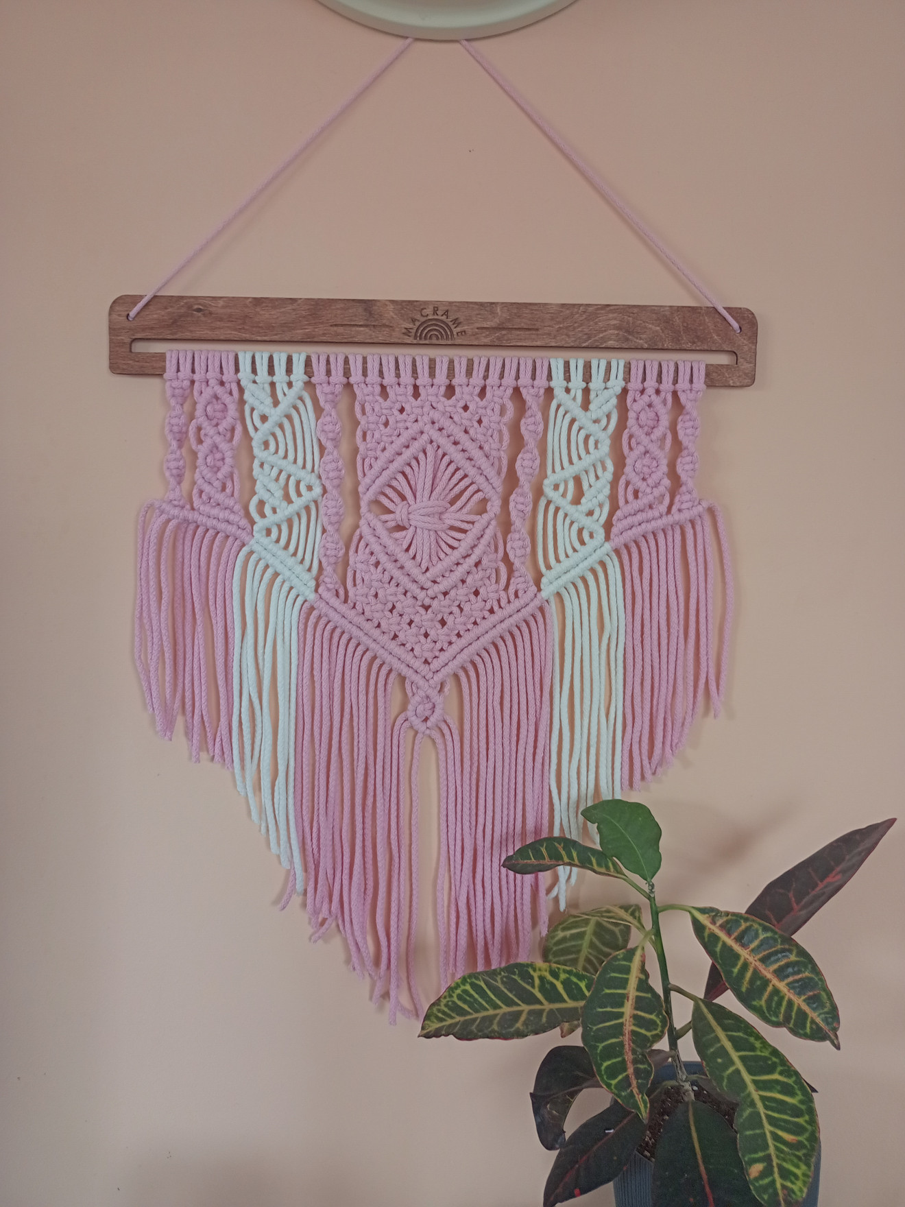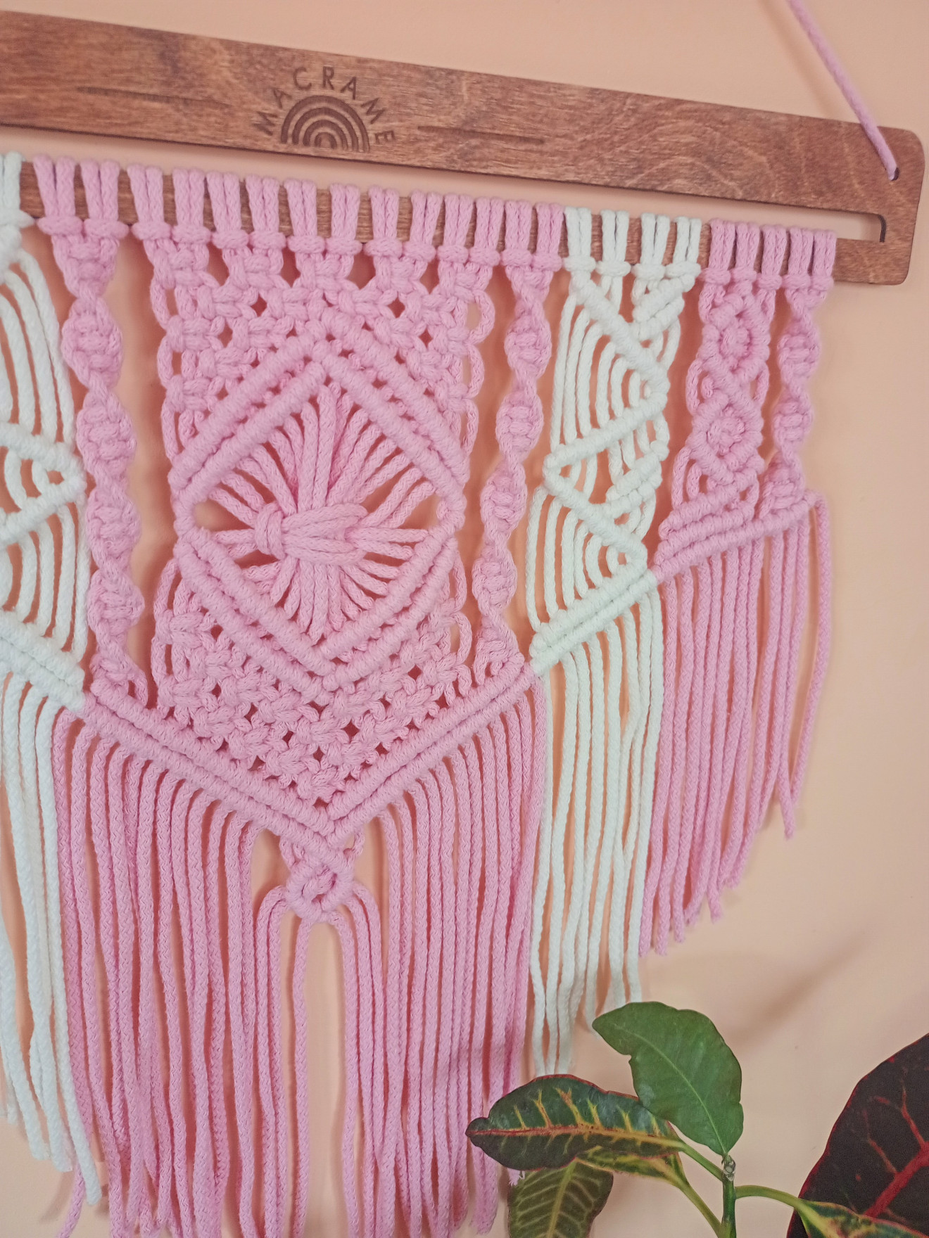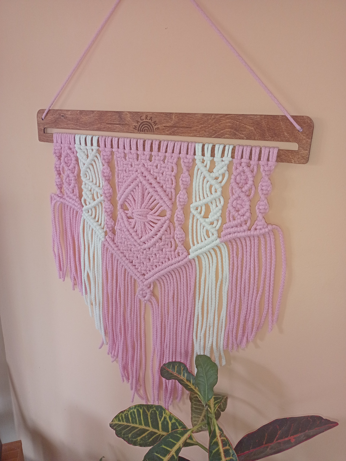 Пано в розово-бялата гама, изплетено на дървен държач - 50 см дължина. Подходящо за уютна трапезария като акцент или към стила на някоя спалня в тези нюанси. #макраме #декоративнопано #пано #подаръкзадома #уют #декорациязастена