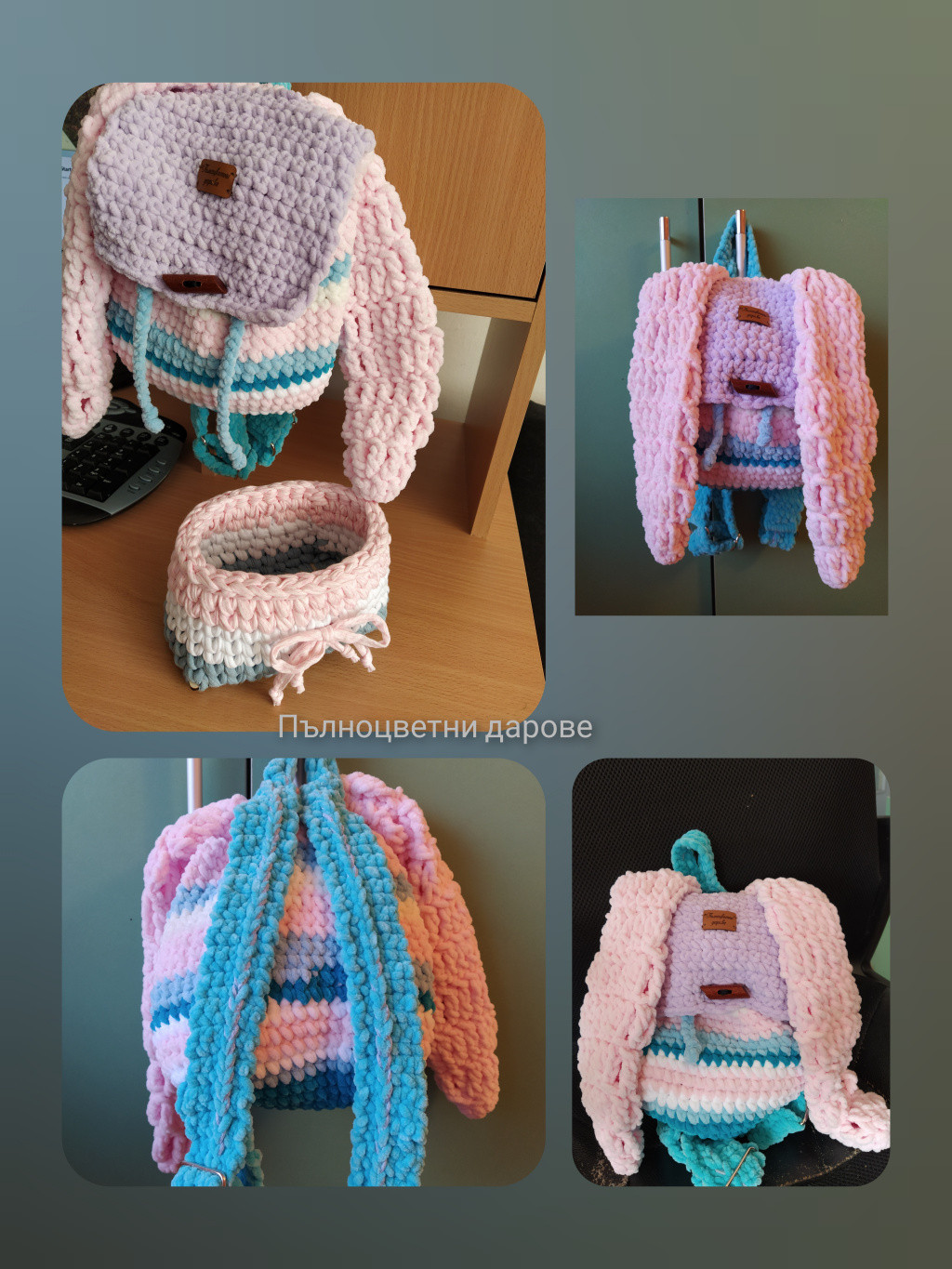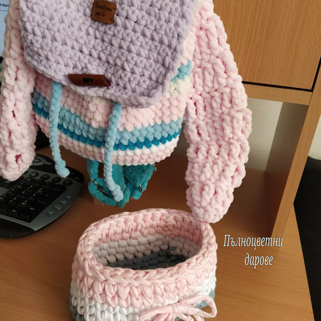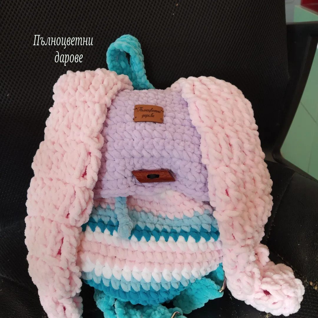 Плетена плюшена раничка в цвят нежно розово, лилаво, синьо и бяло. Раничката се пере в пералня при 30 градуса и най-слаба центрофуга. Има подплата и регулируеми дръжки. Подходяща е за деца на различна възраст. Можете да изберете цветове на преждата и подплатата. И също различен размер от посочения. Цена на раничка без ушички - 30 лв., със заешки уши - 35 лв. Децата им се радват и са чудесен подарък за рожден ден. Срок за изработка - 7 работни дни, след приемане на поръчка. #ръчнаизработка #ръчноправени #творя #бгтворци #мамаибебе #подаръкзамомиче #дете #деца #задете #подаръкзадете #ръчноизработен #рожденден #детски #детскистоки #детскиаксесоари #детскирожденден #момиче #момиченце #уникаленподарък #попоръчка #плетеначанта #crochetbags #бгтворци #плетена #раница #раничка #ръчноизработенподарък #ръчнаизработка #ръчноправени