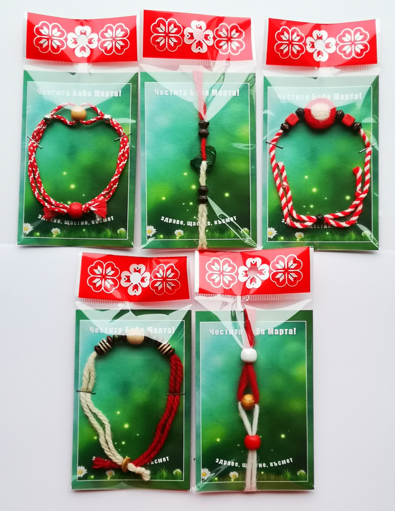 Мартеници гривни, изработени с различни елементи, включая вълнени по метода иглонабиване