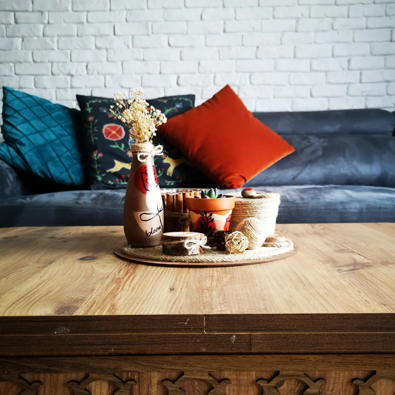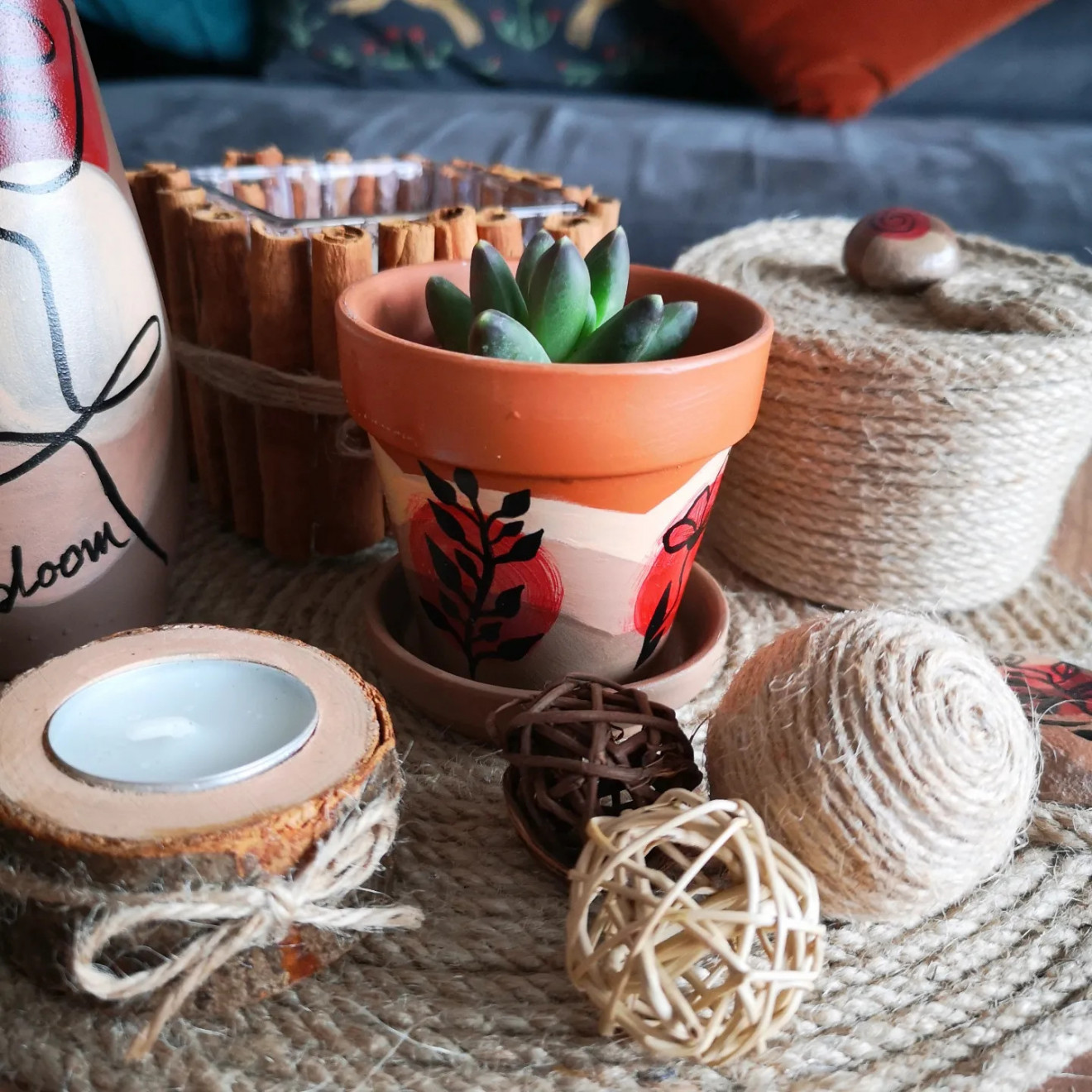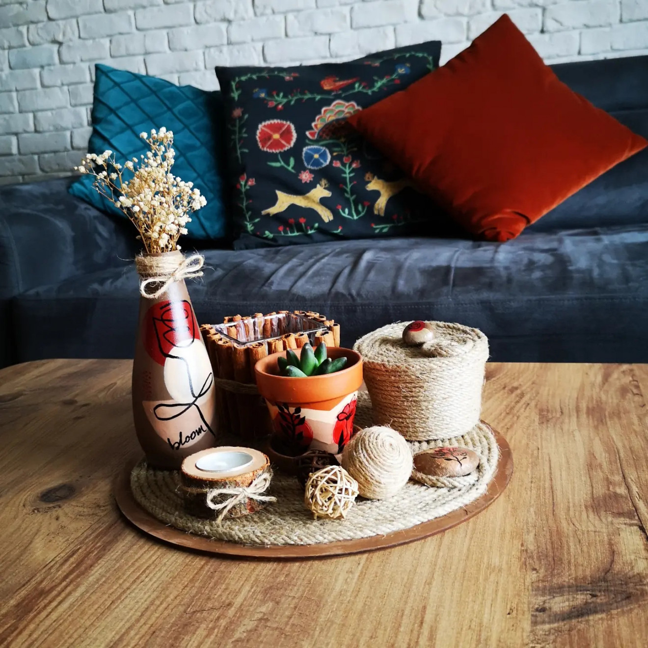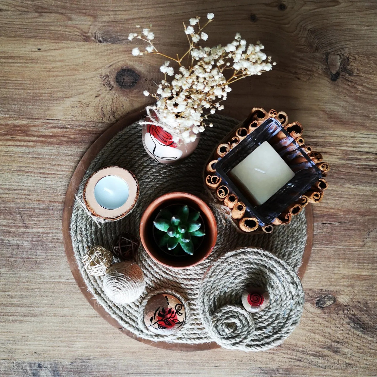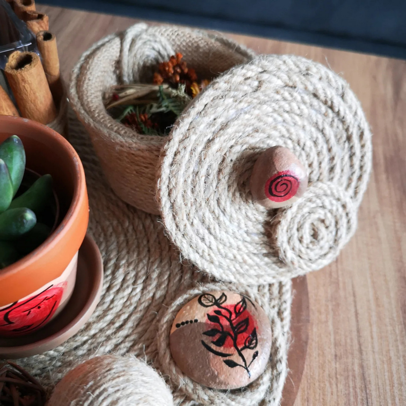 Авторски ръчно изработен поднос от юта и рисувани камъни включващ различни декоративни елементи. Това е серията "Be My Muse" от Muzi's Rocks Handmade. Този поднос от юта може да служи както за сервиране и поднос на масата, поставка за плодове, свещи и други декоративни аксесоари, така и като пано на стената. Оригиналната шарка и естествения материал го правят и много подходящ акцент за стена. Може да бъде съчетан и с други декоративни елементи по ваш вкус и цвят по избор от същата серия.