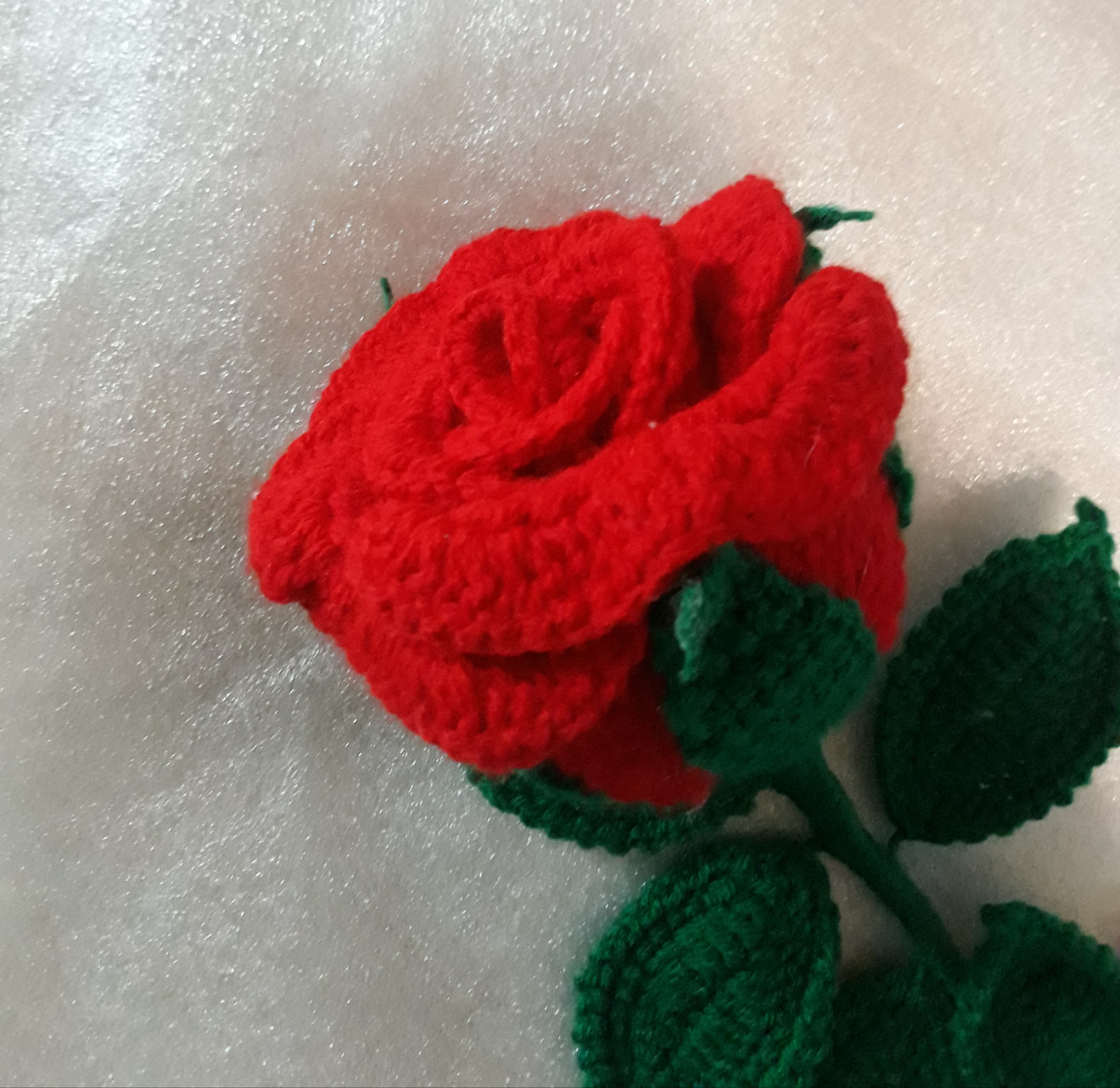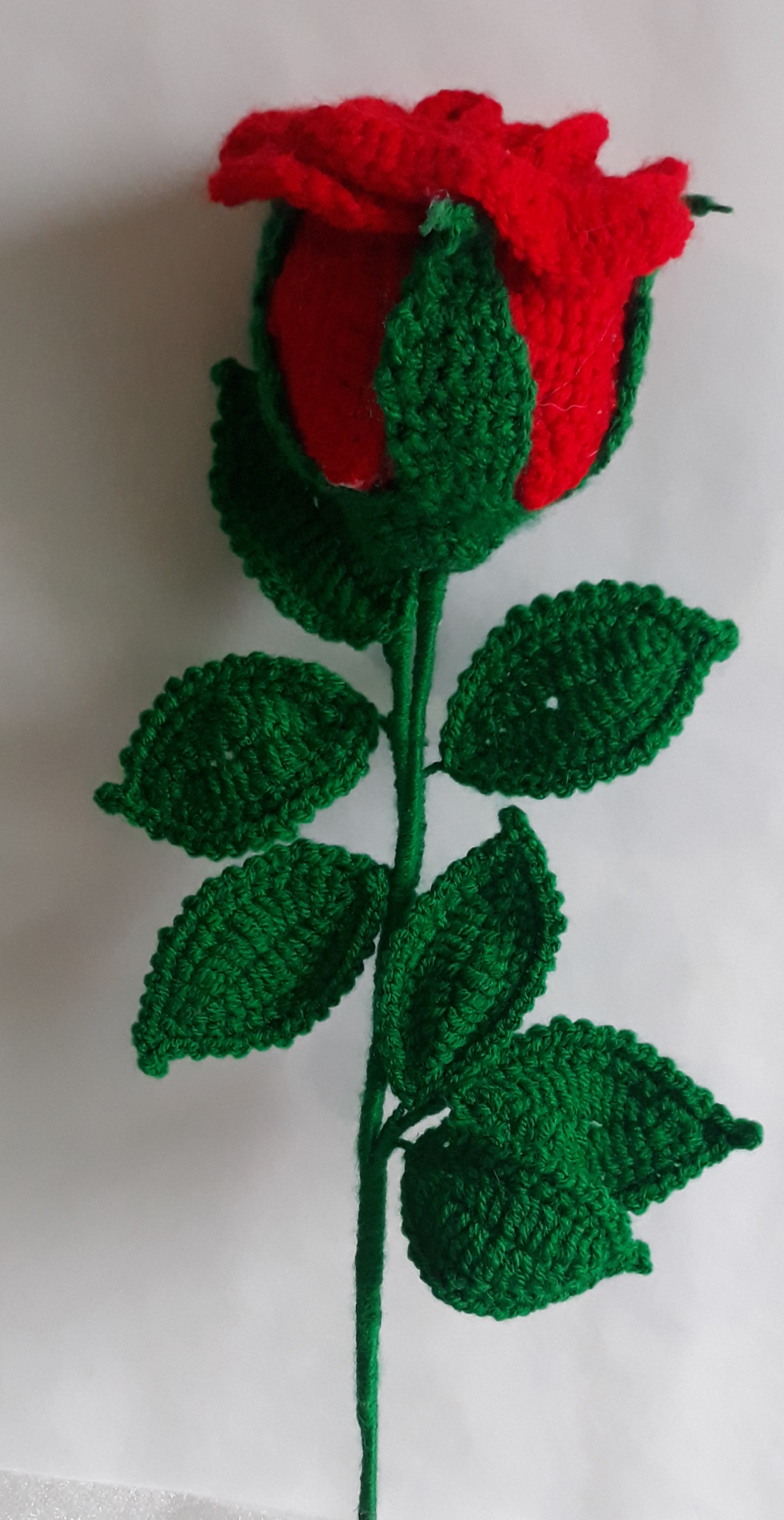 Изплетена на една кука. Подходяща за всеки повод или просто за мил към любим човек. Дължина на розата - 50см. Големина на чашката - 8см. Розата може да се изплете в желания от вас цвят.