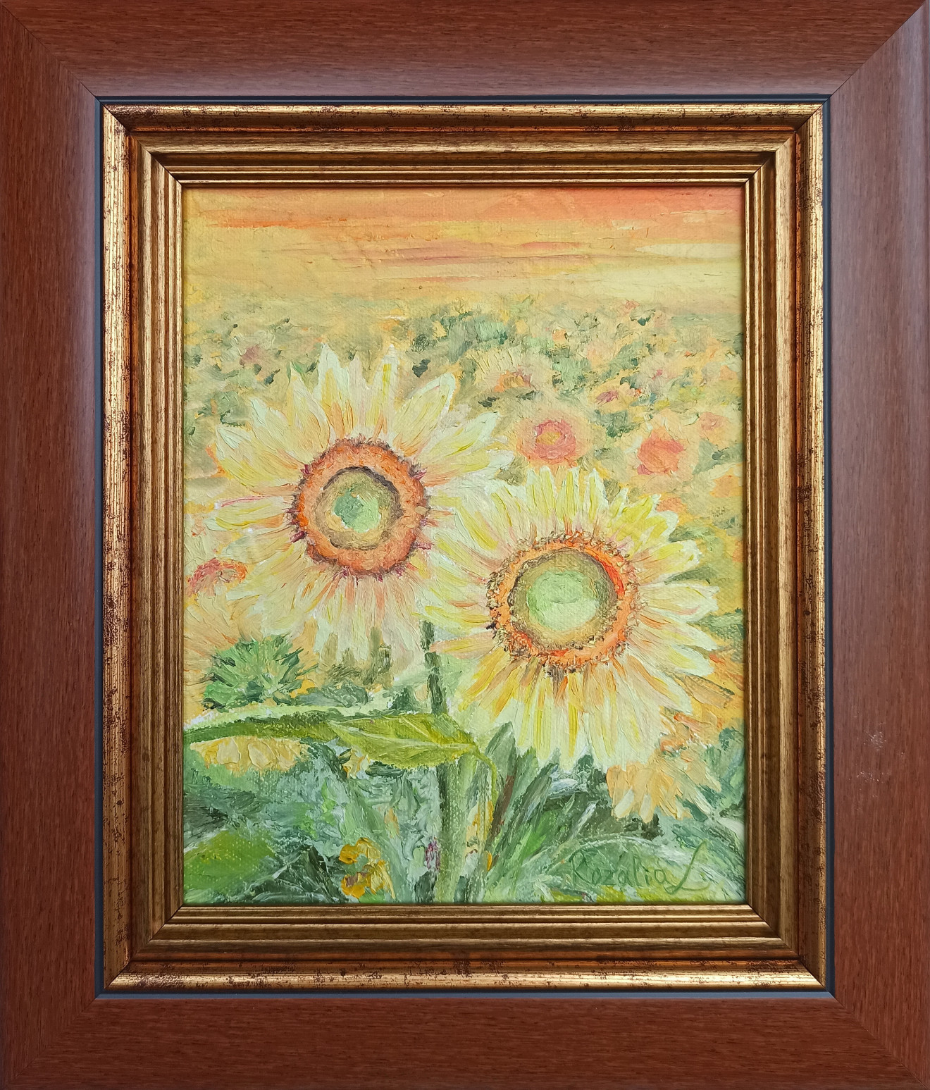 Прегръдка, 20/25 см, масло върху платно Всеки път, щом затворя очи, твоят образ във мене изплува и потапя ме в сладки мечти... без пространства и време пътувам. Всеки път щом протегна ръце... знам, че някак до тебе достига всеки удар на мойто сърце и дълбоко във тебе попива. А когато...във мен закрещи, от бездомност и глад изтощена..., пак спасяваш душата ми Ти, със онази прегръдка...за мене. Rozalia L