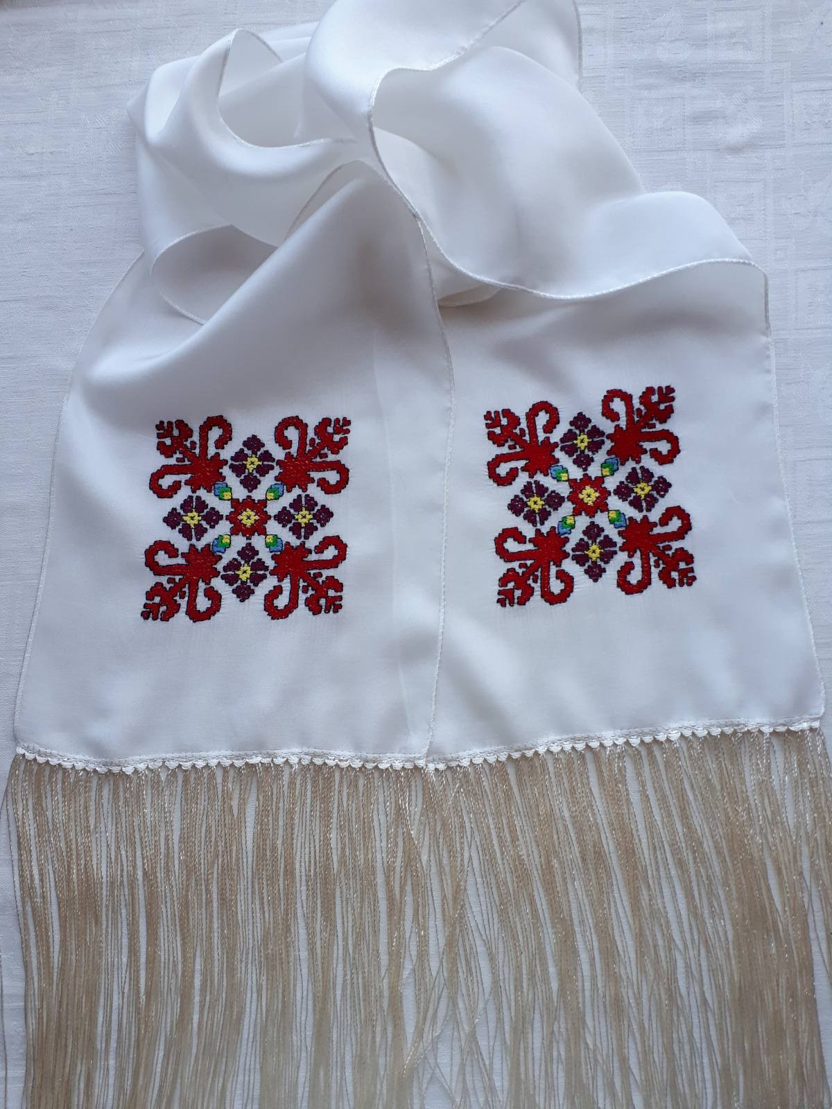 Уникален ръчно бродиран копринен шал с български мотив! Изработен с копринени конци и копринени ресни. Ширина на шала 18 см, дължина с ресните 170 см. Бъдете красиви!