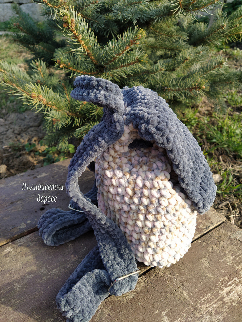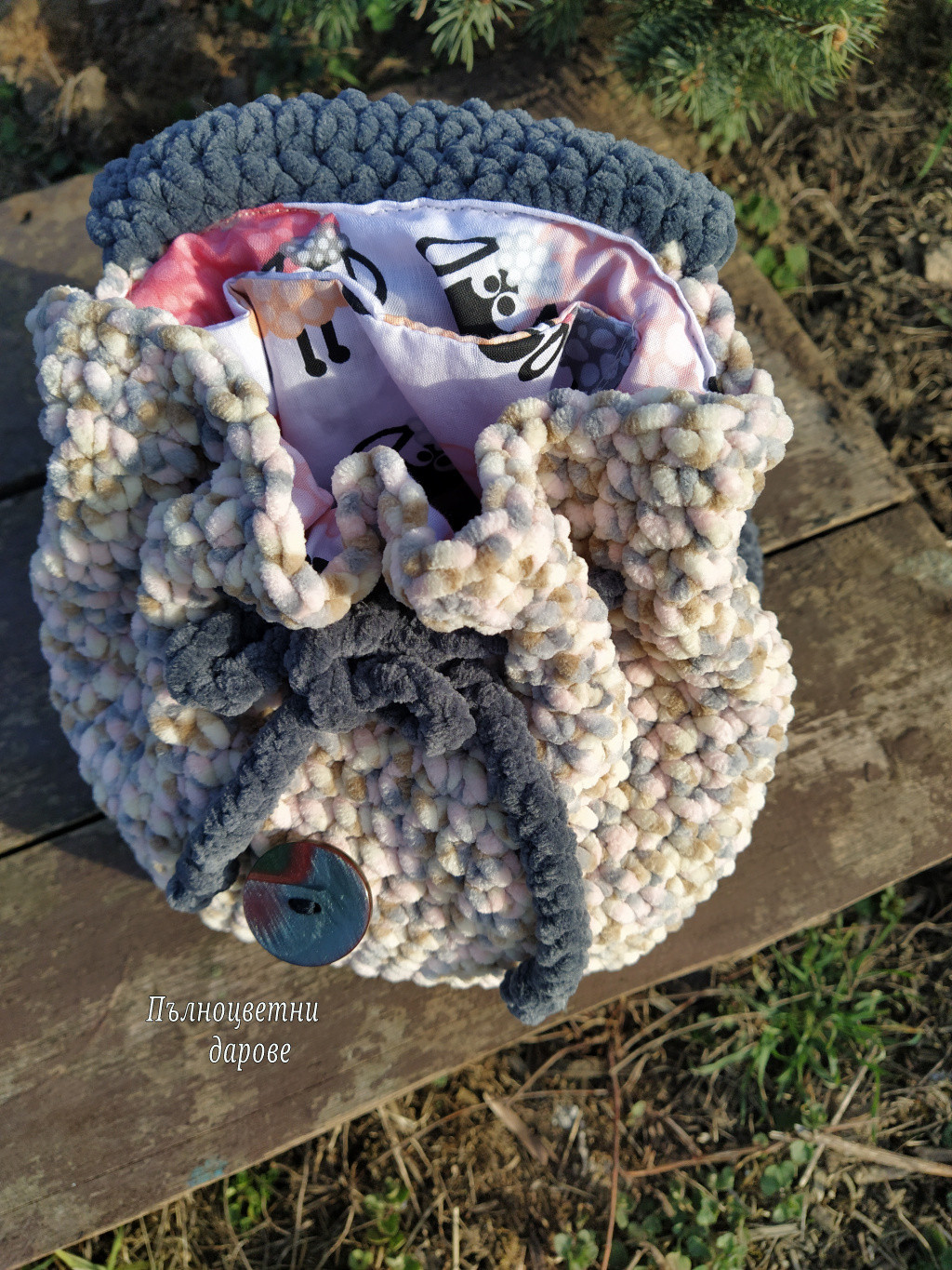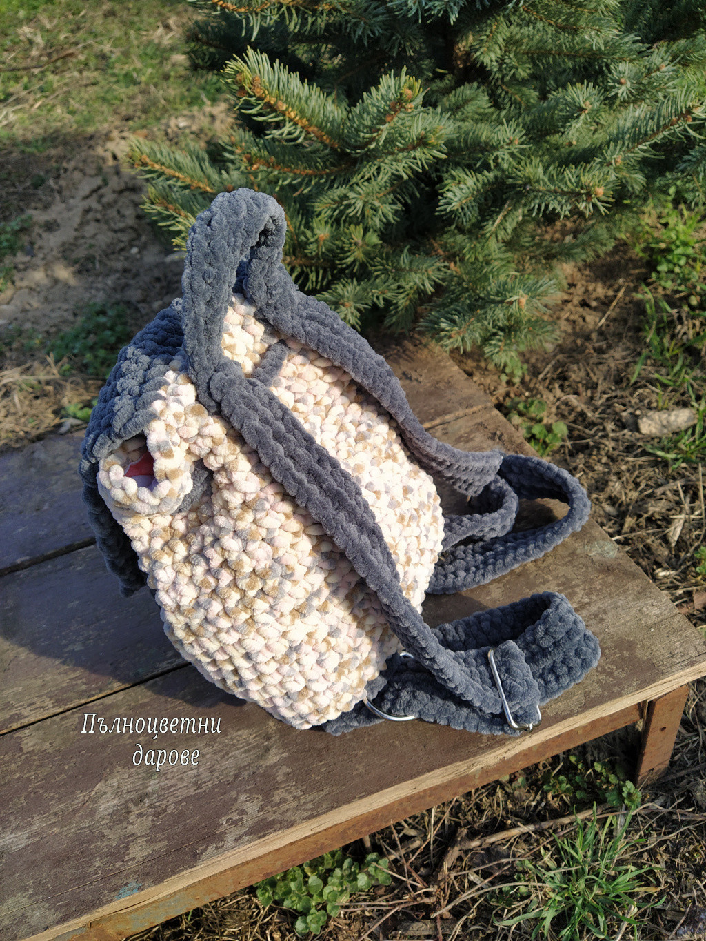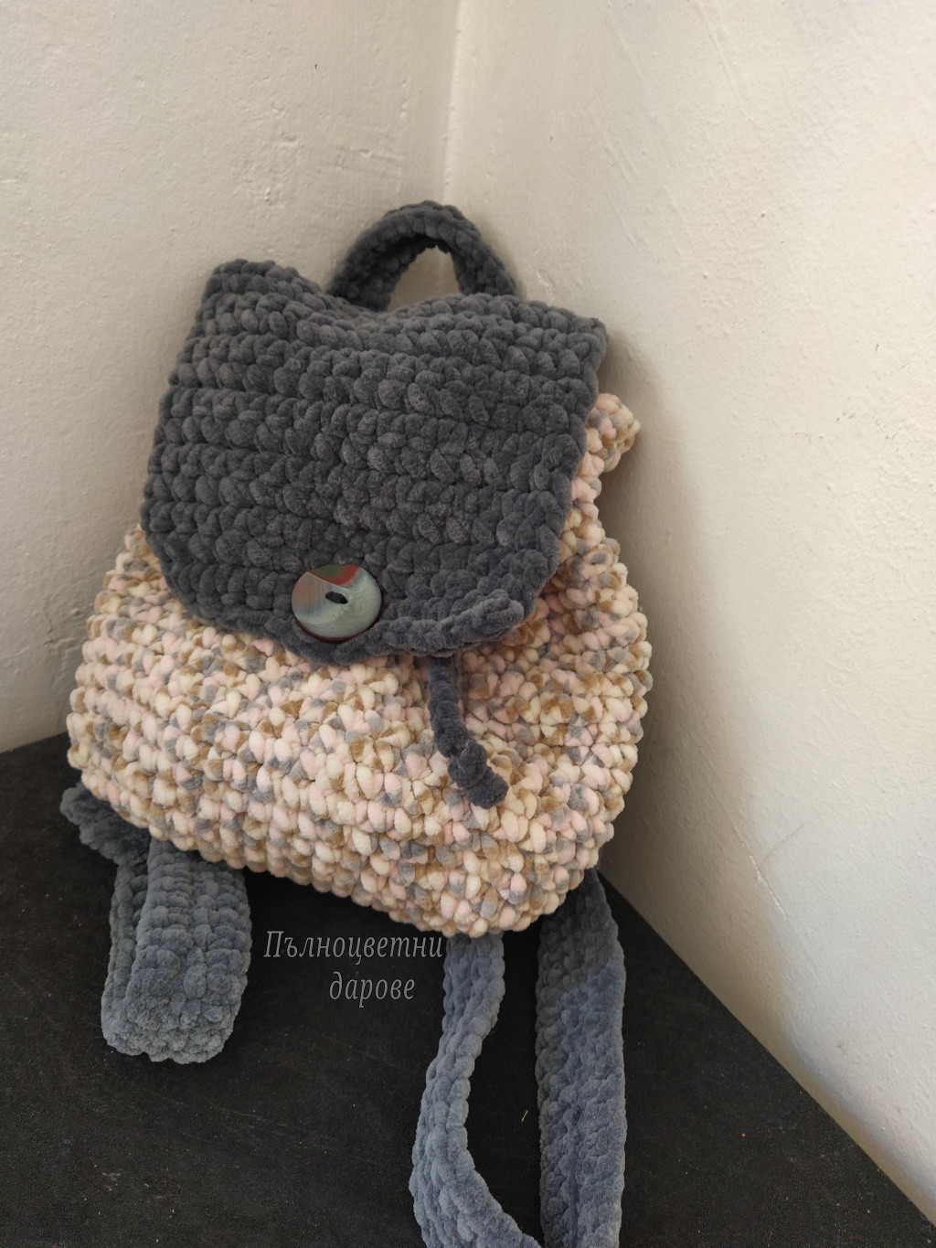 Плюшена раничка. ⛵ Има подплата с голям вътрешен джоб, който събира бутилка за вода 0.500 л. ? Размери - височина около 27 см., ширина около 24 см. ? Регулируеми дръжки и закопчаване с копче. ?️ Може да се пере в пералня. ? Подходяща е за ясла или детска градина. Пишете, ако е за тази цел. Ще добавим торбичка за пренасяне и съхранение на обувки. ? По-големите деца също ги харесват, защото са мекички и събират достатъчно. ? Много са леки и меки. ? Чудесен и полезен подарък за рожден ден. ? В творенията ще откриете и други модели и цветове. #ръчнаизработка #ръчноправени #творя #бгтворци #мамаибебе #подаръкзамомиче #дете #деца #задете #подаръкзадете #ръчноизработен #рожденден #детски #детскистоки #детскиаксесоари #детскирожденден #момиче #момиченце #уникаленподарък #попоръчка #плетеначанта #crochetbags #бгтворци #плетена #раница #раничка #ръчноизработенподарък #ръчнаизработка #ръчноправени #подкрепямбългарскиятворец #пълноцветнидарове