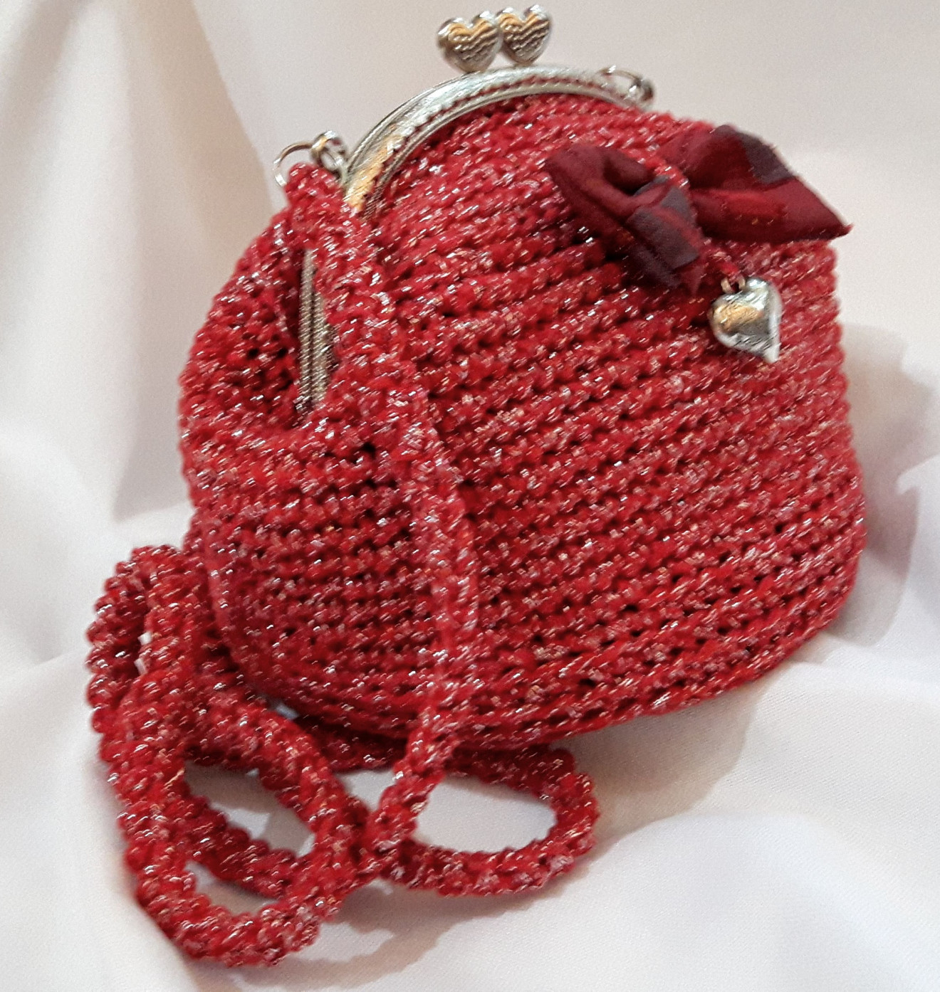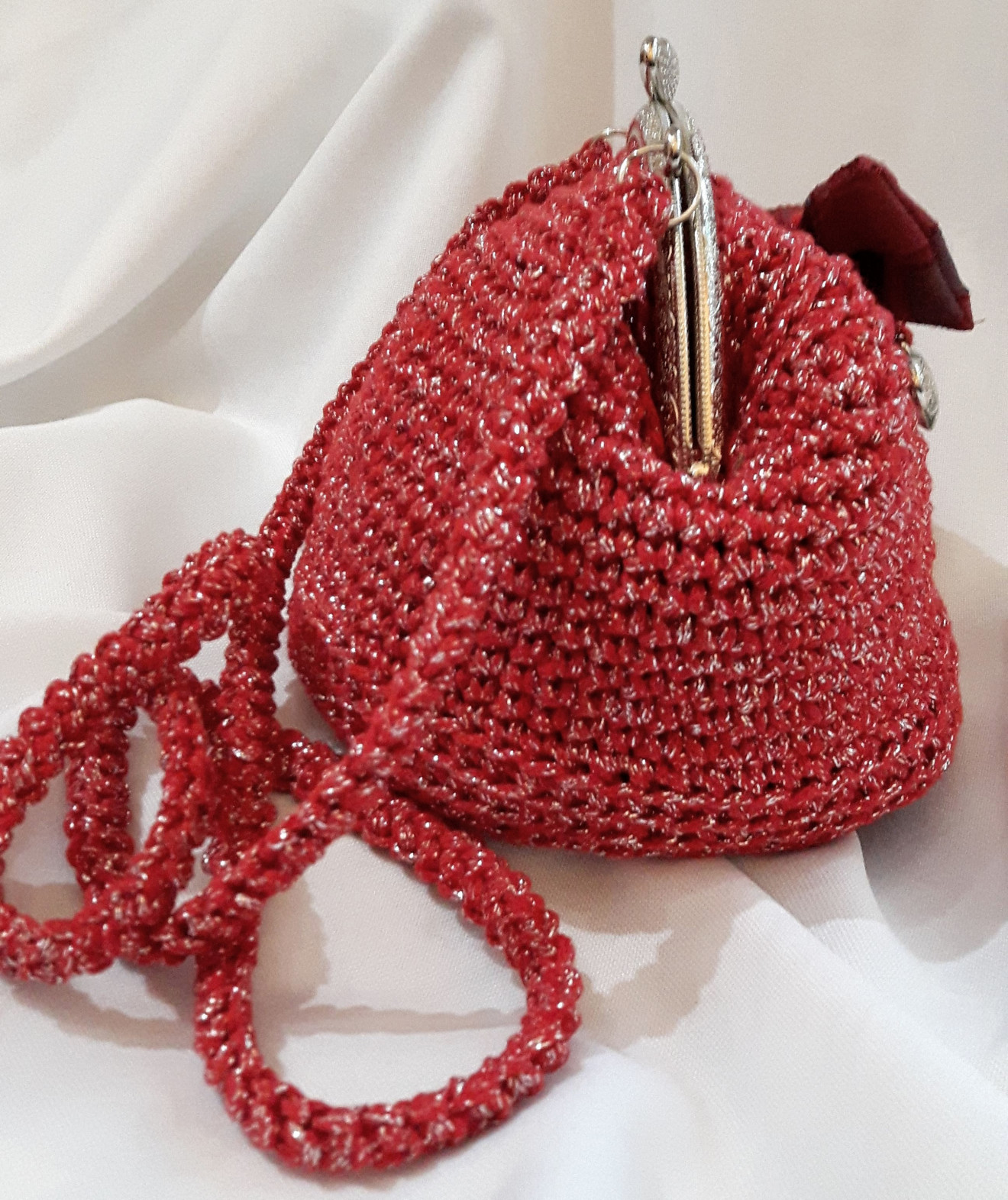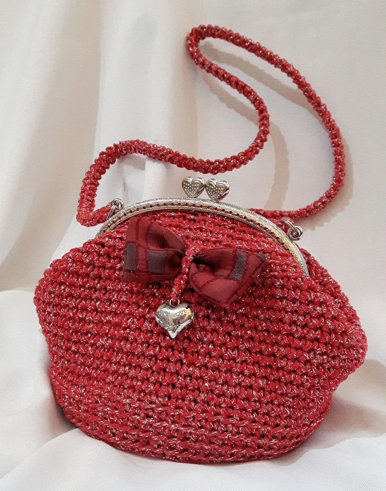 Изплетена на една кука от нишка с кръгло сечение Macrame cotton (15% памук, 15% полиестер, 10% ламе). Закопчалка - сребрист обков, плетена дръжка 114см, подплата - копринен плат, декорация - панделка от същия плат и сребристо сърчице.