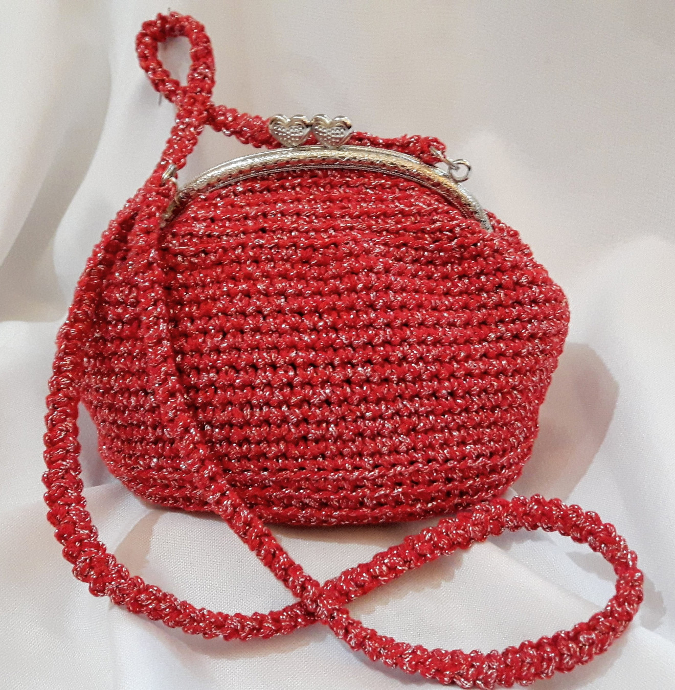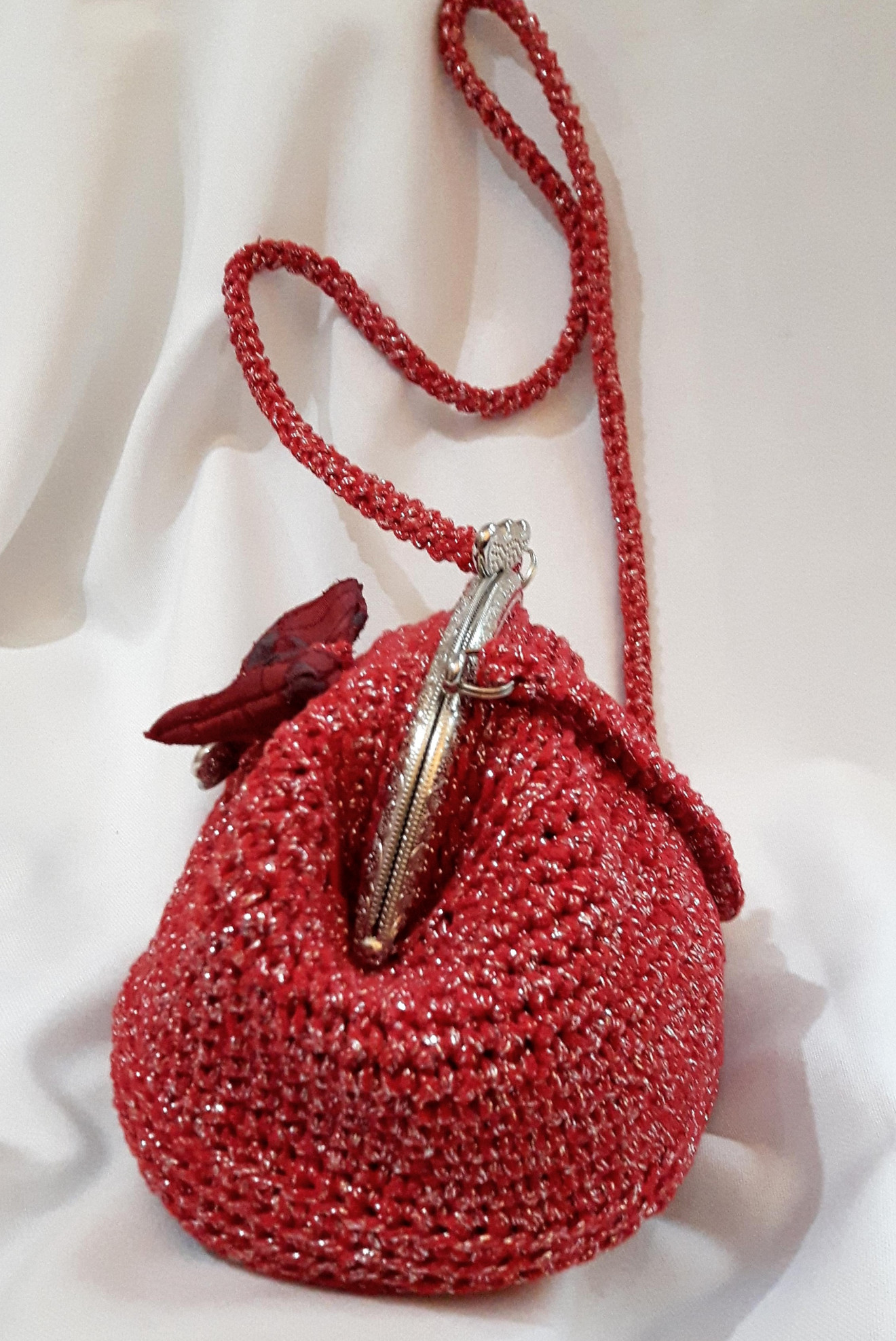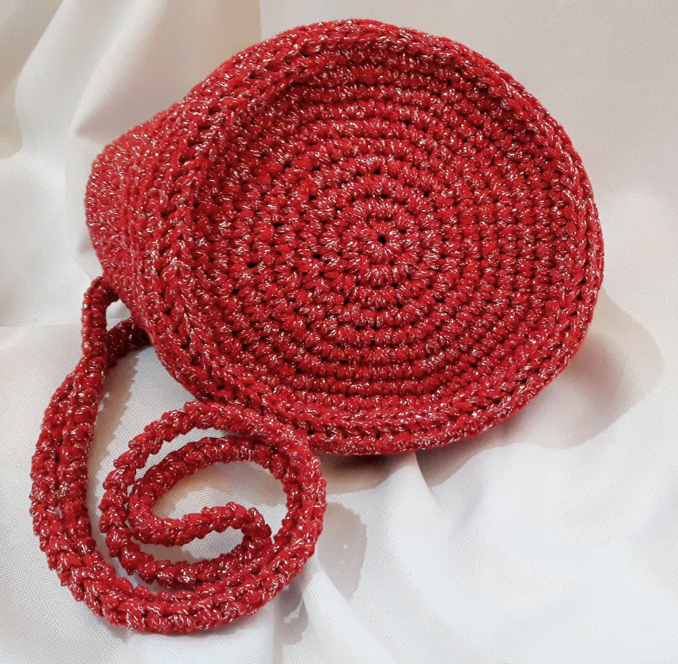Изплетена на една кука от нишка с кръгло сечение Macrame cotton (15% памук, 15% полиестер, 10% ламе). Закопчалка - сребрист обков, плетена дръжка 114см, подплата - копринен плат, декорация - панделка от същия плат и сребристо сърчице.
